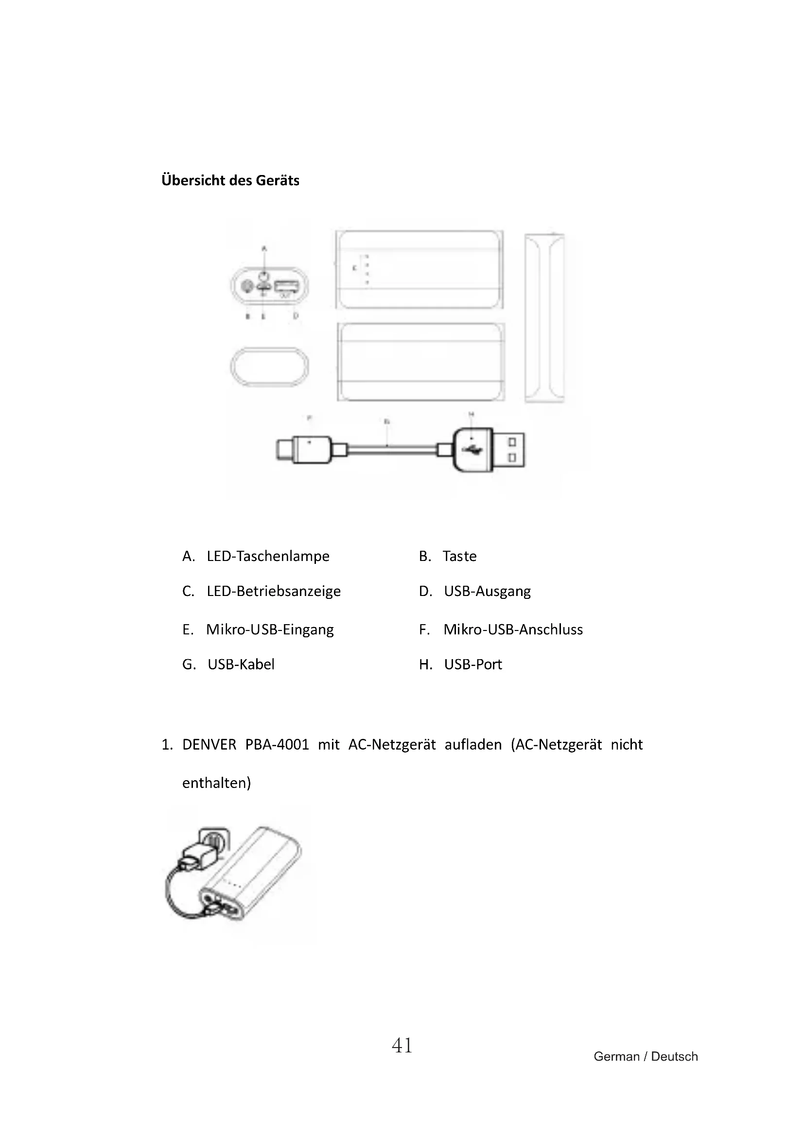 DENVER PBA-4001 aufladen (Abbildung 1/Abbildung 2)