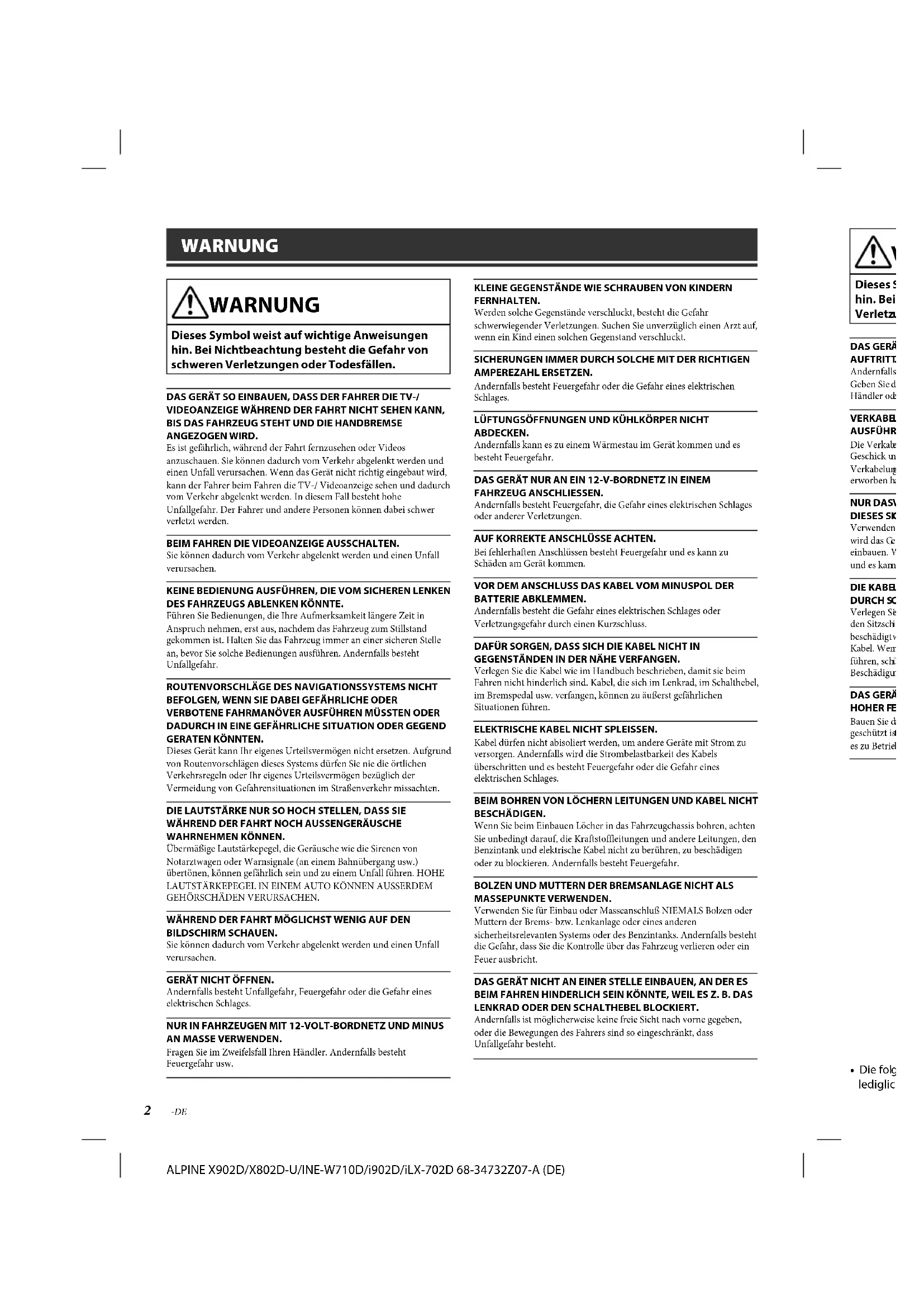 - Technische Daten ALPINE X902D/X802D-U/INE-W710D/i902D/iLX-702D 68-34732Z07-A (DE) 2-DE WARNUNG WARNUNG Dieses Symbol weist auf wichtige Anweisungen hin. Bei Nichtbeachtung besteht die Gefahr von schweren Verletzungen oder Todesfällen. DAS GERÄT SO EINBAUEN, DASS DER FAHRER DIE TV-/VIDEOANZEIGE WÄHREND DER FAHRT NICHT SEHEN KANN, BIS DAS FAHRZEUG STEHT UND DIE HANDBREMSE ANGEZOGEN WIRD.Es ist gefährlich, während der Fahrt fernzusehen oder Videos anzuschauen. Sie können dadurch vom Verkehr abgelenkt werden und einen Unfall verursachen. Wenn das Gerät nicht richtig eingebaut wird, kann der Fahrer beim Fahren die TV-/ Videoanzeige sehen und dadurch vom Verkehr abgelenkt werden. In diesem Fall besteht hohe Unfallgefahr. Der Fahrer und andere Personen können dabei schwer verletzt werden.BEIM FAHREN DIE VIDEOANZEIGE AUSSCHALTEN.Sie können dadurch vom Verkehr abgelenkt werden und einen Unfall verursachen.KEINE BEDIENUNG AUSFÜHREN, DIE VOM SICHEREN LENKEN DES FAHRZEUGS ABLENKEN KÖNNTE.Führen Sie Bedienungen, die Ihre Aufmerksamkeit längere Zeit in Anspruch nehmen, erst aus, nachdem das Fahrzeug zum Stillstand gekommen ist. Halten Sie das Fahrzeug immer an einer sicheren Stelle an, bevor Sie solche Bedienungen ausführen. Andernfalls besteht Unfallgefahr.ROUTENVORSCHLÄGE DES NAVIGATIONSSYSTEMS NICHT BEFOLGEN, WENN SIE DABEI GEFÄHRLICHE ODER VERBOTENE FAHRMANÖVER AUSFÜHREN MÜSSTEN ODER DADURCH IN EINE GEFÄHRLICHE SITUATION ODER GEGEND GERATEN KÖNNTEN.Dieses Gerät kann Ihr eigenes Urteilsvermögen nicht ersetzen. Aufgrund von Routenvorschlägen dieses Systems dürfen Sie nie die örtlichen Verkehrsregeln oder Ihr eigenes Urteilsvermögen bezüglich der Vermeidung von Gefahrensituationen im Straßenverkehr missachten.DIE LAUTSTÄRKE NUR SO HOCH STELLEN, DASS SIE WÄHREND DER FAHRT NOCH AUSSENGERÄUSCHE WAHRNEHMEN KÖNNEN.Übermäßige Lautstärkepegel, die Geräusche wie die Sirenen von Notarztwagen oder Warnsignale (an einem Bahnübergang usw.) übertönen, können gefährlich sein und zu einem Unfall führen. HOHE LAUTSTÄRKEPEGEL IN EINEM AUTO KÖNNEN AUSSERDEM GEHÖRSCHÄDEN VERURSACHEN.WÄHREND DER FAHRT MÖGLICHST WENIG AUF DEN BILDSCHIRM SCHAUEN.Sie können dadurch vom Verkehr abgelenkt werden und einen Unfall verursachen.GERÄT NICHT ÖFFNEN.Andernfalls besteht Unfallgefahr, Feuergefahr oder die Gefahr eines elektrischen Schlages.NUR IN FAHRZEUGEN MIT 12-VOLT-BORDNETZ UND MINUS AN MASSE VERWENDEN.Fragen Sie im Zweifelsfall Ihren Händler. Andernfalls besteht Feuergefahr usw.KLEINE GEGENSTÄNDE WIE SCHRAUBEN VON KINDERN FERNHALTEN.Werden solche Gegenstände verschluckt, besteht die Gefahr schwerwiegender Verletzungen. Suchen Sie unverzüglich einen Arzt auf, wenn ein Kind einen solchen Gegenstand verschluckt.SICHERUNGEN IMMER DURCH SOLCHE MIT DER RICHTIGEN AMPEREZAHL ERSETZEN.Andernfalls besteht Feuergefahr oder die Gefahr eines elektrischen Schlages.LÜFTUNGSÖFFNUNGEN UND KÜHLKÖRPER NICHT ABDECKEN.Andernfalls kann es zu einem Wärmestau im Gerät kommen und es besteht Feuergefahr.DAS GERÄT NUR AN EIN 12-V-BORDNETZ IN EINEM FAHRZEUG ANSCHLIESSEN.Andernfalls besteht Feuergefahr, die Gefahr eines elektrischen Schlages oder anderer Verletzungen.AUF KORREKTE ANSCHLÜSSE ACHTEN.Bei fehlerhaften Anschlüssen besteht Feuergefahr und es kann zu Schäden am Gerät kommen.VOR DEM ANSCHLUSS DAS KABEL VOM MINUSPOL DER BATTERIE ABKLEMMEN.Andernfalls besteht die Gefahr eines elektrischen Schlages oder Verletzungsgefahr durch einen Kurzschluss.DAFÜR SORGEN, DASS SICH DIE KABEL NICHT IN GEGENSTÄNDEN IN DER NÄHE VERFANGEN.Verlegen Sie die Kabel wie im Handbuch beschrieben, damit sie beim Fahren nicht hinderlich sind. Kabel, die sich im Lenkrad, im Schalthebel, im Bremspedal usw. verfangen, können zu äußerst gefährlichen Situationen führen.ELEKTRISCHE KABEL NICHT SPLEISSEN.Kabel dürfen nicht abisoliert werden, um andere Geräte mit Strom zu versorgen. Andernfalls wird die Strombelastbarkeit des Kabels überschritten und es besteht Feuergefahr oder die Gefahr eines elektrischen Schlages.BEIM BOHREN VON LÖCHERN LEITUNGEN UND KABEL NICHT BESCHÄDIGEN.Wenn Sie beim Einbauen Löcher in das Fahrzeugchassis bohren, achten Sie unbedingt darauf, die Kraftstoffleitungen und andere Leitungen, den Benzintank und elektrische Kabel nicht zu berühren, zu beschädigen oder zu blockieren. Andernfalls besteht Feuergefahr.BOLZEN UND MUTTERN DER BREMSANLAGE NICHT ALS MASSEPUNKTE VERWENDEN.Verwenden Sie für Einbau oder Masseanschluß NIEMALS Bolzen oder Muttern der Brems- bzw. Lenkanlage oder eines anderen sicherheitsrelevanten Systems oder des Benzintanks. Andernfalls besteht die Gefahr, dass Sie die Kontrolle über das Fahrzeug verlieren oder ein Feuer ausbricht.DAS GERÄT NICHT AN EINER STELLE EINBAUEN, AN DER ES BEIM FAHREN HINDERLICH SEIN KÖNNTE, WEIL ES Z. B. DAS LENKRAD ODER DEN SCHALTHEBEL BLOCKIERT.Andernfalls ist möglicherweise keine freie Sicht nach vorne gegeben, oder die Bewegungen des Fahrers sind so eingeschränkt, dass Unfallgefahr besteht. p. 17
