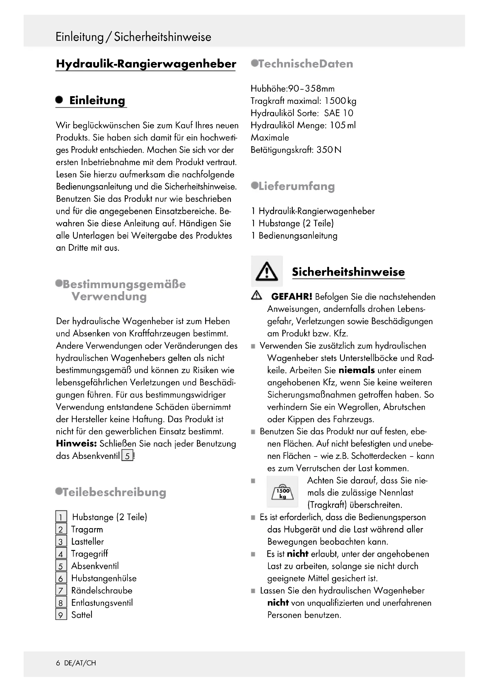 Achten Sie darauf, dass Sie nie- mals die zulässige Nennlast (Tragkraft) überschreiten. Es ist erforderlich, dass die Bedienungsperson das Hubgerät und die Last während aller Bewegungen beobachten kann. Es ist nicht erlaubt, unter der angehobenen Last zu arbeiten, solange sie nicht durch geeignete Mittel gesichert ist. Lassen Sie den hydraulischen Wagenheber nicht von unqualifizierten und unerfahrenen Personen benutzen.7 DE/AT/CH Sicherheitshinweise / Vor der InbetriebnahmeEinleitung / Sicherheitshinweise Sichern Sie das Kfz vor der Benutzung des hydraulischen Wagenhebers gegen Weg- rollen. Ziehen Sie die Handbremse an, legen Sie einen Gang ein (bei Automatik „P“) und sichern Sie das Kfz mittels Radkeilen. Seien Sie trotz Sicherungsmaßnahmen stets aufmerksam und beobachten Sie während der gesamten Arbeit am Kfz, ob der Lastteller