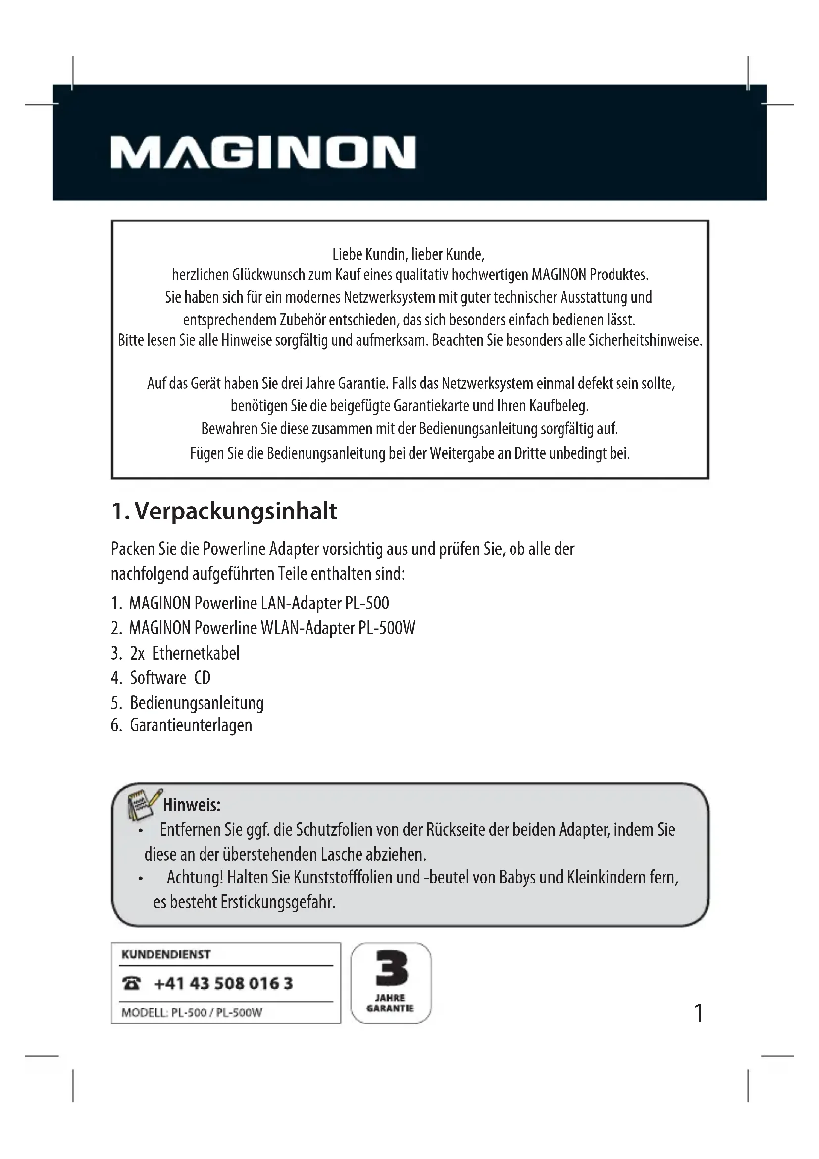 Liebe Kundin, lieber Kunde, herzlichen Glückwunsch zum Kauf eines qualitativ hochwertigen MAGINON Produktes. Sie haben sich für ein modernes Netzwerksystem mit guter technischer Ausstattung und entsprechendem Zubehör entschieden, das sich besonders einfach bedienen lässt. Bitte lesen Sie alle Hinweise sorgfältig und aufmerksam. Beachten Sie besonders alle Sicherheitshinweise. Auf das Gerät haben Sie drei Jahre Garantie. Falls das Netzwerksystem einmal defekt sein sollte, benötigen Sie die beigefügte Garantiekarte und Ihren Kaufbeleg. Bewahren Sie diese zusammen mit der Bedienungsanleitung sorgfältig auf. Fügen Sie die Bedienungsanleitung bei der Weitergabe an Dritte unbedingt bei.