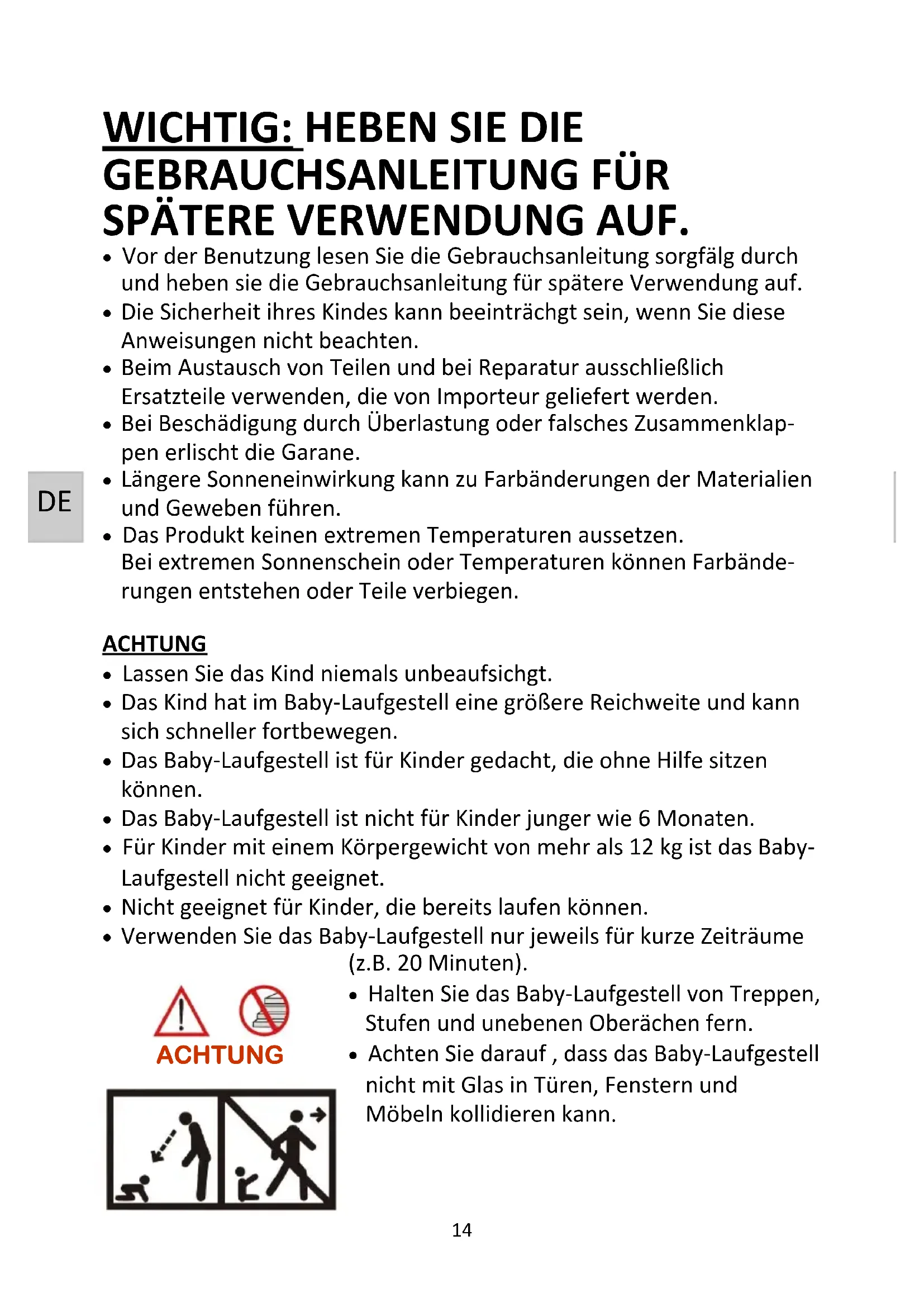 - Verwenden Sie das Baby-Laufgestell nur jeweils für kurze Zeiträume (z.B. 20 Minuten).