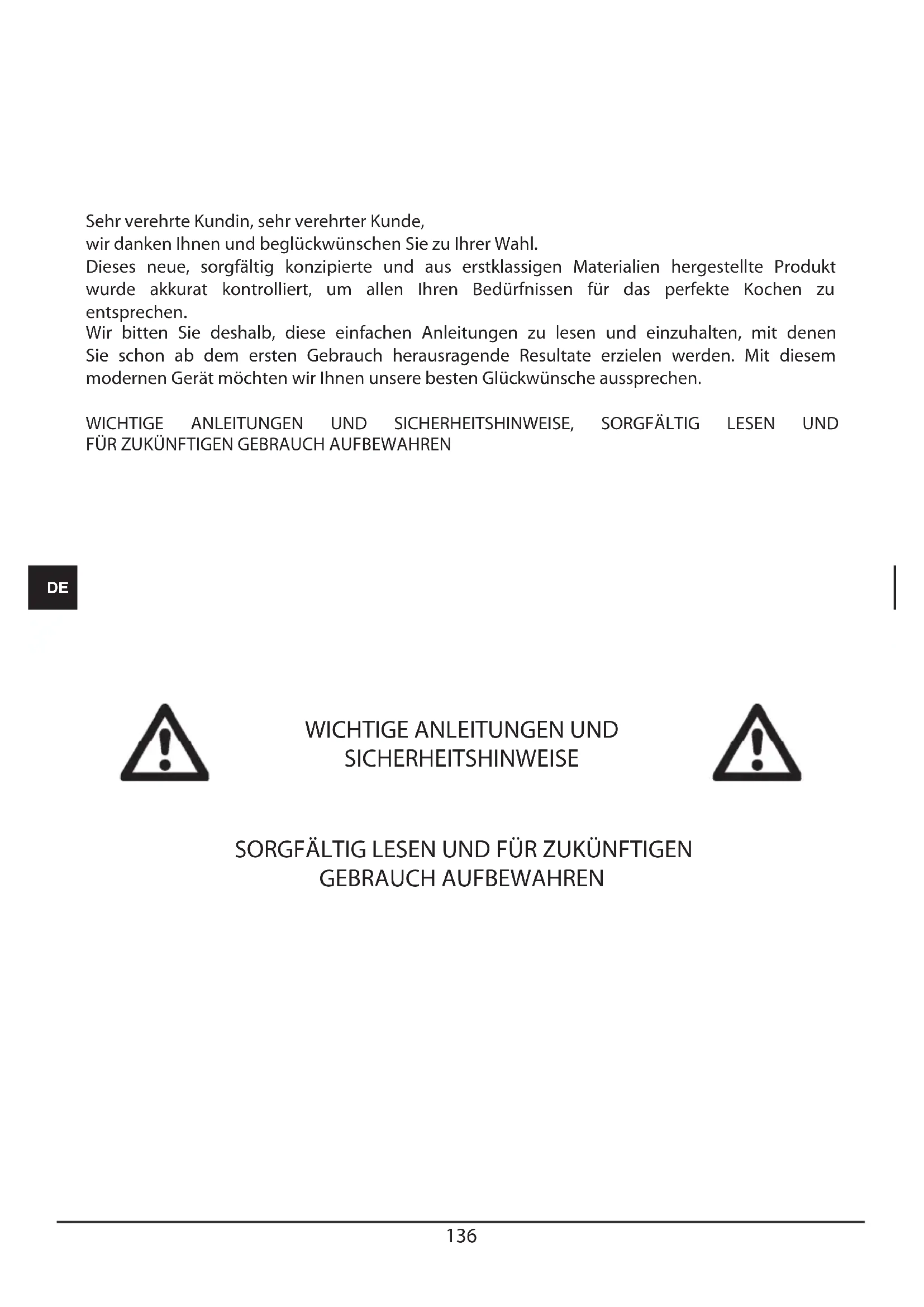 Sehr verehrte Kundin, sehr verehrter Kunde, wir danken Ihnen und beglückwünschen Sie zu Ihrer Wahl. Dieses neue, sorgfältig konzipierte und aus erstklassigen Materialien hergestellte Produkt wurde akkurat kontrolliert, um allen Ihren Bedürfnissen für das perfekte Kochen zu entsprechen. Wir bitten Sie deshalb, diese einfachen Anleitungen zu lesen und einzuhalten, mit denen Sie schon ab dem ersten Gebrauch herausragende Resultate erzielen werden. Mit diesem modernen Gerät möchten wir Ihnen unsere besten Glückwünsche aussprechen. WICHTIGE ANLEITUNGEN UND SICHERHEITSHINWEISE, SORGFÄLTIG LESEN UND