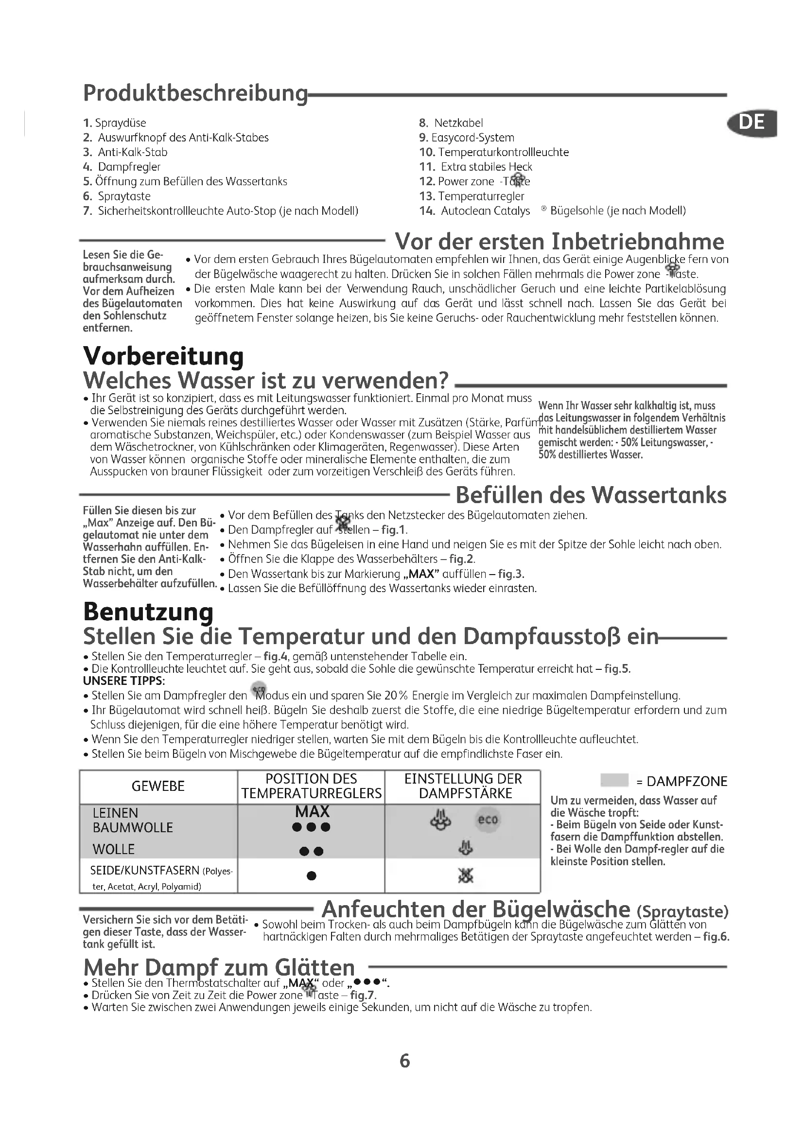 - Drücken Sie von Zeit zu Zeit die Power zone -Taste – fig.7.• Warten Sie zwischen zwei Anwendungen jeweils einige Sekunden, um nicht auf die Wäsche zu tropfen.Lesen Sie die Ge-brauchsanweisungaufmerksam durch.Vor dem Aufheizendes Bügelautomatenden Sohlenschutzentfernen.Füllen Sie diesen bis zur„Max” Anzeige auf. Den Bü-gelautomat nie unter demWasserhahn auffüllen. En-tfernen Sie den Anti-Kalk-Stab nicht, um denWasserbehälter aufzufüllen.Wenn Ihr Wasser sehr kalkhaltig ist, mussdas Leitungswasser in folgendem Verhältnismit handelsüblichem destilliertem Wassergemischt werden: - 50% Leitungswasser, -50% destilliertes Wasser.= DAMPFZONEUm zu vermeiden, dass Wasser aufdie Wäsche tropft:- Beim Bügeln von Seide oder Kunst-fasern die Dampffunktion abstellen.- Bei Wolle den Dampf-regler auf diekleinste Position stellen.GEWEBEPOSITION DESTEMPERATURREGLERSEINSTELLUNG DERDAMPFSTÄRKELEINENBAUMWOLLEWOLLESEIDE/KUNSTFASERN (Polyes-ter, Acetat, Acryl, Polyamid) MAX