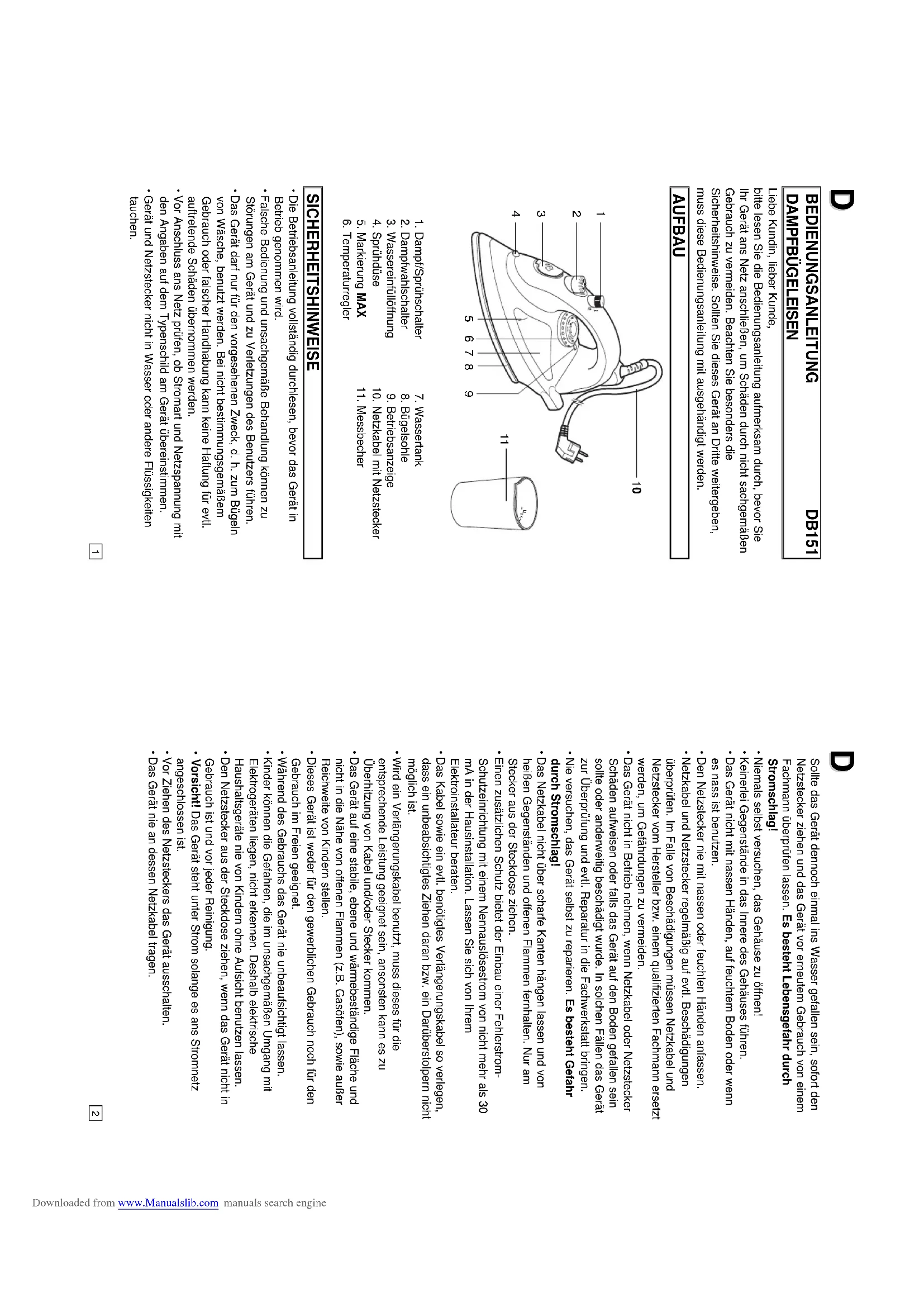 ИНСТРУКЦИИ ЗА ЕКСПЛОАТАЦИЯ ИНСТРУКЦИЯ ПО ЭКСПЛУАТАЦИИ Downloaded from www.Manualslib.com manuals search engineBEDIENUNGSANLEITUNG DB151 DAMPFBÜGELEISEN Liebe Kundin, lieber Kunde, bitte lesen Sie die Bedienungsanleitung aufmerksam durch, bevor Sie Ihr Gerät ans Netz anschließen, um Schäden durch nicht sachgemäßen Gebrauch zu vermeiden. Beachten Sie besonders die Sicherheitshinweise. Sollten Sie dieses Gerät an Dritte weitergeben, muss diese Bedienungsanleitung mit ausgehändigt werden. AUFBAU SICHERHEITSHINWEISE