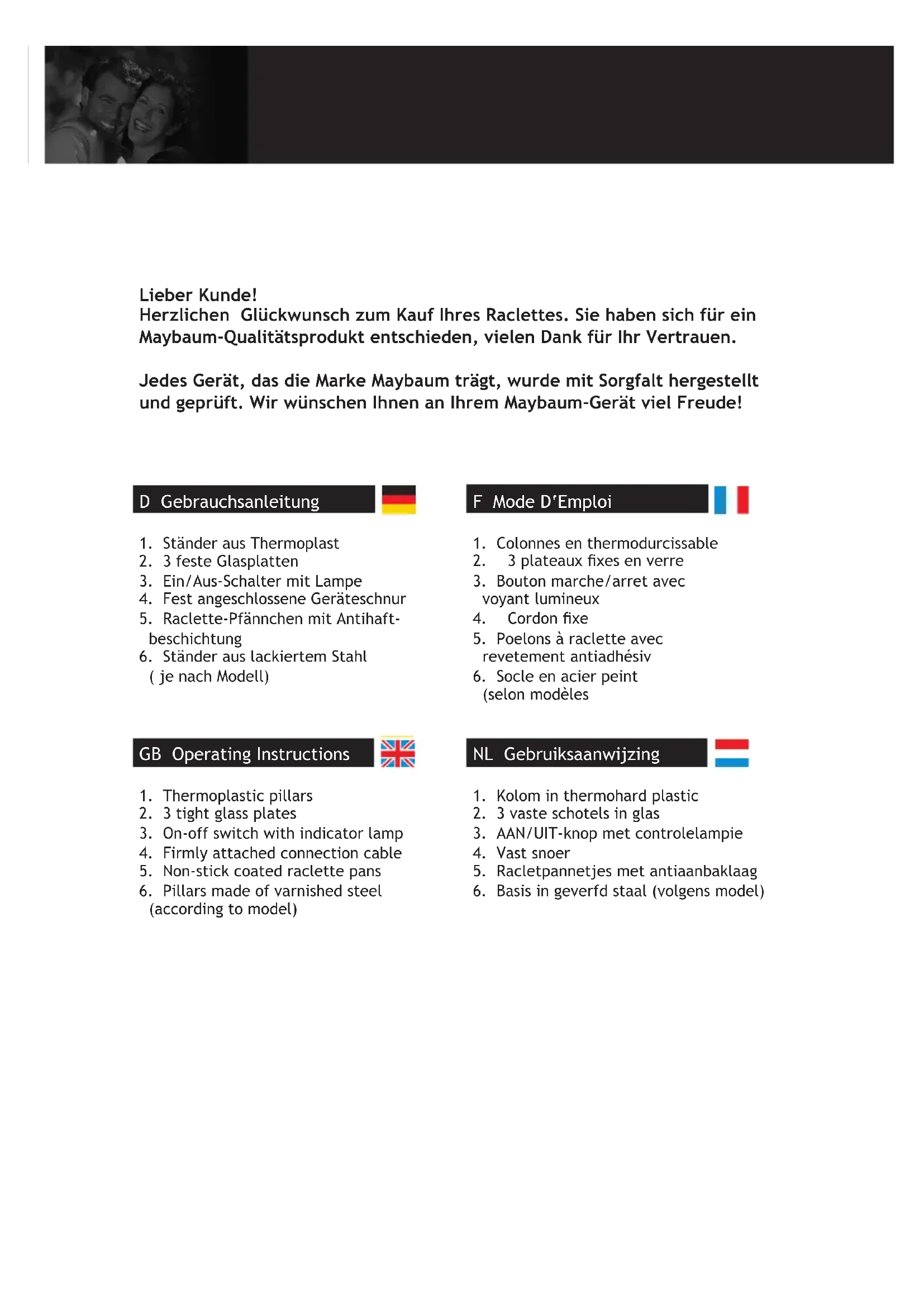 Herzlichen Glückwunsch zum Kauf Ihres Raclettes. Sie haben sich für ein Maybaum-Qualitätsprodukt entschieden, vielen Dank für Ihr Vertrauen.