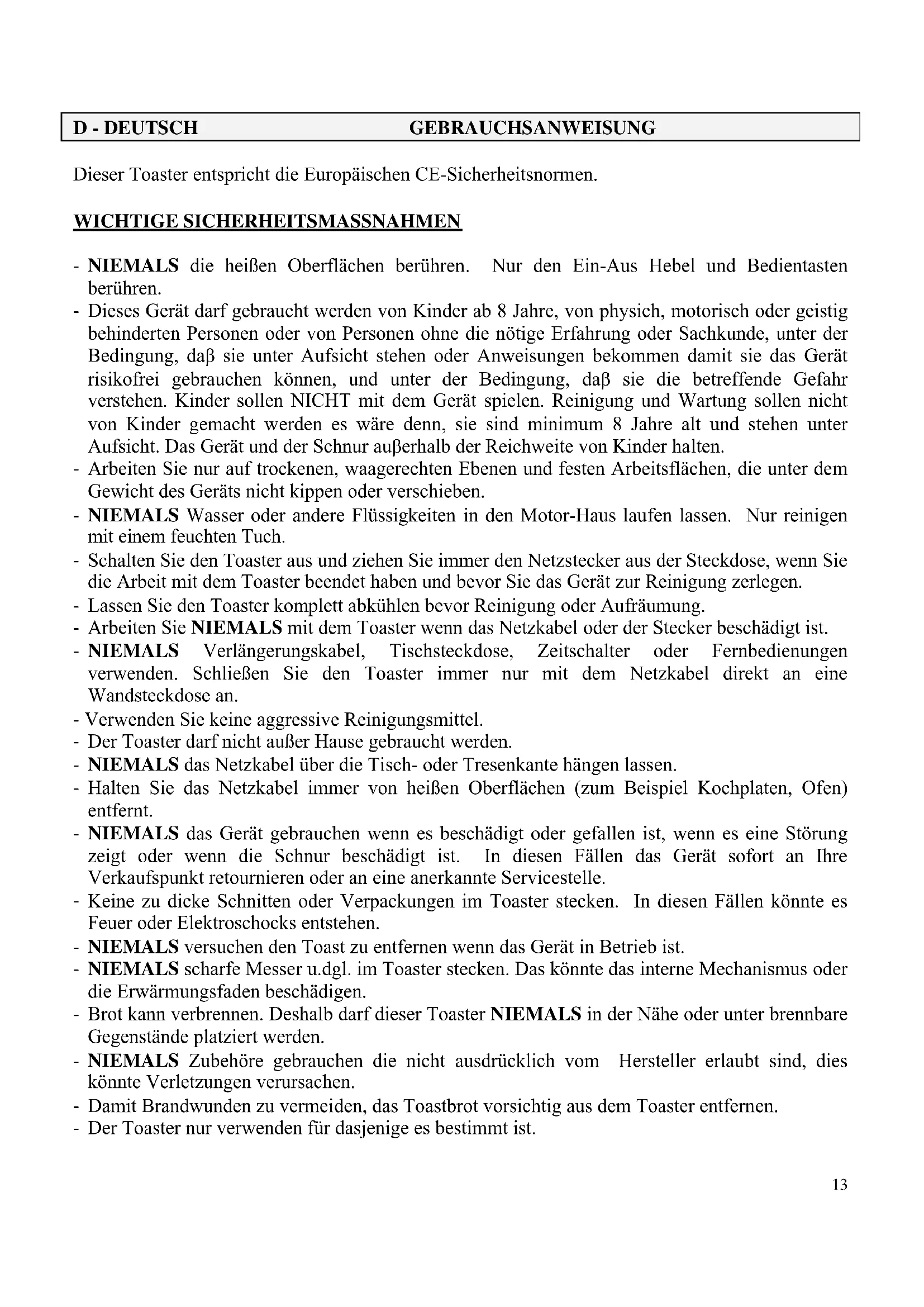 Dieser Toaster entspricht die Europäischen CE-Sicherheitsnormen.
