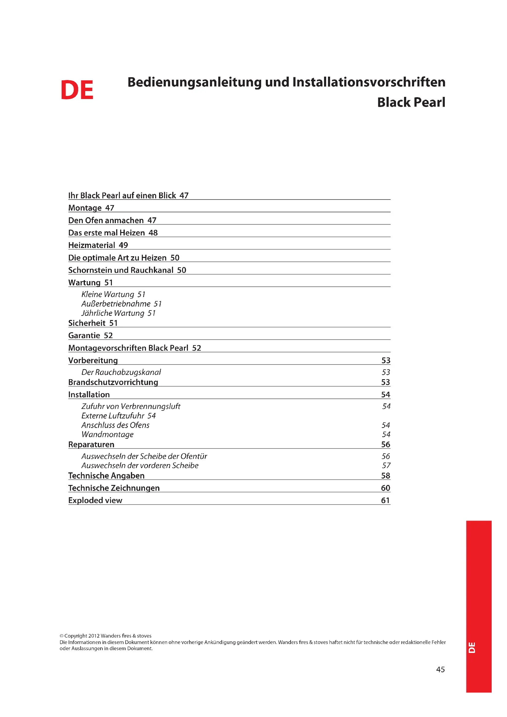 © Copyright 2012 Wanders res & stoves Die Informationen in diesem Dokument können ohne vorherige Ankündigung geändert werden. Wanders res & stoves haftet nicht für technische oder redaktionelle Fehler oder Auslassungen in diesem Dokument. Ihr Black Pearl auf einen Blick 47 Montage 47 Den Ofen anmachen 47 Das erste mal Heizen 48 Heizmaterial 49 Die optimale Art zu Heizen 50 Schornstein und Rauchkanal 50 Wartung 51 Kleine Wartung 51 Außerbetriebnahme 51 Jährliche Wartung 51 Sicherheit 51 Garantie 52 Montagevorschriften Black Pearl 52 Vorbereitung 53 Der Rauchabzugskanal 53 Brandschutzvorrichtung 53 Installation 54 Zufuhr von Verbrennungsluft 54 Externe Luftzufuhr 54 Anschluss des Ofens 54 Wandmontage 54 Reparaturen 56 Auswechseln der Scheibe der Ofentür 56 Auswechseln der vorderen Scheibe 57 Technische Angaben 58 Technische Zeichnungen 60 Exploded view 6146 Sehr geehrter Kunde, Herzlichen Glückwunsch zum Kauf Ihres Holzofens, der eine komfortable Wärmequelle ist die Ihnen jahrelang Freue machen wird. Dank seiner einzigartigen Form, ist der Black Pearl von überall im Zimmer zu sehen. Bei der Entwicklung dieses Holzofens haben wir besonders auf Gebrauchsfreundlichkeit, Betriebssicherheit und Design geachtet. Der Black Pearl ist in unserer eigenen Fabrik in Netterden entwickelt, hergestellt und großenteils handgemacht. Bei der Produktion wurden nur die besten Materiale, die den europäischen Normen entsprechen, eingesetzt. Damit gewährleisten wir eine lange Lebensdauer dieses Holzofens. Im ersten Teil dieser Gebrauchsanweisung geben wir Ihnen Tipps und Hinweise für die richtige und sichere Art Ihren Holzofen zu benützen. Im zweiten Teil benden sich die Installationsvorschriften sowie auch die technischen Angaben dieses Black Pearl Ofens. Diese sind vor Allem für den Installateur wichtig. Vor Gebrauch Ihres Holzofens bitten wir Sie die Gebrauchsanweisung sorgfältig zu lesen und sie dann gut zu bewahren. Ihr Installateur braucht vielleicht diese Anleitung für die jährliche Wartung Ihres Ofens. Wir wünschen Ihnen viel Wärme mit Ihrem Kauf. Das WANDERS Team