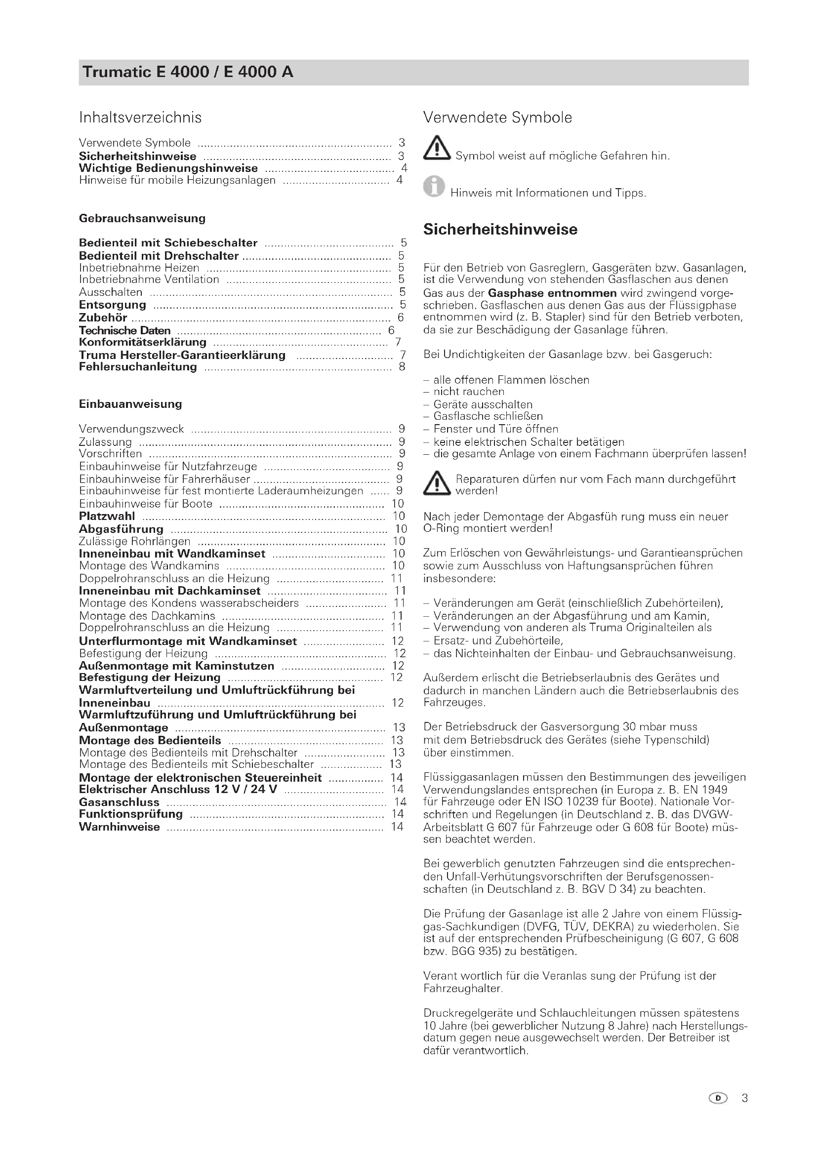 - Warning information Trumatic E 4000 / E 4000 A Safety instructions The use of upright gas cylinders from which gas is taken in the gas phase is mandatory for the operation of gas regula- tors, gas equipment and gas systems. Gas cylinders from which gas is taken in the liquid phase (e.g. for fork lifts) must not be used, since they would result in damage to the gas system. If the gas system is leaking or if there is a smell of gas: extinguish all naked flames do not smoke switch off the appliances shut off the gas cylinder open windows and door do not actuate any electrical switches have the entire system checked by an expert! Repairs may only be carried out by an expert! A new O-ring must always be installed after dismantling the exhaust duct! Guarantee claims, warranty claims and acceptance of liability will be ruled out in the event of the following: modifications to the unit (including accessories), modifications to the exhaust duct and the cowl, failure to use original Truma parts as replacement parts and accessories, failure to follow the installation and operating instructions. It also becomes illegal to use the appliance, and in some countries this even makes it illegal to use the vehicle. The gas supply’s operating pressure (30 mbar) must be the same as the unit’s operating pressure (see type plate). Liquid gas systems must comply with the legal provisions of the country in which they are put to use (e.g. for Europe EN 1949 for vehicles and EN ISO 10239 for boats). National directives and regulations (e.g. DVGW worksheet G 607 for vehicles and G 608 for boats in Germany) must be complied with. In the case of vehicles used for commercial purposes, the respective accident prevention regulations issued by the pro- fessional associations are to be adhered to (e.g. for Germany BGV D 34). The inspection of the gas system is to be repeated every two years by am approved liquid gas specialist (DVFG, TÜV, DEKRA). This is to be confirmed on the corresponding inspec- tion certificate (G 607, G 608, or BGG 935). The vehicle owner is always responsible for arranging the inspection. Pressure regulating devices and hoses must be replaced with new ones no more than 10 years after their date of manufac- ture (every 8 years if used commercially). This is the responsi- bility of the operator. Liquid gas equipment must not be used when refuelling, in multi-storey car parks, in garages or on ferries. During the initial operation of a brand new appliance (or after it has not been used for some time), a slight amount of fumes and smell may be noticed for a short while. This can be rem- edied by running the heater at maximum output and ensuring adequate room ventilation. If the burner makes an unusual noise or if the flame lifts off, it is likely that the regulator is faulty and it is essential to have it checked. p. 26