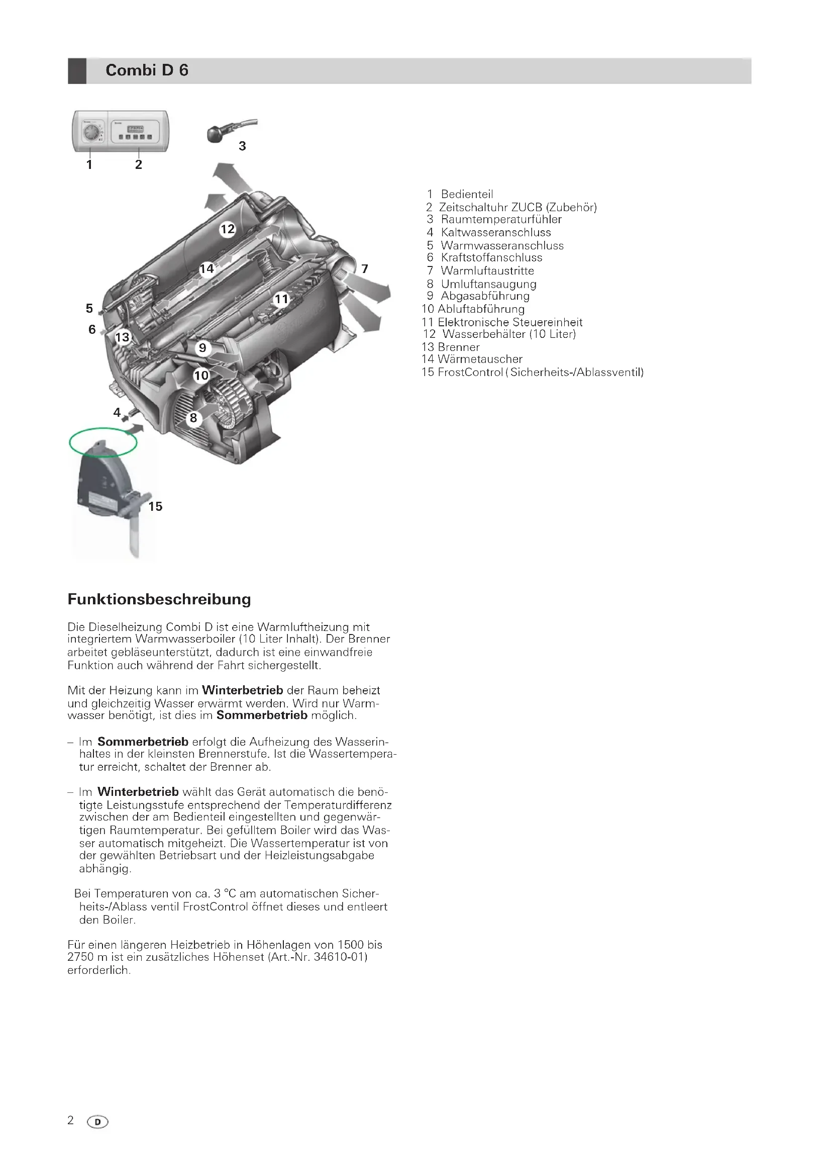 Combi D 6 Gebrauchsanweisung Seite 2 Im Fahrzeug mitzuführen! Operating instructions Page 10 To be kept in the vehicle! Mode d‘emploi Page 18 À garder dans le véhicule ! Istruzioni per l‘uso Pagina 27 Da tenere nel veicolo! Gebruiksaanwijzing Pagina 35 In voertuig meenemen! Brugsanvisning Side 43 Skal medbringes i køretøjet! Instrucciones de uso Página 51 ¡Llévalas en el vehículo! Page 592 1 Bedienteil 2 Zeitschaltuhr ZUCB (Zubehör) 3 Raumtemperaturfühler 4 Kaltwasseranschluss 5 Warmwasseranschluss 6 Kraftstoffanschluss 7 Warmluftaustritte 8 Umluftansaugung 9 Abgasabführung 10 Abluftabführung 11 Elektronische Steuereinheit 12 Wasserbehälter (10 Liter) 13 Brenner 14 Wärmetauscher 15 FrostControl ( Sicherheits-/Ablassventil)