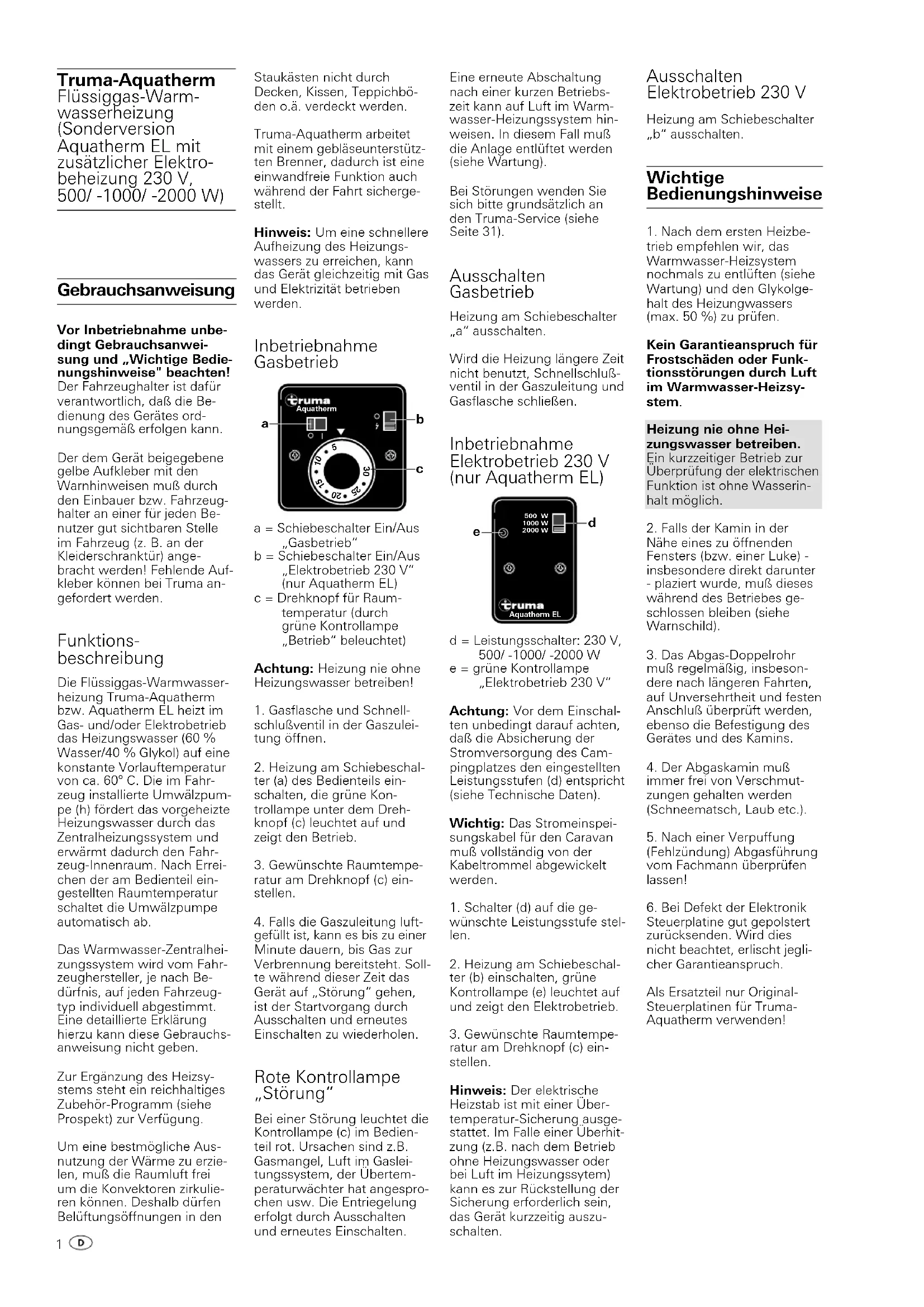 Aquatherm Aquatherm EL Truma Gerätetechnik GmbH & Co Postfach 1252 D-85637 Putzbrunn Service Telefon +49 (0) 89 46 17-142 Telefax +49 (0) 89 46 17-159 e-mail: info@truma.com http://www.truma.com Gebrauchs- anweisung Im Fahrzeug mitzuführen! Seite 1 Operating instructions To be kept in the vehicle! Page 4 Mode d’emploi À garder dans le véhicule! Page 7 Istruzioni per l’uso Da tenere nel veicolo! Pagina 10 Gebruiksaanwijzing Moet in uw voertuig mee- genomen worden! Pagina 13 Monterings- anvisning Skal medbringes i køretøjet! Side 16 Bruksanvisning Skall medföras i fordonet! Sida 22 Käyttöohje Säilytä autossa! Sivu 25 Bruksanvisning Oppbevares i bilen! Side 28 Instrucciones de uso ¡Ilévalas en el vehículo! Página 191 Vor Inbetriebnahme unbe- dingt Gebrauchsanwei- sung und „Wichtige Bedie- nungshinweise" beachten! Der Fahrzeughalter ist dafür verantwortlich, daß die Be- dienung des Gerätes ord- nungsgemäß erfolgen kann. Der dem Gerät beigegebene gelbe Aufkleber mit den Warnhinweisen muß durch den Einbauer bzw. Fahrzeug- halter an einer für jeden Be- nutzer gut sichtbaren Stelle im Fahrzeug (z. B. an der Kleiderschranktür) ange- bracht werden! Fehlende Auf- kleber können bei Truma an- gefordert werden. Funktions- beschreibung Die Flüssiggas-Warmwasser- heizung Truma-Aquatherm bzw. Aquatherm EL heizt im Gas- und/oder Elektrobetrieb das Heizungswasser (60 % Wasser/40 % Glykol) auf eine konstante Vorlauftemperatur von ca. 60° C. Die im Fahr- zeug installierte Umwälzpum- pe (h) fördert das vorgeheizte Heizungswasser durch das Zentralheizungssystem und erwärmt dadurch den Fahr- zeug-Innenraum. Nach Errei- chen der am Bedienteil ein- gestellten Raumtemperatur schaltet die Umwälzpumpe automatisch ab. Das Warmwasser-Zentralhei- zungssystem wird vom Fahr- zeughersteller, je nach Be- dürfnis, auf jeden Fahrzeug- typ individuell abgestimmt. Eine detaillierte Erklärung hierzu kann diese Gebrauchs- anweisung nicht geben. Zur Ergänzung des Heizsy- stems steht ein reichhaltiges Zubehör-Programm (siehe Prospekt) zur Verfügung. Um eine bestmögliche Aus- nutzung der Wärme zu erzie- len, muß die Raumluft frei um die Konvektoren zirkulie- ren können. Deshalb dürfen Belüftungsöffnungen in den Staukästen nicht durch Decken, Kissen, Teppichbö- den o.ä. verdeckt werden. Truma-Aquatherm arbeitet mit einem gebläseunterstütz- ten Brenner, dadurch ist eine einwandfreie Funktion auch während der Fahrt sicherge- stellt. Hinweis: Um eine schnellere Aufheizung des Heizungs- wassers zu erreichen, kann das Gerät gleichzeitig mit Gas und Elektrizität betrieben werden. Inbetriebnahme Gasbetrieb a = Schiebeschalter Ein/Aus „Gasbetrieb“ b = Schiebeschalter Ein/Aus „Elektrobetrieb 230 V“ (nur Aquatherm EL) c = Drehknopf für Raum- temperatur (durch grüne Kontrollampe „Betrieb“ beleuchtet) Achtung: Heizung nie ohne Heizungswasser betreiben!