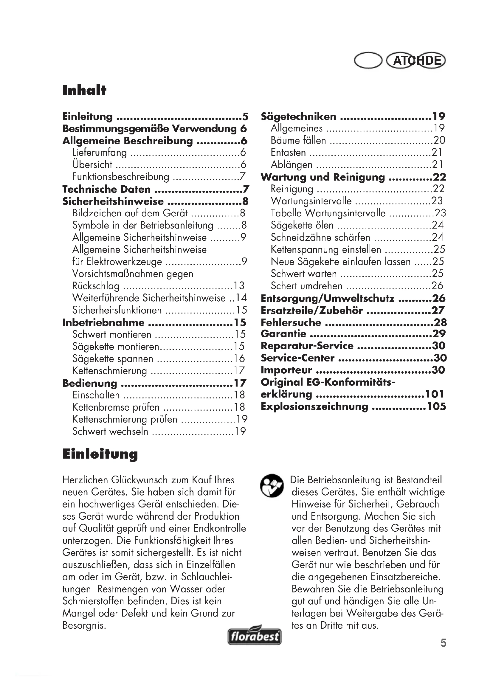 - AT CHDE Einleitung Herzlichen Glückwunsch zum Kauf Ihres neuen Gerätes. Sie haben sich damit für ein hochwertiges Gerät entschieden. Die- ses Gerät wurde während der Produktion auf Qualität geprüft und einer Endkontrolle unterzogen. Die Funktionsfähigkeit Ihres Gerätes ist somit sichergestellt. Es ist nicht auszuschließen, dass sich in Einzelfällen am oder im Gerät, bzw. in Schlauchlei- tungen Restmengen von Wasser oder Schmierstoffen benden. Dies ist kein Mangel oder Defekt und kein Grund zur Besorgnis. Inhalt Einleitung p. 5
