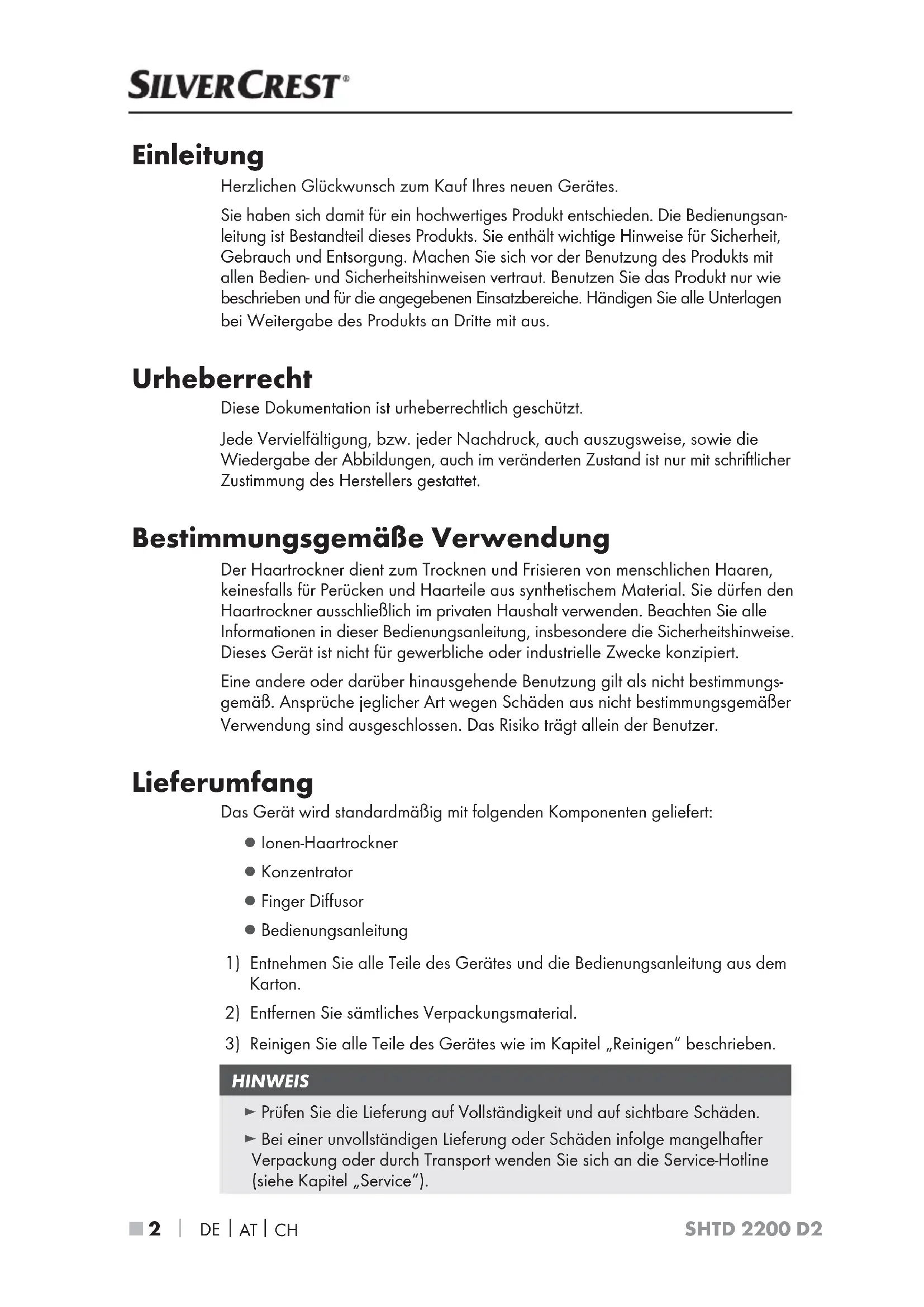 SHTD 2200 D2 Einleitung Herzlichen Glückwunsch zum Kauf Ihres neuen Gerätes. Sie haben sich damit für ein hochwertiges Produkt entschieden. Die Bedienungsan- leitung ist Bestandteil dieses Produkts. Sie enthält wichtige Hinweise für Sicherheit, Gebrauch und Entsorgung. Machen Sie sich vor der Benutzung des Produkts mit allen Bedien- und Sicherheitshinweisen vertraut. Benutzen Sie das Produkt nur wie beschrieben und für die angegebenen Einsatzbereiche. Händigen Sie alle Unterlagen bei Weitergabe des Produkts an Dritte mit aus. Urheberrecht Diese Dokumentation ist urheberrechtlich geschützt. Jede Vervielfältigung, bzw. jeder Nachdruck, auch auszugsweise, sowie die Wiedergabe der Abbildungen, auch im veränderten Zustand ist nur mit schriftlicher Zustimmung des Herstellers gestattet. Bestimmungsgemäße Verwendung Der Haartrockner dient zum Trocknen und Frisieren von menschlichen Haaren, keinesfalls für Perücken und Haarteile aus synthetischem Material. Sie dürfen den Haartrockner ausschließlich im privaten Haushalt verwenden. Beachten Sie alle Informationen in dieser Bedienungsanleitung, insbesondere die Sicherheitshinweise. Dieses Gerät ist nicht für gewerbliche oder industrielle Zwecke konzipiert. Eine andere oder darüber hinausgehende Benutzung gilt als nicht bestimmungs- gemäß. Ansprüche jeglicher Art wegen Schäden aus nicht bestimmungsgemäßer Verwendung sind ausgeschlossen. Das Risiko trägt allein der Benutzer. Lieferumfang Das Gerät wird standardmäßig mit folgenden Komponenten geliefert: ▯ Ionen-Haartrockner ▯ Konzentrator ▯ Finger Diffusor ▯ Bedienungsanleitung