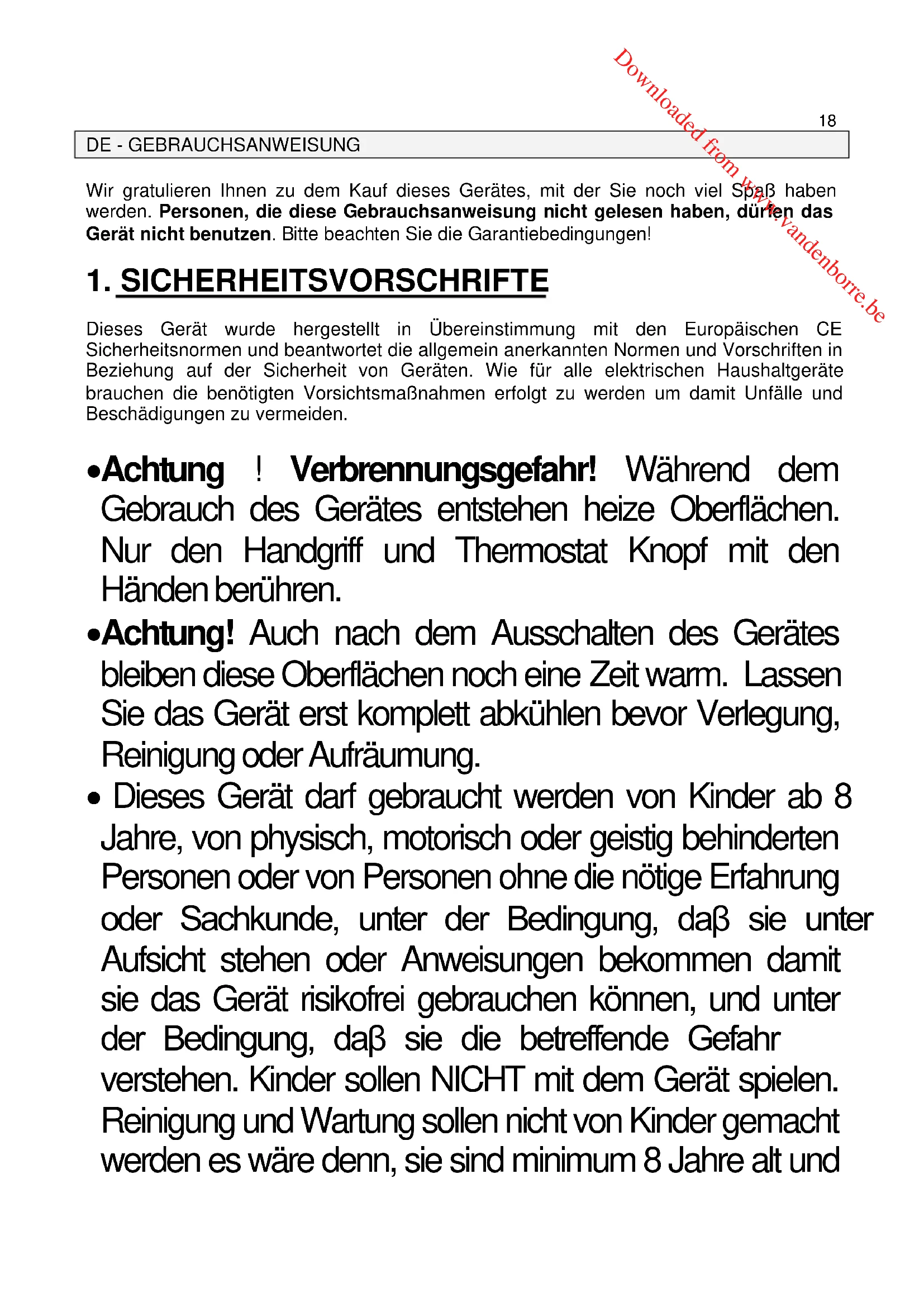 - Dieses Gerät darf gebraucht werden von Kinder ab 8 Jahre, von physisch, motorisch oder geistig behinderten Personen oder von Personen ohne die nötige Erfahrung oder Sachkunde, unter der Bedingung, daβ sie unter Aufsicht stehen oder Anweisungen bekommen damit sie das Gerät risikofrei gebrauchen können, und unter der Bedingung, daβ sie die betreffende Gefahr verstehen. Kinder sollen NICHT mit dem Gerät spielen. Reinigung und Wartung sollen nicht von Kinder gemacht werden es wäre denn, sie sind minimum 8 Jahre alt und Downloaded from www.vandenborre.be19 stehen unter Aufsicht. Das Gerät und der Schnur außerhalb der Reichweite von Kindern unter 8 Jahre halten.