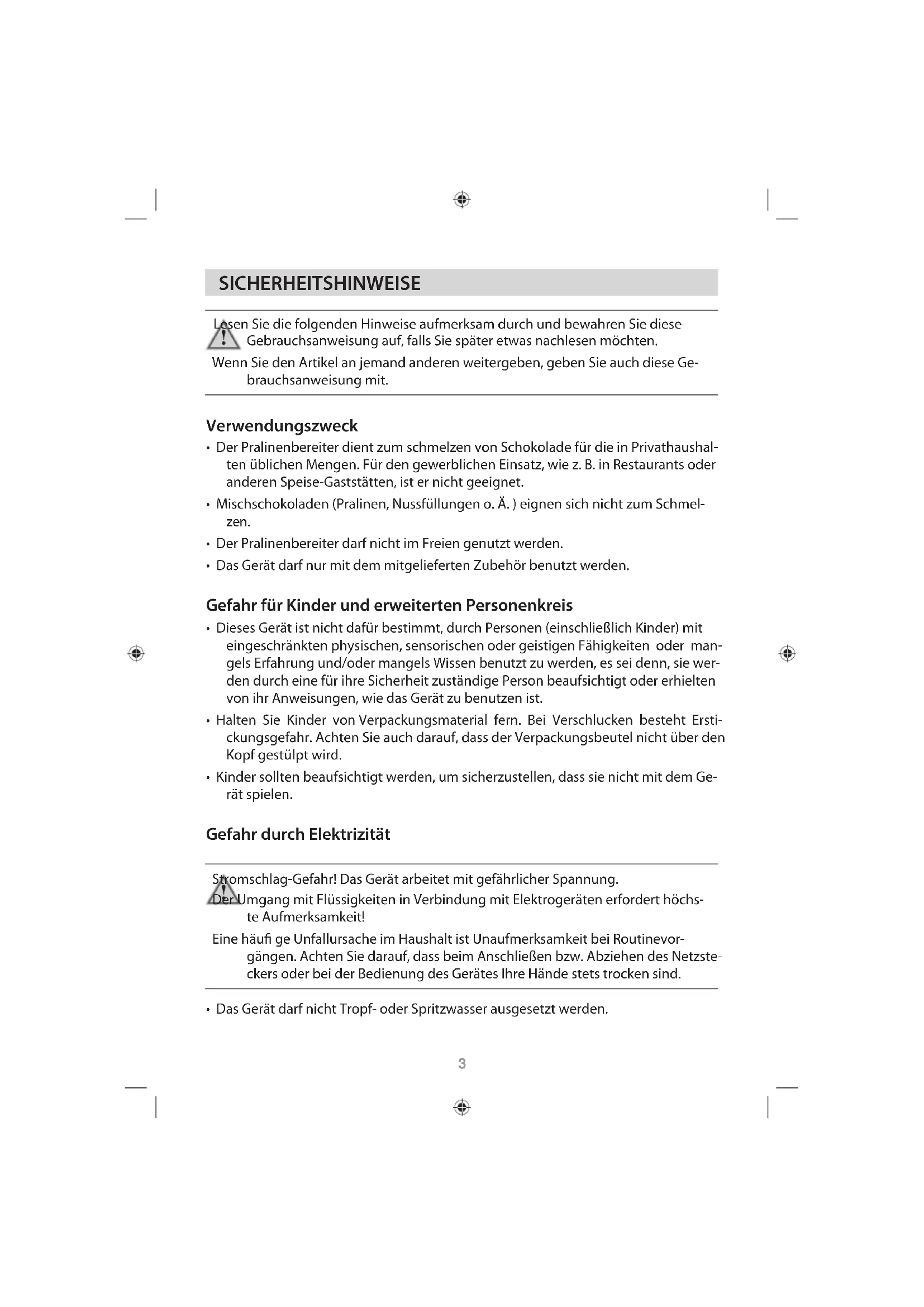 - Der Pralinenbereiter dient zum schmelzen von Schokolade für die in Privathaushal- ten üblichen Mengen. Für den gewerblichen Einsatz, wie z. B. in Restaurants oder anderen Speise-Gaststätten, ist er nicht geeignet.