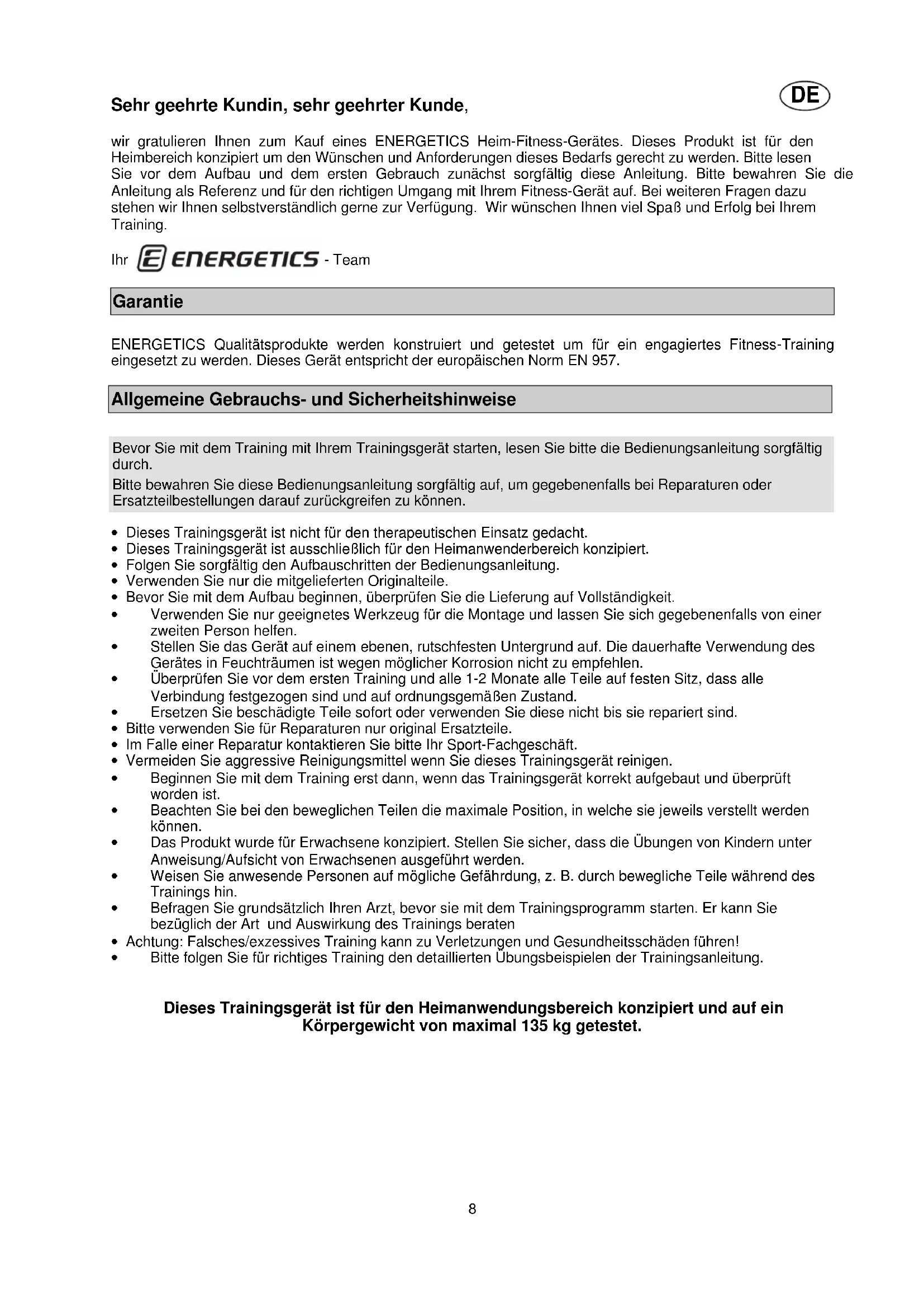 Sehr geehrte Kundin, sehr geehrter Kunde, wir gratulieren Ihnen zum Kauf eines ENERGETICS Heim-Fitness-Gerätes. Dieses Produkt ist für den Heimbereich konzipiert um den Wünschen und Anforderungen dieses Bedarfs gerecht zu werden. Bitte lesen Sie vor dem Aufbau und dem ersten Gebrauch zunächst sorgfältig diese Anleitung. Bitte bewahren Sie die Anleitung als Referenz und für den richtigen Umgang mit Ihrem Fitness-Gerät auf. Bei weiteren Fragen dazu stehen wir Ihnen selbstverständlich gerne zur Verfügung. Wir wünschen Ihnen viel Spaß und Erfolg bei Ihrem Training. Ihr - Team Garantie ENERGETICS Qualitätsprodukte werden konstruiert und getestet um für ein engagiertes Fitness-Training eingesetzt zu werden. Dieses Gerät entspricht der europäischen Norm EN 957. Allgemeine Gebrauchs- und Sicherheitshinweise