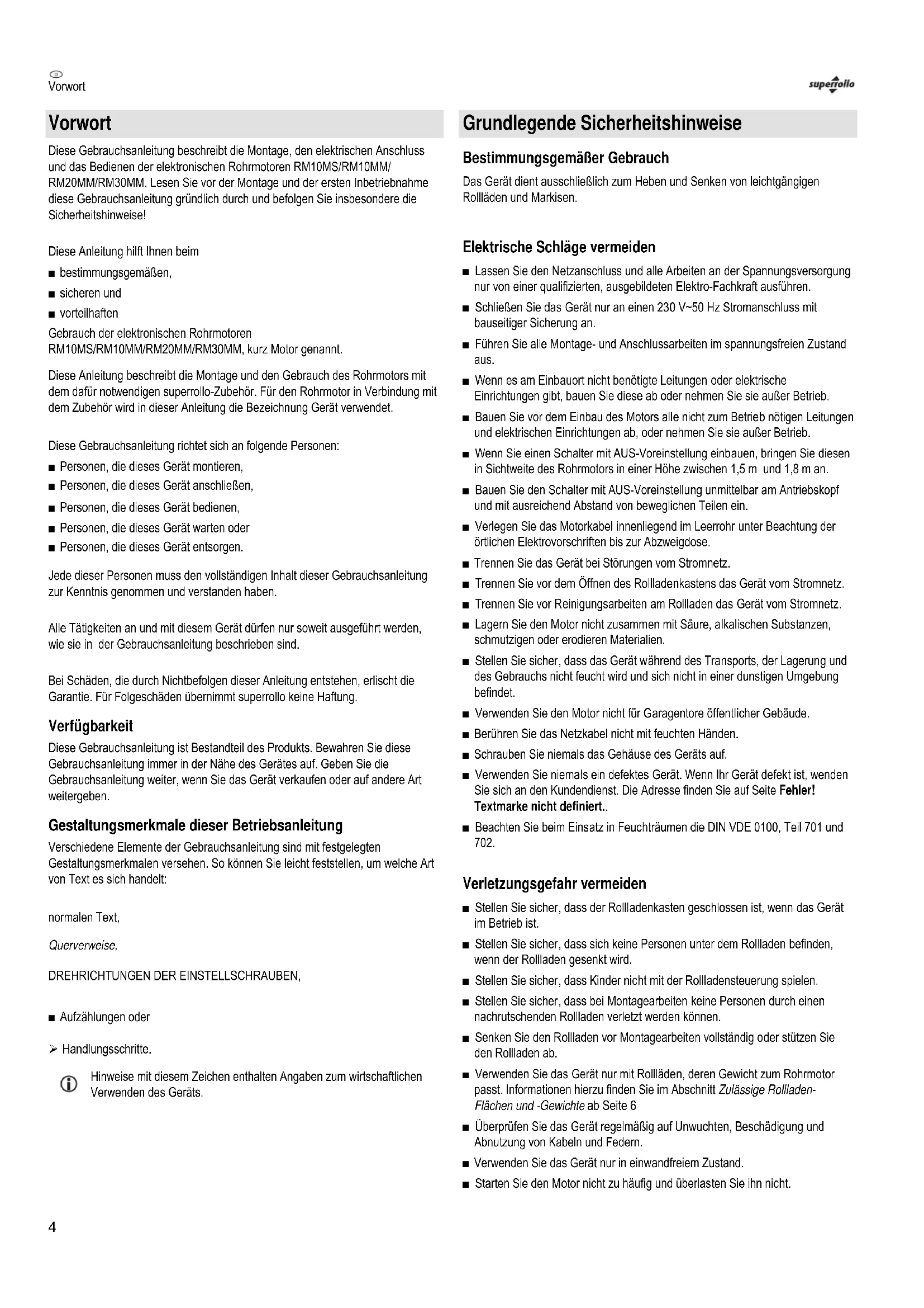 These Gebrauchsanleitung beschreibt die Montage, den elektrischen Anschluss und das Bedieren der elektronischen Rohrmotoren RM10MS/RM10MM/ RM20MM/RM30MM. Lesen Sie vor der Montage und der ersten Inbetriebnahme diese Gebrauchsanleitung grundlich durch und befolgen Sie insbesondere die Sicherheitshinweise!