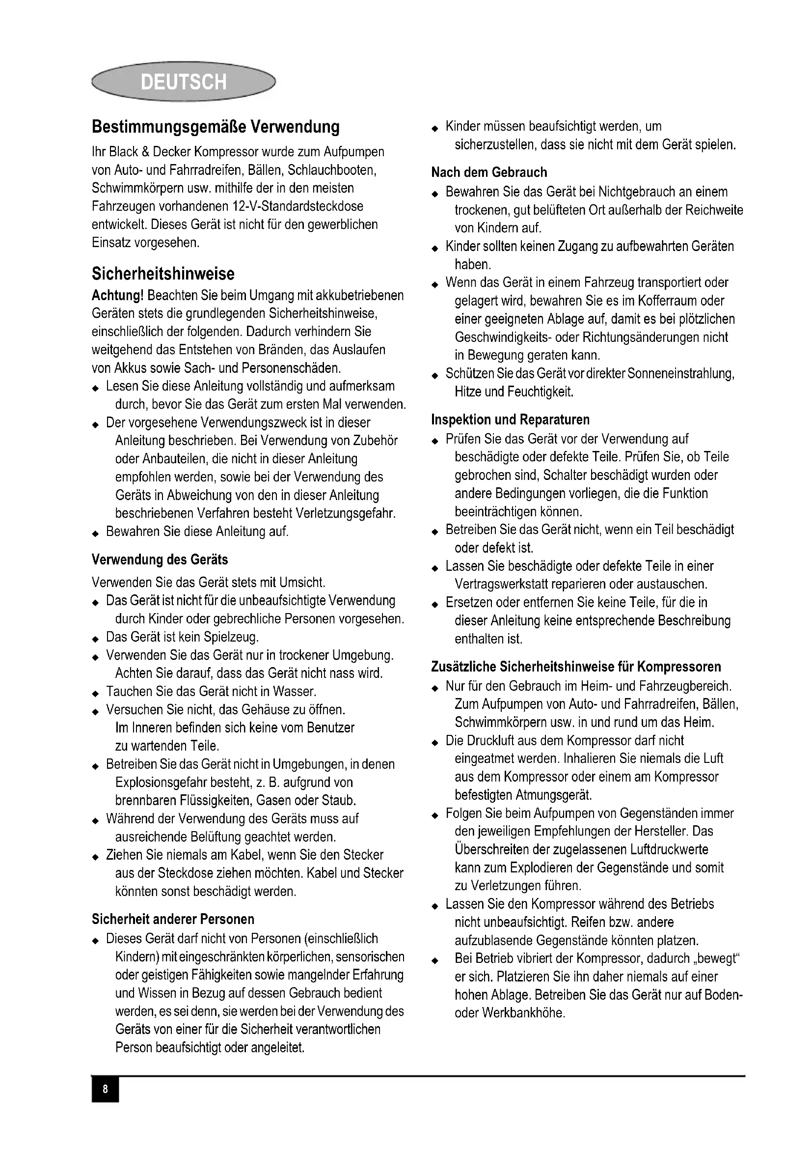 Ihr Black & Decker Kompressor wurde zum Aufpumpen von Auto- und Fahrradreifen, Bällen, Schlauchbooten, Schwimmkorpmn usw. mithilfe der in den meisten Fahrzeugen vorhandenen 12-V-Standardsteckdose entwickelt. Dieses Gerät ist nicht für den gewerblichen Einsatz vorgesehen.