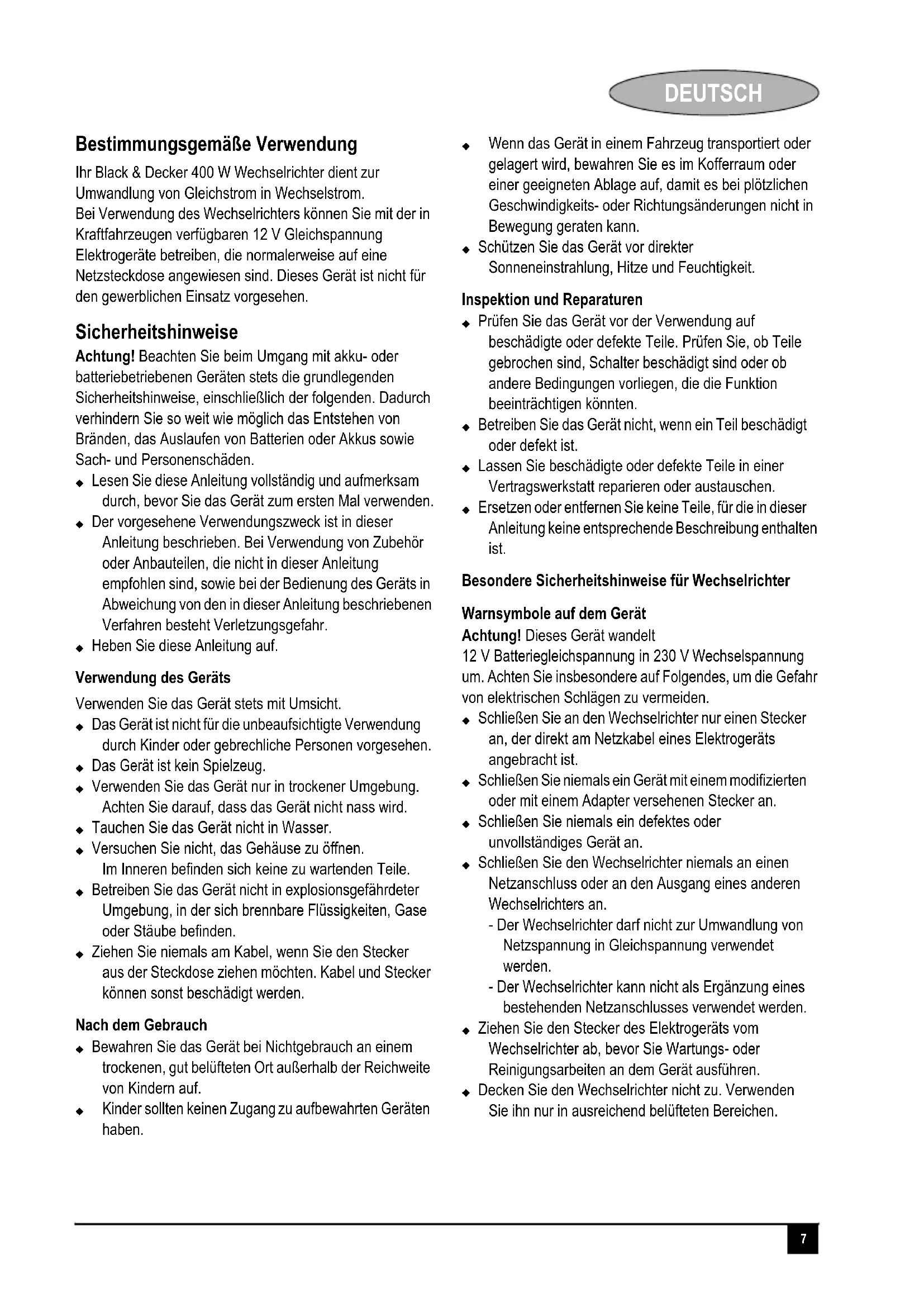 Ihr Black & Decker 400 W Wechselrichter dient zur Umwandlung von Gleichstrom in Wechselstrom. Bei Verwendung des Wechselrichters konnen Sie mit der in Kraftfahrzeugen verfügbarbaren 12 V Gleichspannung Elektrogeräte betreiben, die normalerweise auf eine Netzsteckdose angewiesen sind. Dieses Gerät ist nicht für den gewerblichen Einsatz vorgesehen.