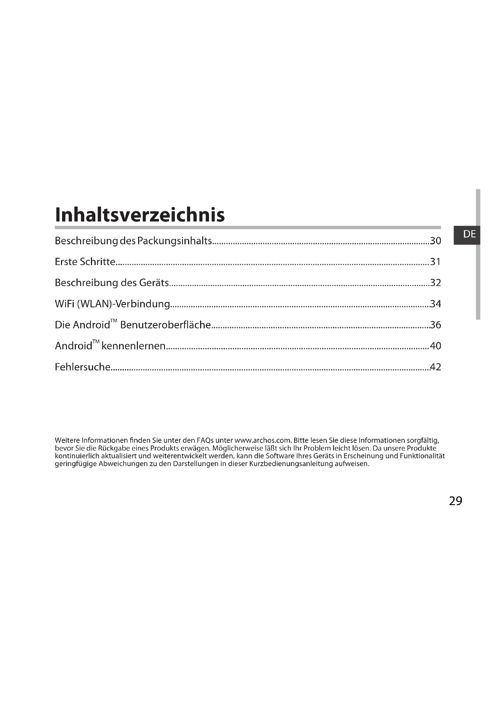 Inhaltsverzeichnis Weitere Informationen nden Sie unter den FAQs unter www.archos.com. Bitte lesen Sie diese Informationen sorgfältig, bevor Sie die Rückgabe eines Produkts erwägen. Möglicherweise läßt sich Ihr Problem leicht lösen. Da unsere Produkte kontinuierlich aktualisiert und weiterentwickelt werden, kann die Software Ihres Geräts in Erscheinung und Funktionalität geringfügige Abweichungen zu den Darstellungen in dieser Kurzbedienungsanleitung aufweisen. Beschreibung des Packungsinhalts................................................................................................. Erste Schritte......................................................................................................................................... Beschreibung des Geräts.................................................................................................................. WiFi (WLAN)-Verbindung.................................................................................................................. Die Android