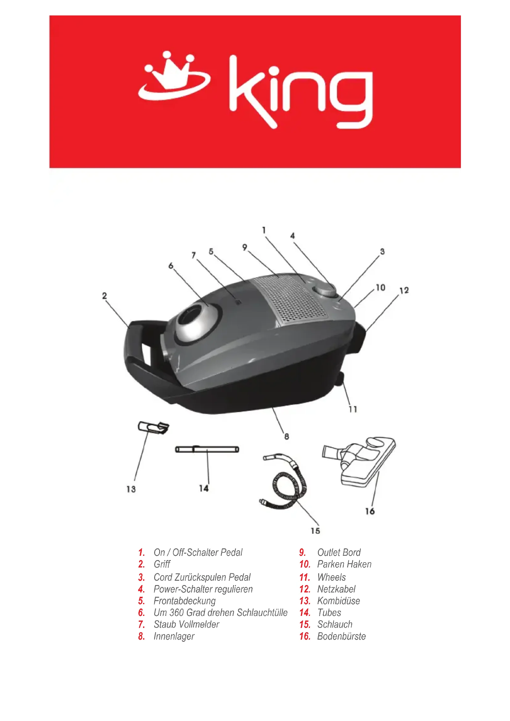 Laden Sie die Anleitung für Ihr Staubsauger kostenlos im PDF-Format! Finden Sie Ihr Handbuch Vento P 276 - KING und nehmen Sie Ihr elektronisches Gerät wieder in die Hand. Auf dieser Seite sind alle Dokumente veröffentlicht, die für die Verwendung Ihres Geräts notwendig sind. Vento P 276 von der Marke KING.