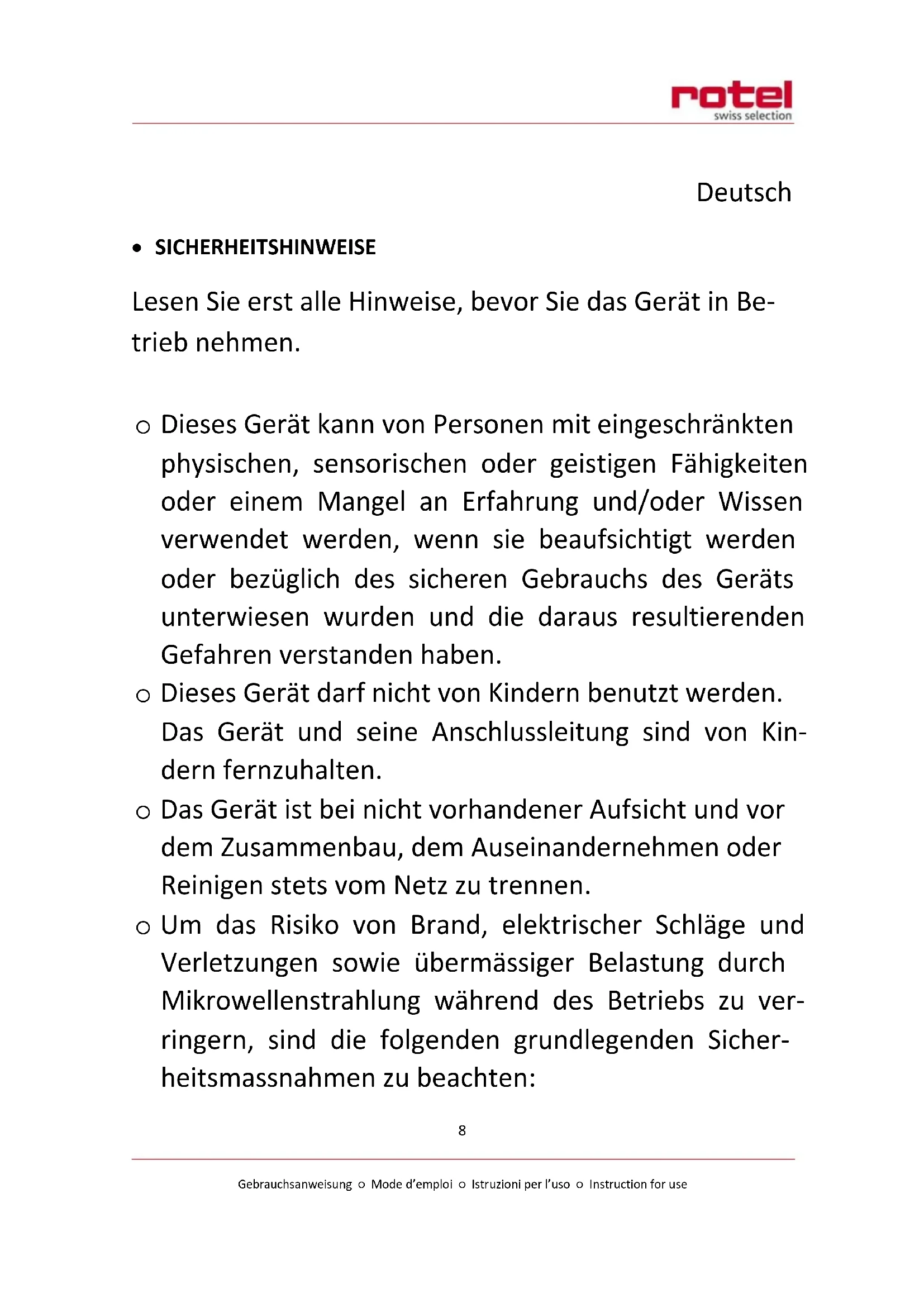 - Zur ordnungsgemässen Entsorgung geben Sie das Gerät bitte an einen Händler, den Kundendienst oder Rotel AG zurück.