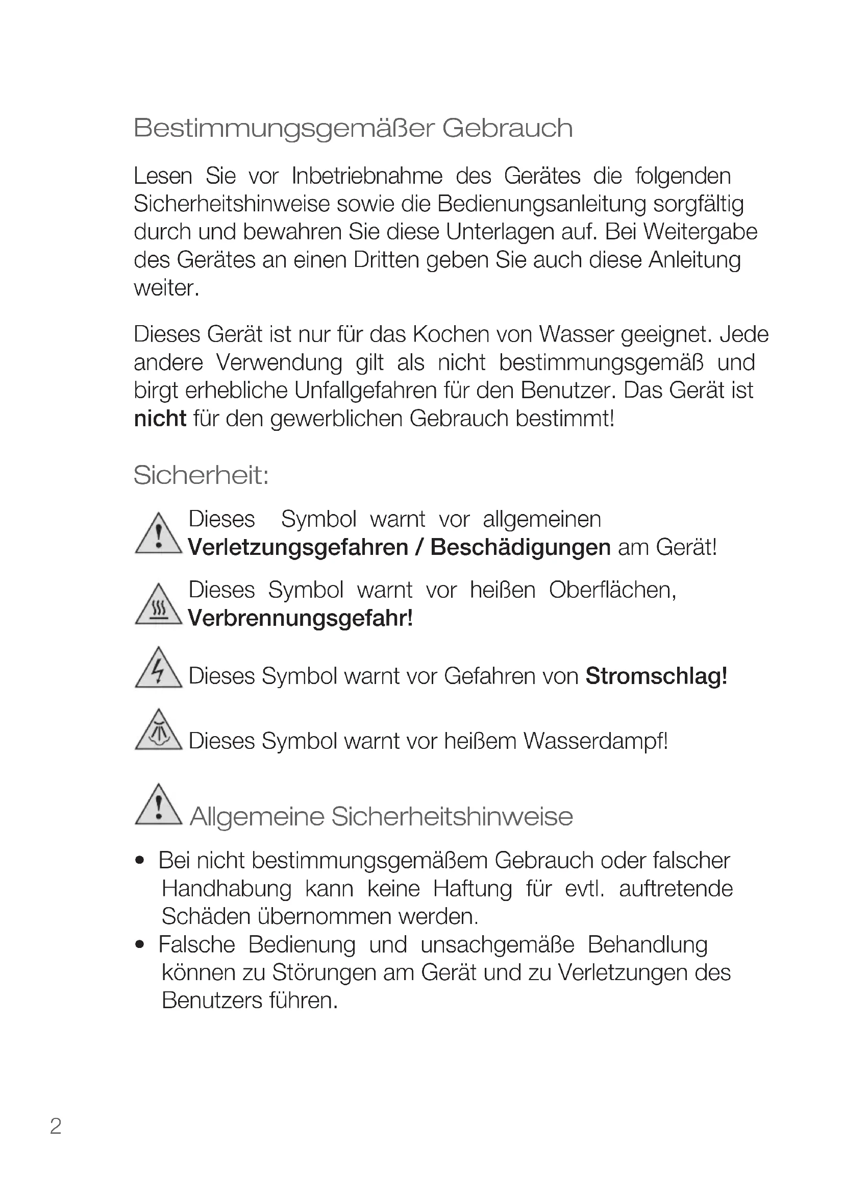 Dieses Gerät ist nur für das Kochen von Wasser geeignet. jeder andere Verwendung gilt als nicht bestimmungsgemäß und birgt erhebliche Unfallgefahren für den Benutzer. Das Gerät ist nicht für den gewerblichen Gebrauch bestimmt!