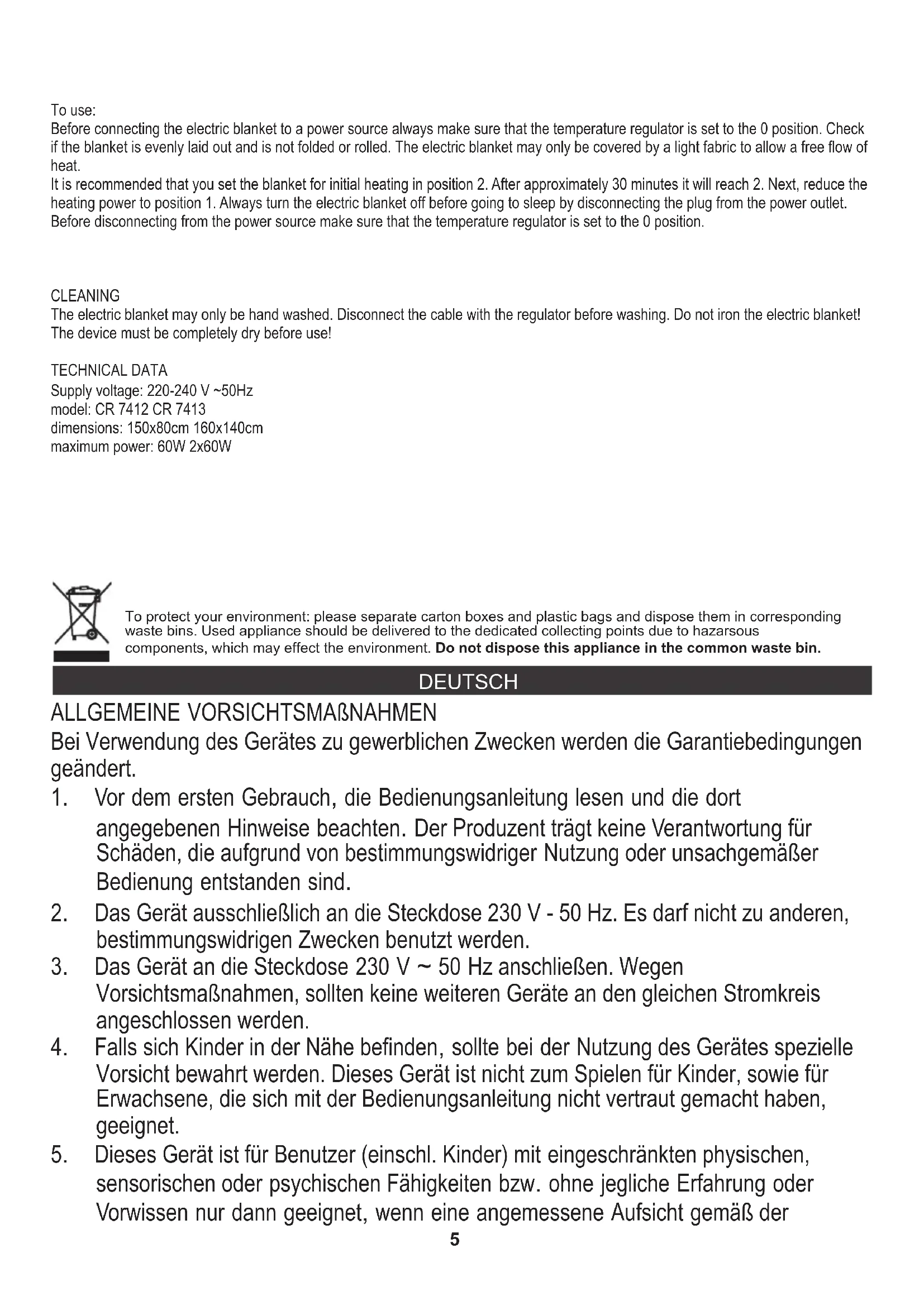 Bedienung: Bevor Sie das Heizlaken an den Strom anschließen, prüfen Sie, ob das Temperatursteuergerät in der Stellung “0” eingestellt ist. Prüfen Sie, ob das Heizlaken gleichmäßig auseinander gefaltet wurde und es nicht gefaltet oder zusammengerollt ist. Das Heizlaken kann nur mit einem leichten Gewebe zugedeckt werden, um die freie Wärmeübertragung zu ermöglichen. Es wird empfohlen, das Heizkissen zum Vorheizen in die Stellung 2 einzustellen. Nach zirka 30 Minuten erreicht das Heizkissen eine Temperatur von 2. Reduzieren Sie dann die Heizstärke, indem Sie die Stellung “1” einstellen. Bevor Sie sich ins Bett legen, ziehen Sie immer den Stecker aus der Steckdose heraus. Bevor Sie das Gerät von dem Strom abschalten, prüfen Sie, dass das Temperatursteuergerät in die Stellung “0” eingestellt ist. 7REINIGUNG Das Heizlaken kann nur mit der Hand gewaschen werden. Vor dem Waschen ziehen Sie das Speisekabel mit dem Steuergerät ab. Man darf nicht das Heizlaken bügeln! Vor der Benutzung muss das Gerät vollständig trocken sein! TECHNISCHE DATEN Versorgungsspannung: 220-240 V ~50 Hz Modell: CR 7412 CR 7413 Abmaße: 150x80 cm 160x140 cm max. Leistung: 60W 2x60W