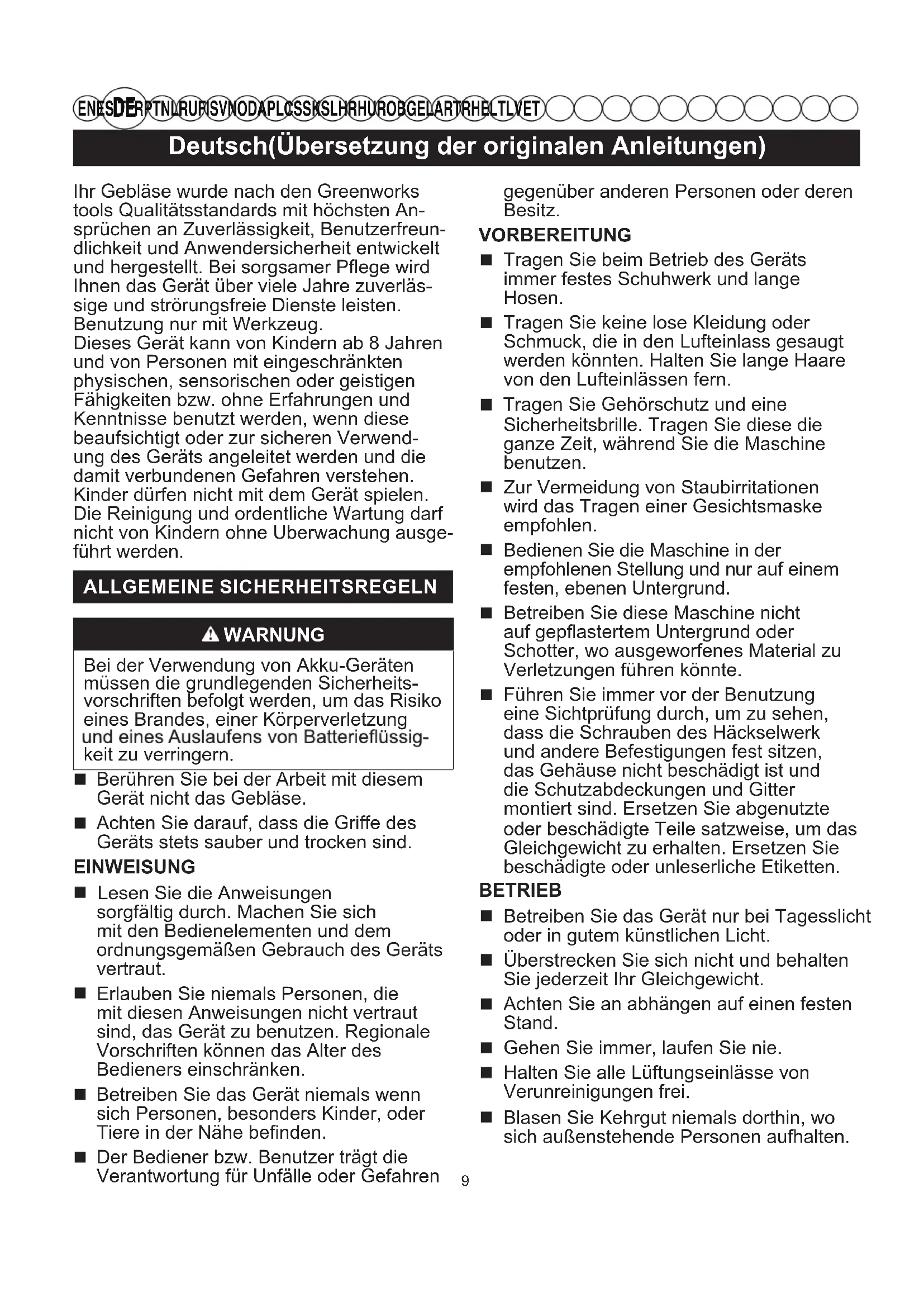 EN ES IT FR PT NL RU FI SV NO DA PL CS SK SL HR HU RO BG EL AR TR HE LT LV ET Ihr Gebläse wurde nach den Greenworks tools Qualitätsstandards mit höchsten An- sprüchen an Zuverlässigkeit, Benutzerfreun- dlichkeit und Anwendersicherheit entwickelt und hergestellt. Bei sorgsamer Pflege wird Ihnen das Gerät über viele Jahre zuverläs- sige und strörungsfreie Dienste leisten. Benutzung nur mit Werkzeug. Dieses Gerät kann von Kindern ab 8 Jahren und von Personen mit eingeschränkten physischen, sensorischen oder geistigen Fähigkeiten bzw. ohne Erfahrungen und Kenntnisse benutzt werden, wenn diese beaufsichtigt oder zur sicheren Verwend- ung des Geräts angeleitet werden und die damit verbundenen Gefahren verstehen. Kinder dürfen nicht mit dem Gerät spielen. Die Reinigung und ordentliche Wartung darf nicht von Kindern ohne Uberwachung ausge- führt werden. ALLGEMEINE SICHERHEITSREGELN WARNUNG Bei der Verwendung von Akku-Geräten müssen die grundlegenden Sicherheits- vorschriften befolgt werden, um das Risiko eines Brandes, einer Körperverletzung keit zu verringern. Berühren Sie bei der Arbeit mit diesem Gerät nicht das Gebläse. Achten Sie darauf, dass die Griffe des Geräts stets sauber und trocken sind. EINWEISUNG Lesen Sie die Anweisungen sorgfältig durch. Machen Sie sich mit den Bedienelementen und dem ordnungsgemäßen Gebrauch des Geräts vertraut. Erlauben Sie niemals Personen, die mit diesen Anweisungen nicht vertraut sind, das Gerät zu benutzen. Regionale Vorschriften können das Alter des Bedieners einschränken. Betreiben Sie das Gerät niemals wenn sich Personen, besonders Kinder, oder Tiere in der Nähe befinden. Der Bediener bzw. Benutzer trägt die Verantwortung für Unfälle oder Gefahren gegenüber anderen Personen oder deren Besitz. VORBEREITUNG Tragen Sie beim Betrieb des Geräts immer festes Schuhwerk und lange Hosen. Tragen Sie keine lose Kleidung oder Schmuck, die in den Lufteinlass gesaugt werden könnten. Halten Sie lange Haare von den Lufteinlässen fern. Tragen Sie Gehörschutz und eine Sicherheitsbrille. Tragen Sie diese die ganze Zeit, während Sie die Maschine benutzen. Zur Vermeidung von Staubirritationen wird das Tragen einer Gesichtsmaske empfohlen. Bedienen Sie die Maschine in der empfohlenen Stellung und nur auf einem festen, ebenen Untergrund. Betreiben Sie diese Maschine nicht auf gepflastertem Untergrund oder Schotter, wo ausgeworfenes Material zu Verletzungen führen könnte. Führen Sie immer vor der Benutzung eine Sichtprüfung durch, um zu sehen, dass die Schrauben des Häckselwerk und andere Befestigungen fest sitzen, das Gehäuse nicht beschädigt ist und die Schutzabdeckungen und Gitter montiert sind. Ersetzen Sie abgenutzte oder beschädigte Teile satzweise, um das Gleichgewicht zu erhalten. Ersetzen Sie beschädigte oder unleserliche Etiketten. BETRIEB Betreiben Sie das Gerät nur bei Tagesslicht oder in gutem künstlichen Licht. Überstrecken Sie sich nicht und behalten Sie jederzeit Ihr Gleichgewicht. Achten Sie an abhängen auf einen festen Stand. Gehen Sie immer, laufen Sie nie. Halten Sie alle Lüftungseinlässe von Verunreinigungen frei. Blasen Sie Kehrgut niemals dorthin, wo sich außenstehende Personen aufhalten.10 Deutsch(Übersetzung der originalen Anleitungen)
