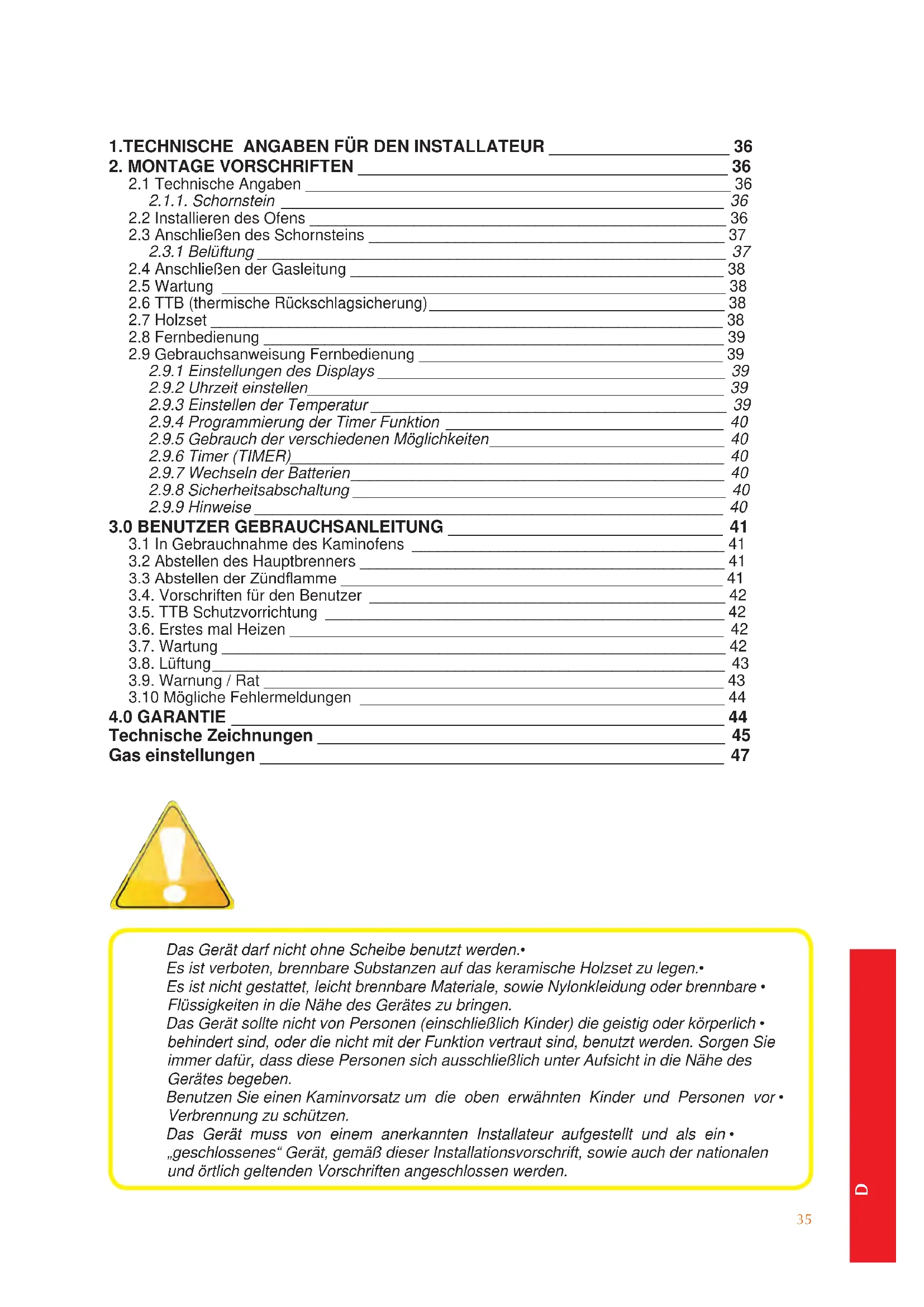 Das Gerät darf nicht ohne Scheibe benutzt werden.• Es ist verboten, brennbare Substanzen auf das keramische Holzset zu legen.• Es ist nicht gestattet, leicht brennbare Materiale, sowie Nylonkleidung oder brennbare • Flüssigkeiten in die Nähe des Gerätes zu bringen. Das Gerät sollte nicht von Personen (einschließlich Kinder) die geistig oder körperlich • behindert sind, oder die nicht mit der Funktion vertraut sind, benutzt werden. Sorgen Sie immer dafür, dass diese Personen sich ausschließlich unter Aufsicht in die Nähe des Gerätes begeben. Benutzen Sie einen Kaminvorsatz um die oben erwähnten Kinder und Personen vor • Verbrennung zu schützen. Das Gerät muss von einem anerkannten Installateur aufgestellt und als ein • „geschlossenes“ Gerät, gemäß dieser Installationsvorschrift, sowie auch der nationalen und örtlich geltenden Vorschriften angeschlossen werden.