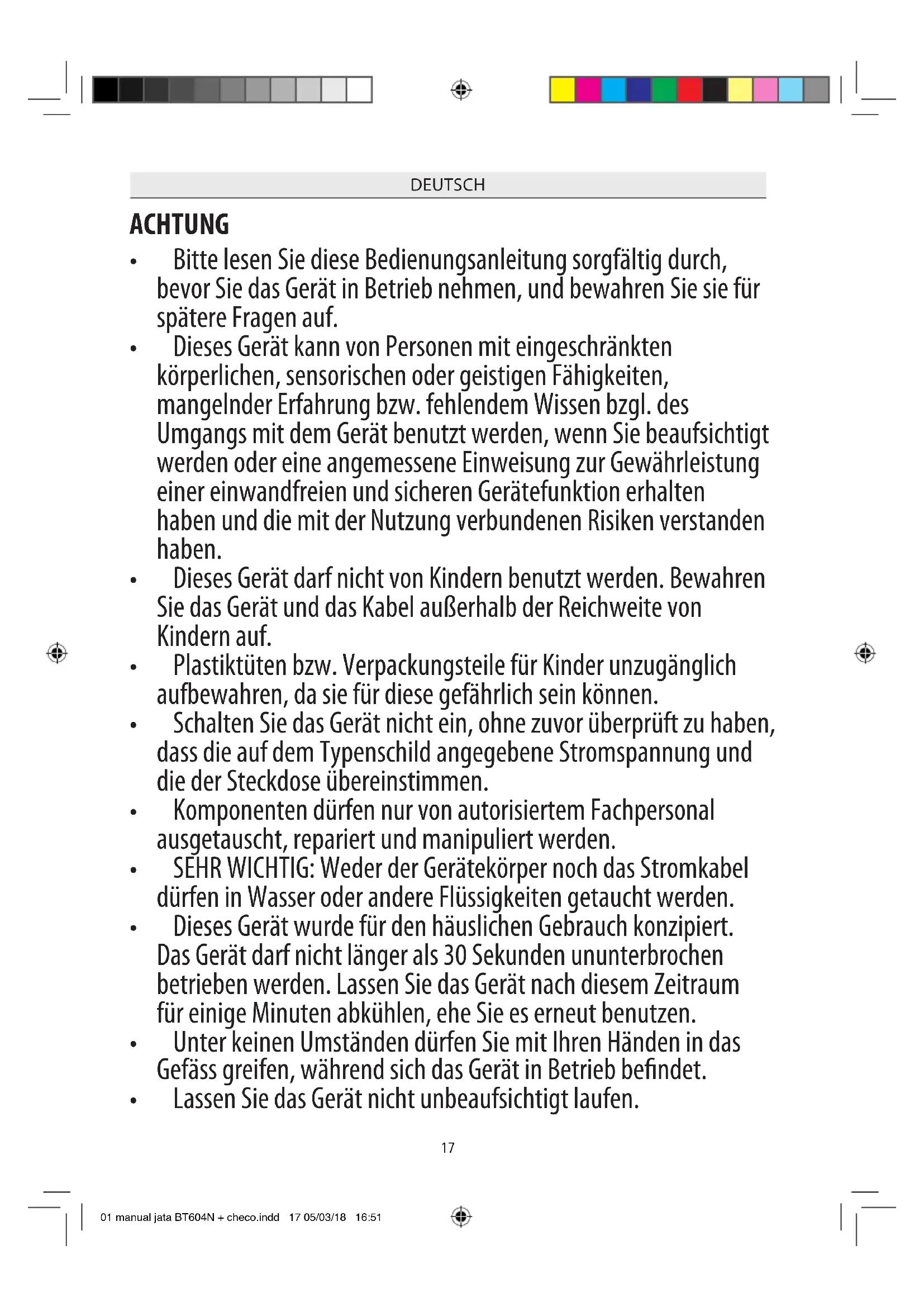 - Lassen Sie das Gerät nicht unbeaufsichtigt laufen. 01 manual jata BT604N + checo.indd 17 05/03/18 16:5118