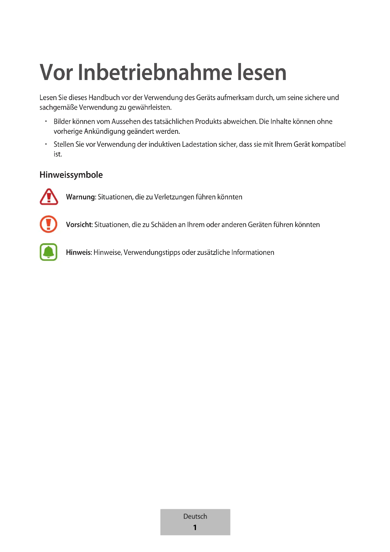 Stellen Sie vor Verwendung der induktiven Ladestation sicher, dass sie mit Ihrem Gerät kompatibel ist. Hinweissymbole Warnung: Situationen, die zu Verletzungen führen könnten Vorsicht: Situationen, die zu Schäden an Ihrem oder anderen Geräten führen könnten Hinweis: Hinweise, Verwendungstipps oder zusätzliche Informationen Deutsch