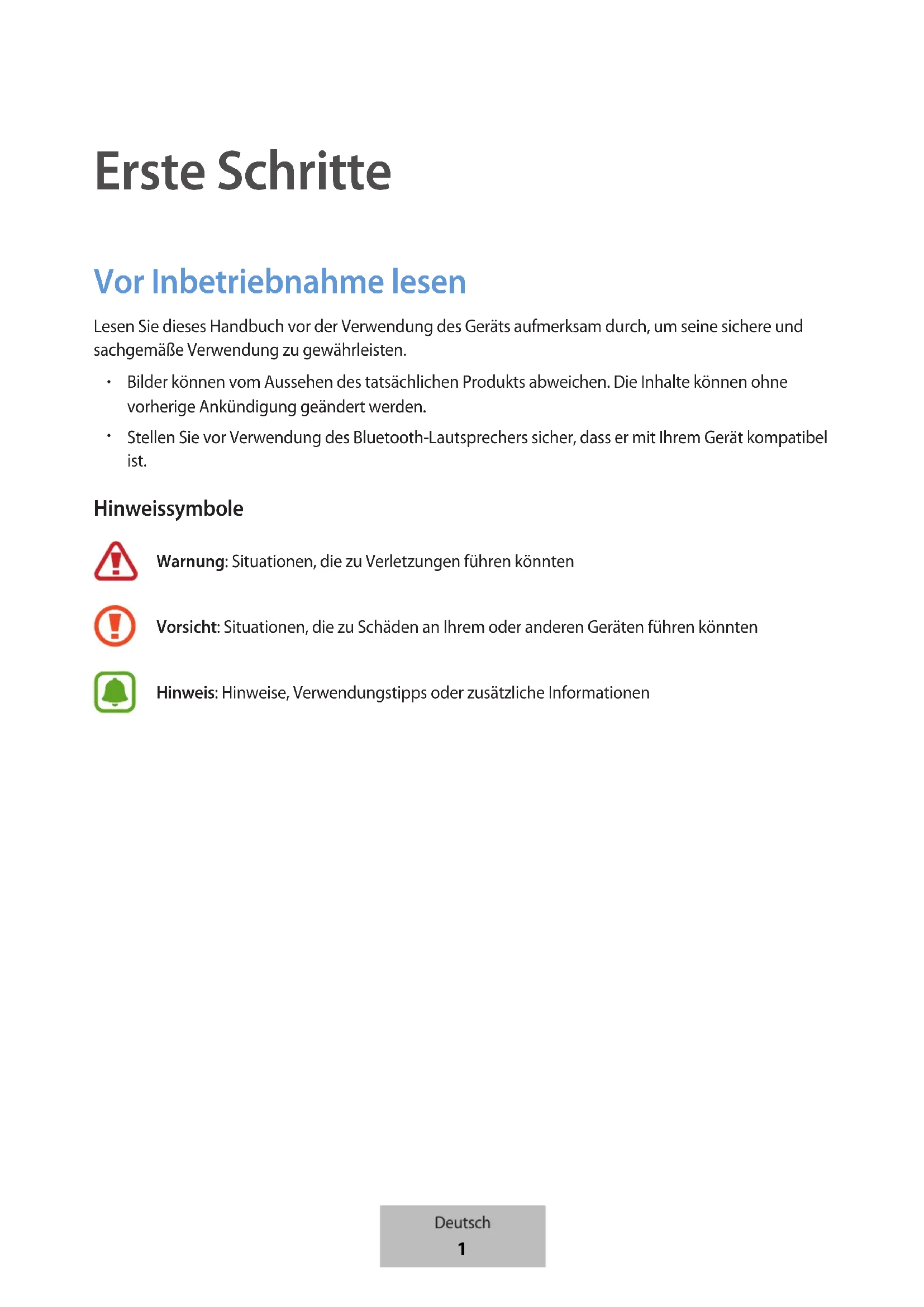 Erste Schritte Vor Inbetriebnahme lesen Lesen Sie dieses Handbuch vor der Verwendung des Geräts aufmerksam durch, um seine sichere und sachgemäße Verwendung zu gewährleisten. Bilder können vom Aussehen des tatsächlichen Produkts abweichen. Die Inhalte können ohne vorherige Ankündigung geändert werden. Stellen Sie vor Verwendung des Bluetooth-Lautsprechers sicher, dass er mit Ihrem Gerät kompatibel ist. Hinweissymbole Warnung: Situationen, die zu Verletzungen führen könntenVorsicht: Situationen, die zu Schäden an Ihrem oder anderen Geräten führen könntenHinweis: Hinweise, Verwendungstipps oder zusätzliche Informationen Deutsch 1Erste Schritte