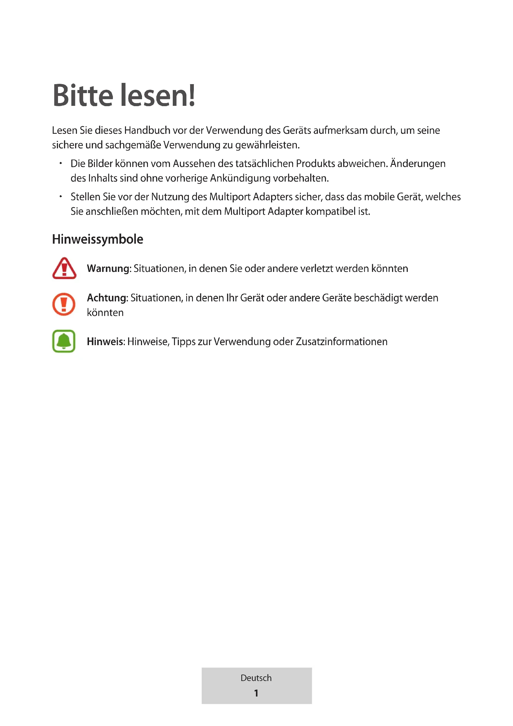 Die Medienwiedergabe wird bei eingehenden Anrufen oder Mitteilungen angehalten. Nachdem diese Aktionen abgeschlossen sind, wird die Medienwiedergabe neu gestartet. Verbindung mit USB-Gerät herstellen Verbinden Sie ein USB-Gerät wie eine Maus oder eine Tastatur mit dem USB-Port des Multiport Adapters. Schließen Sie keine anderen Geräte außer einem USB-Gerät an (5 V, weniger als 900 mA). Dadurch kann das Gerät beschädigt werden. Lassen Sie das Ladegerät eingesteckt, während Sie den Multiport Adapter benutzen. Die Folge kann Verlust der Dateien sein, die auf dem verbundenen Gerät gespeichert sind.5 Deutsch Copyright Copyright © 2016 Samsung Electronics Dieses Handbuch ist durch internationale Urheberrechtsgesetze geschützt. Kein Teil dieses Handbuchs darf ohne die vorherige schriftliche Zustimmung von Samsung Electronics vervielfältigt, verteilt, übersetzt oder in anderer Weise oder auf anderem Weg übertragen werden, sei es elektronisch oder mechanisch, einschließlich der Erstellung von Fotokopien, der Protokollierung oder Speicherung von Teilen in einem System zur Speicherung und Wiedergewinnung von Daten. Marken