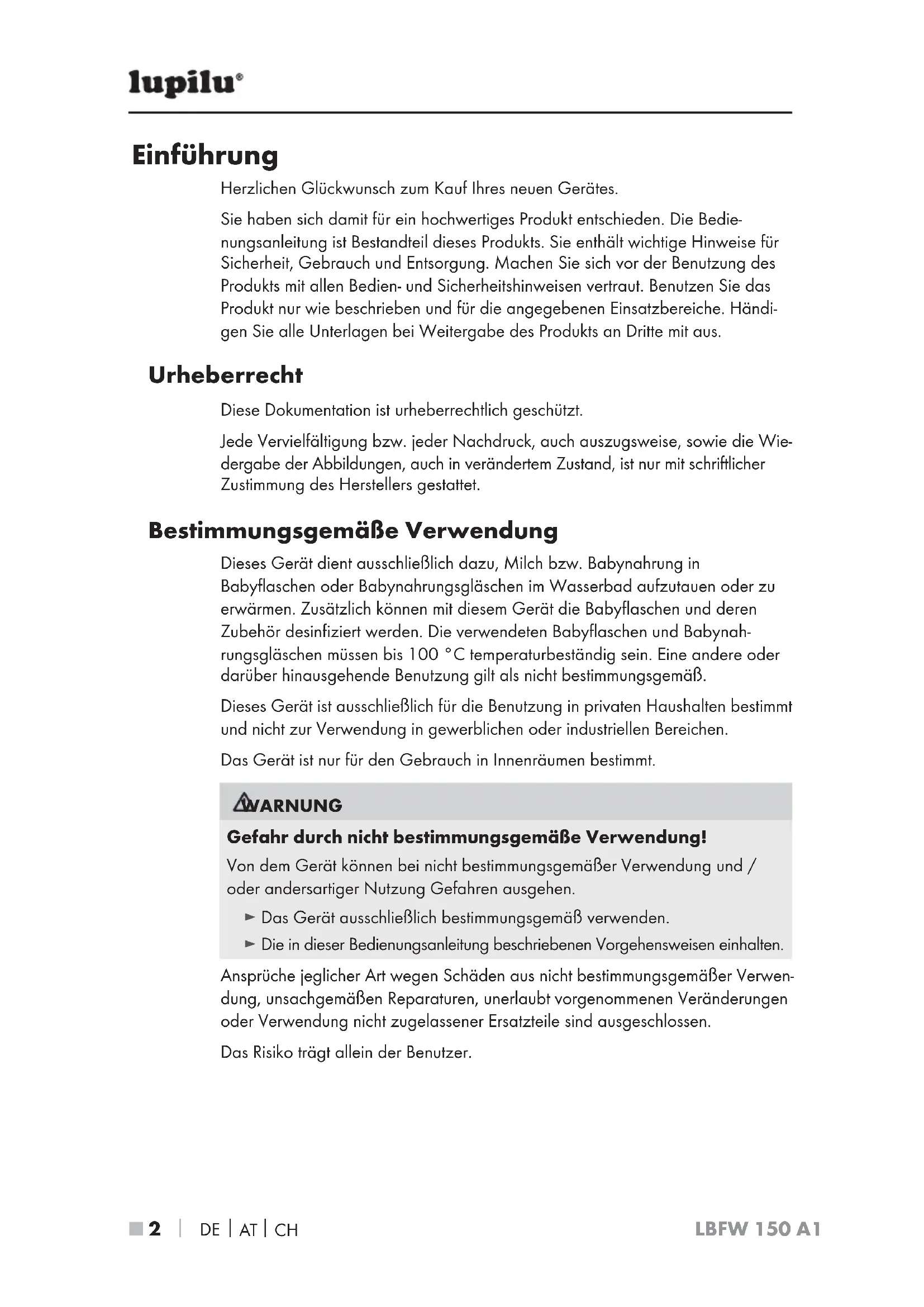 LBFW 150 A1 Einführung Herzlichen Glückwunsch zum Kauf Ihres neuen Gerätes. Sie haben sich damit für ein hochwertiges Produkt entschieden. Die Bedie- nungsanleitung ist Bestandteil dieses Produkts. Sie enthält wichtige Hinweise für Sicherheit, Gebrauch und Entsorgung. Machen Sie sich vor der Benutzung des Produkts mit allen Bedien- und Sicherheitshinweisen vertraut. Benutzen Sie das Produkt nur wie beschrieben und für die angegebenen Einsatzbereiche. Händi- gen Sie alle Unterlagen bei Weitergabe des Produkts an Dritte mit aus. Urheberrecht Diese Dokumentation ist urheberrechtlich geschützt. Jede Vervielfältigung bzw. jeder Nachdruck, auch auszugsweise, sowie die Wie- dergabe der Abbildungen, auch in verändertem Zustand, ist nur mit schriftlicher Zustimmung des Herstellers gestattet. Bestimmungsgemäße Verwendung Dieses Gerät dient ausschließlich dazu, Milch bzw. Babynahrung in Babyflaschen oder Babynahrungsgläschen im Wasserbad aufzutauen oder zu erwärmen. Zusätzlich können mit diesem Gerät die Babyflaschen und deren Zubehör desinfiziert werden. Die verwendeten Babyflaschen und Babynah- rungsgläschen müssen bis 100 °C temperaturbeständig sein. Eine andere oder darüber hinausgehende Benutzung gilt als nicht bestimmungsgemäß. Dieses Gerät ist ausschließlich für die Benutzung in privaten Haushalten bestimmt und nicht zur Verwendung in gewerblichen oder industriellen Bereichen. Das Gerät ist nur für den Gebrauch in Innenräumen bestimmt. WARNUNG Gefahr durch nicht bestimmungsgemäße Verwendung! Von dem Gerät können bei nicht bestimmungsgemäßer Verwendung und / oder andersartiger Nutzung Gefahren ausgehen. ► Das Gerät ausschließlich bestimmungsgemäß verwenden. ► Die in dieser Bedienungsanleitung beschriebenen Vorgehensweisen einhalten. Ansprüche jeglicher Art wegen Schäden aus nicht bestimmungsgemäßer Verwen- dung, unsachgemäßen Reparaturen, unerlaubt vorgenommenen Veränderungen oder Verwendung nicht zugelassener Ersatzteile sind ausgeschlossen. Das Risiko trägt allein der Benutzer.DE