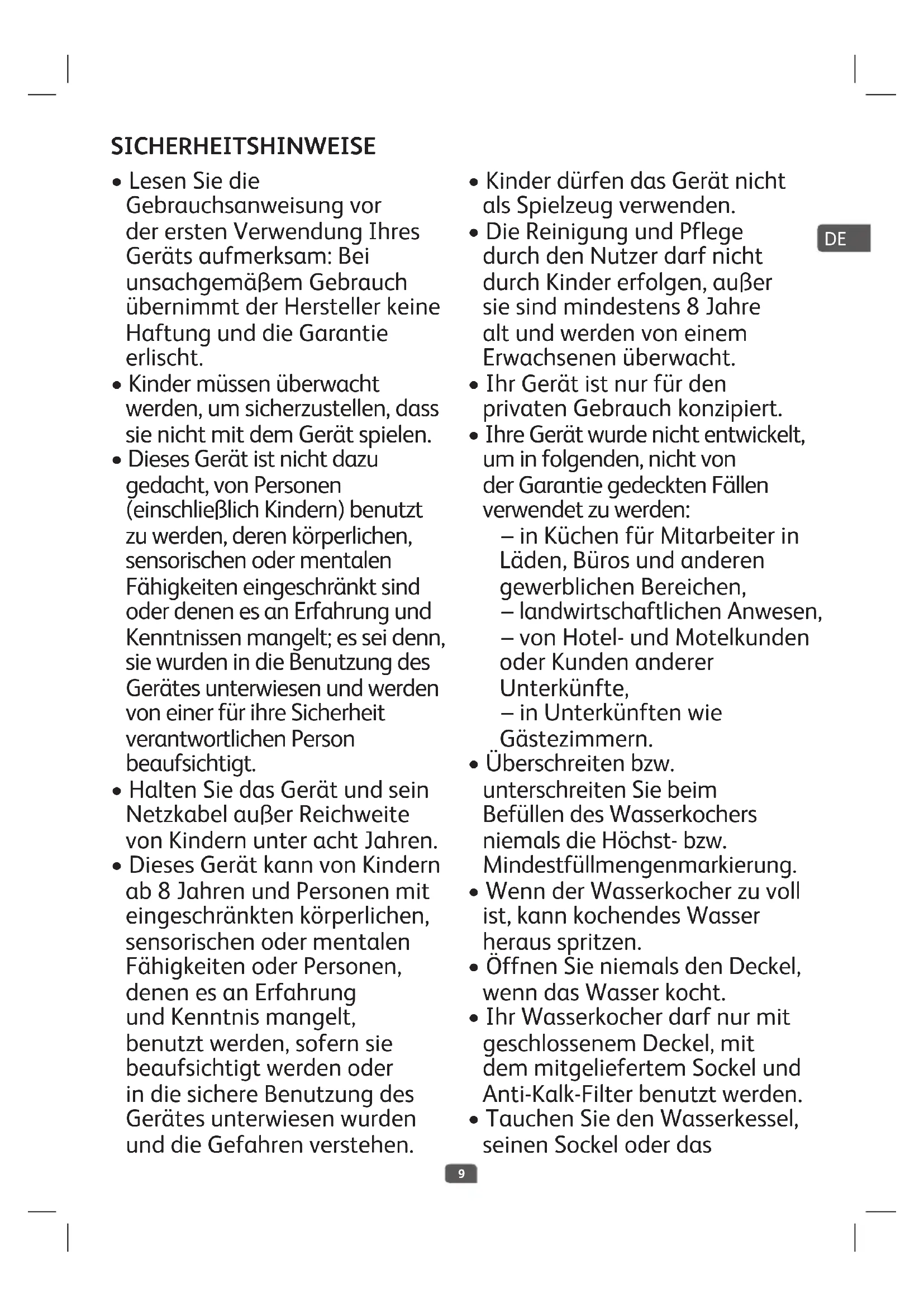 - Tauchen Sie den Wasserkessel, seinen Sockel oder das SICHERHEITSHINWEISE DE10 Stromkabel und den Stecker nicht in Wasser oder andere Flüssigkeiten.