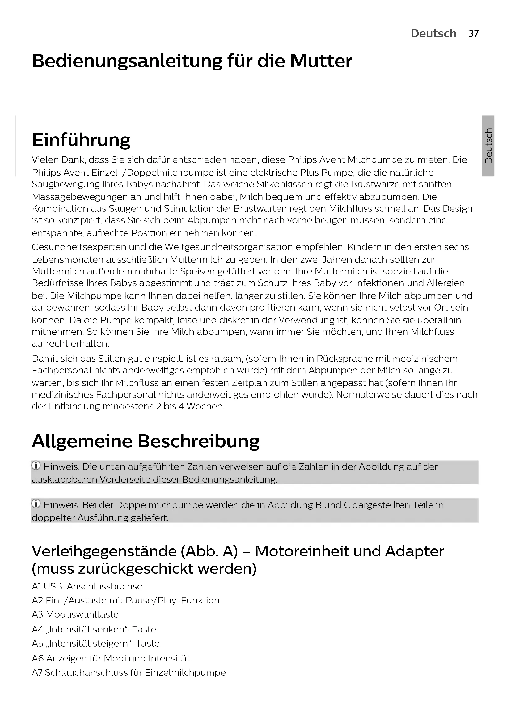 Deutsch Deutsch Bedienungsanleitung für die Mutter Einführung Vielen Dank, dass Sie sich dafür entschieden haben, diese Philips Avent Milchpumpe zu mieten. Die Philips Avent Einzel-/Doppelmilchpumpe ist eine elektrische Plus Pumpe, die die natürliche Saugbewegung Ihres Babys nachahmt. Das weiche Silikonkissen regt die Brustwarze mit sanften Massagebewegungen an und hilft Ihnen dabei, Milch bequem und effektiv abzupumpen. Die Kombination aus Saugen und Stimulation der Brustwarten regt den Milchfluss schnell an. Das Design ist so konzipiert, dass Sie sich beim Abpumpen nicht nach vorne beugen müssen, sondern eine entspannte, aufrechte Position einnehmen können. Gesundheitsexperten und die Weltgesundheitsorganisation empfehlen, Kindern in den ersten sechs Lebensmonaten ausschließlich Muttermilch zu geben. In den zwei Jahren danach sollten zur Muttermilch außerdem nahrhafte Speisen gefüttert werden. Ihre Muttermilch ist speziell auf die Bedürfnisse Ihres Babys abgestimmt und trägt zum Schutz Ihres Baby vor Infektionen und Allergien bei. Die Milchpumpe kann Ihnen dabei helfen, länger zu stillen. Sie können Ihre Milch abpumpen und aufbewahren, sodass Ihr Baby selbst dann davon profitieren kann, wenn sie nicht selbst vor Ort sein können. Da die Pumpe kompakt, leise und diskret in der Verwendung ist, können Sie sie überallhin mitnehmen. So können Sie Ihre Milch abpumpen, wann immer Sie möchten, und Ihren Milchfluss aufrecht erhalten. Damit sich das Stillen gut einspielt, ist es ratsam, (sofern Ihnen in Rücksprache mit medizinischem Fachpersonal nichts anderweitiges empfohlen wurde) mit dem Abpumpen der Milch so lange zu warten, bis sich Ihr Milchfluss an einen festen Zeitplan zum Stillen angepasst hat (sofern Ihnen Ihr medizinisches Fachpersonal nichts anderweitiges empfohlen wurde). Normalerweise dauert dies nach der Entbindung mindestens 2 bis 4 Wochen. Allgemeine Beschreibung Hinweis: Die unten aufgeführten Zahlen verweisen auf die Zahlen in der Abbildung auf der ausklappbaren Vorderseite dieser Bedienungsanleitung. Hinweis: Bei der Doppelmilchpumpe werden die in Abbildung B und C dargestellten Teile in doppelter Ausführung geliefert. Verleihgegenstände (Abb. A) – Motoreinheit und Adapter (muss zurückgeschickt werden) A1 USB-Anschlussbuchse A2 Ein-/Austaste mit Pause/Play-Funktion A3 Moduswahltaste A4 „Intensität senken“-Taste A5 „Intensität steigern“-Taste A6 Anzeigen für Modi und Intensität A7 Schlauchanschluss für Einzelmilchpumpe38 Deutsch A8 Schlauchanschlüsse für Doppelmilchpumpe A9 Adapter*