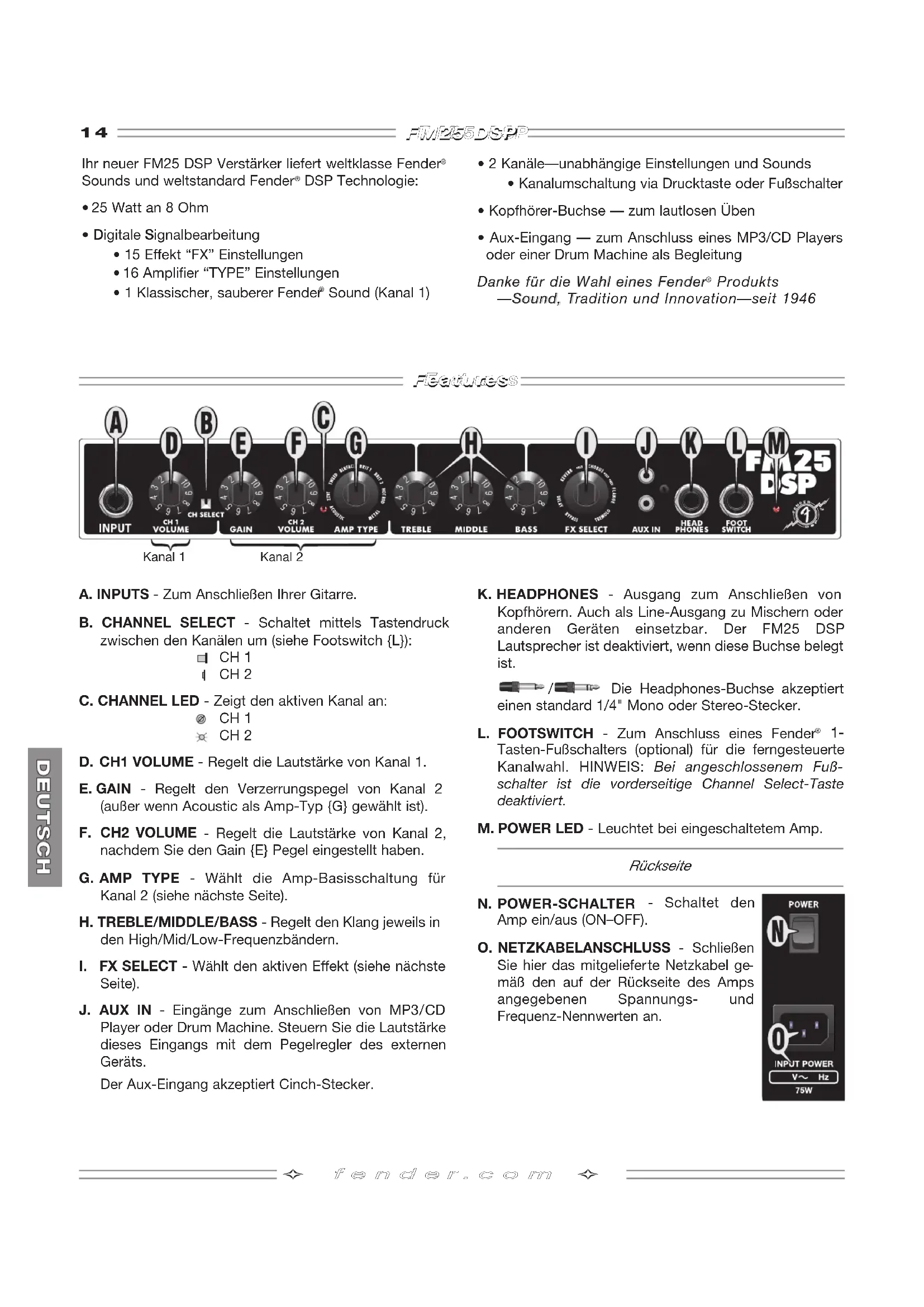 Seite). J. AUX IN - Eingänge zum Anschließen von MP3/CD Player oder Drum Machine. Steuern Sie die Lautstärke dieses Eingangs mit dem Pegelregler des externen Geräts. Der Aux-Eingang akzeptier t Cinch-Stecker. K. HEADPHONES - Ausgang zum Anschließen von Kopfhörern. Auch als Line-Ausgang zu Mischern oder anderen Geräten einsetzbar. Der FM25 DSP Lautsprecher ist deaktiviert, wenn diese Buchse belegt ist. / Die Headphones-Buchse akzeptiert einen standard 1/4" Mono oder Stereo-Stecker. L. FOOTSWITCH - Zum Anschluss eines Fender