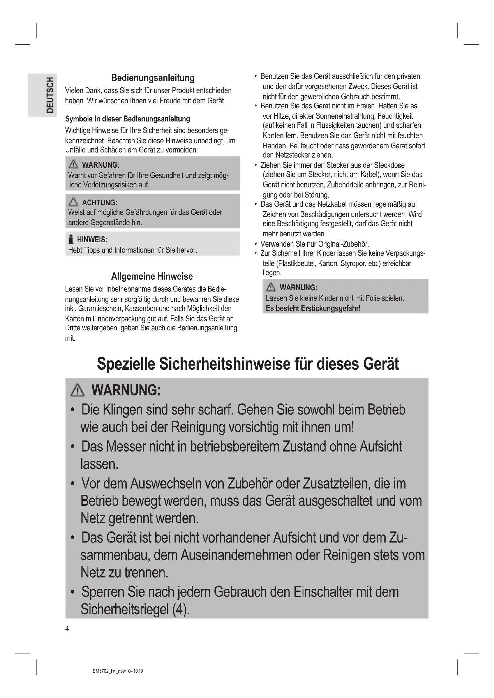 schädigungen feststellbar sein, nehmen Sie das Gerät nicht in Betrieb. Bringen Sie es umgehend zum Händler zurück. WARNUNG: Verletzungsgefahr! Seien Sie beim Umgang mit dem Messer besonders vorsichtig. Fassen Sie die Klingen möglichst nur an den Enden oder an den Griffflächen aus Kunststoff an. HINWEIS: Am Gerät können sich noch Staub oder Produktionsreste benden. Wir empfehlen Ihnen, das Gerät wie unter „Reinigung“ beschrieben zu säubern. Übersicht der Bedienelemente / Lieferumfang 1 Messer (bestehend aus 2 Klingen) 2 Entriegelungstaste 3 Einschalter 4 Sicherheitsriegel Ohne Abbildung AufbewahrungsboxEM3702_IM_new 04.10.19