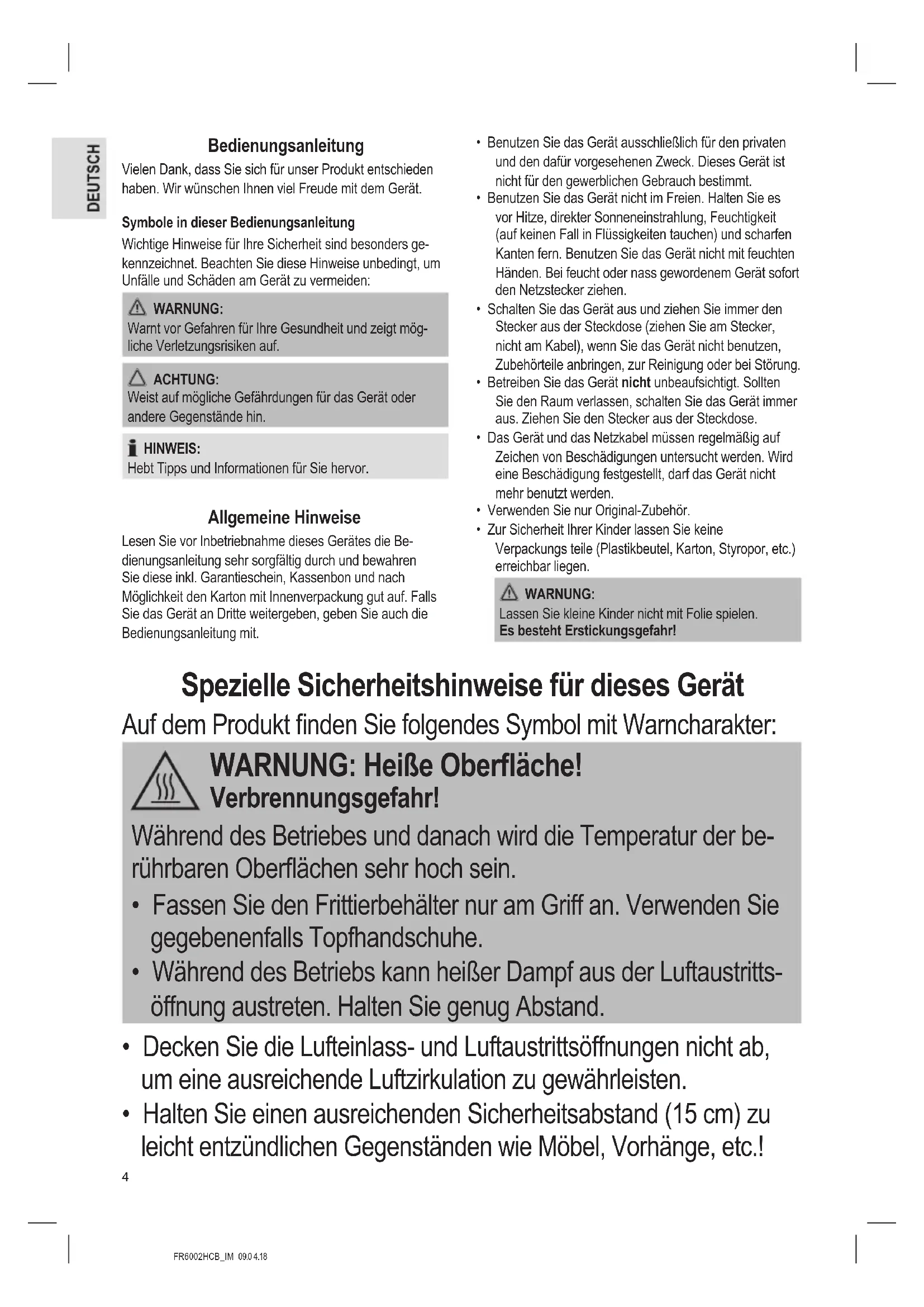 - Halten Sie einen ausreichenden Sicherheitsabstand (15 cm) zu leicht entzündlichen Gegenständen wie Möbel, Vorhänge, etc.!FR6002HCB_IM 09.0 4.18