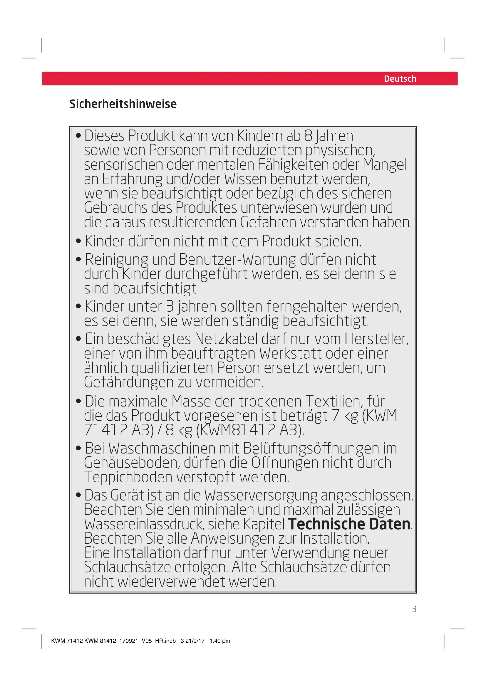 - Das Gerät ist an die Wasserversorgung angeschlossen. Beachten Sie den minimalen und maximal zulässigen Wassereinlassdruck, siehe Kapitel Technische Daten. Beachten Sie alle Anweisungen zur Installation. Eine Installation darf nur unter Verwendung neuer Schlauchsätze erfolgen. Alte Schlauchsätze dürfen nicht wiederverwendet werden. KWM 71412 KWM 81412_170921_V05_HR.indb 3 21/9/17 1:40 pmDeutsch