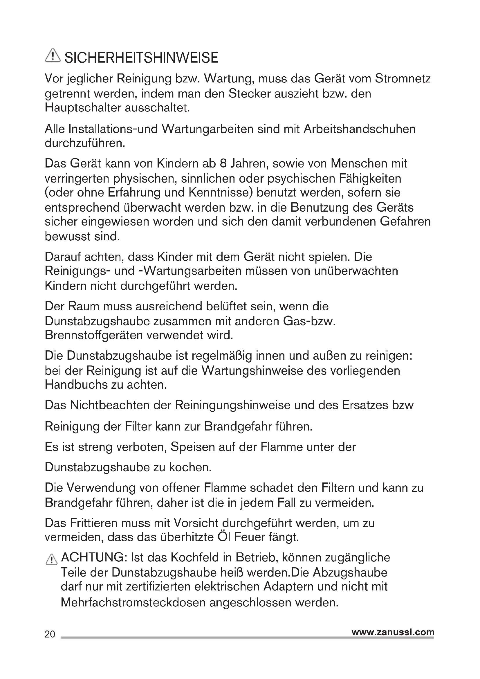 moyenne (4.), maximum (5.). Utiliser la puissance d’aspiration maximum en cas de concentration très importante des vapeurs de cuisson. Nous conseillons d’allumer la hotte 5 minutes avant de commencer la cuisson et de la faire fonctionner encore pendant 15 minutes environ après avoir terminé la cuisson. ÉCLAIRAGE La hotte est dotée d’un système d’éclairage basé sur la technologie LED. Les LEDS garantissent un éclairage optimal, une durée jusqu’à 10 fois supérieures aux ampoules traditionnelles et permettent une épargne de 90% en énergie électrique. Attention! Ne regardez pas directement la lumière provenant des LED. Pour le remplacement, s’adresser au service d’assistance technique.20 www.zanussi.com SICHERHEITSHINWEISE Vor jeglicher Reinigung bzw. Wartung, muss das Gerät vom Stromnetz getrennt werden, indem man den Stecker auszieht bzw. den Hauptschalter ausschaltet. Alle Installations-und Wartungarbeiten sind mit Arbeitshandschuhen durchzuführen. Das Gerät kann von Kindern ab 8 Jahren, sowie von Menschen mit verringerten physischen, sinnlichen oder psychischen Fähigkeiten (oder ohne Erfahrung und Kenntnisse) benutzt werden, sofern sie entsprechend überwacht werden bzw. in die Benutzung des Geräts sicher eingewiesen worden und sich den damit verbundenen Gefahren bewusst sind. Darauf achten, dass Kinder mit dem Gerät nicht spielen. Die Reinigungs- und -Wartungsarbeiten müssen von unüberwachten Kindern nicht durchgeführt werden. Der Raum muss ausreichend belüftet sein, wenn die Dunstabzugshaube zusammen mit anderen Gas-bzw. Brennstoffgeräten verwendet wird. Die Dunstabzugshaube ist regelmäßig innen und außen zu reinigen: bei der Reinigung ist auf die Wartungshinweise des vorliegenden Handbuchs zu achten. Das Nichtbeachten der Reiningungshinweise und des Ersatzes bzw Reinigung der Filter kann zur Brandgefahr führen. Es ist streng verboten, Speisen auf der Flamme unter der Dunstabzugshaube zu kochen. Die Verwendung von offener Flamme schadet den Filtern und kann zu Brandgefahr führen, daher ist die in jedem Fall zu vermeiden. Das Frittieren muss mit Vorsicht durchgeführt werden, um zu vermeiden, dass das überhitzte Öl Feuer fängt. ACHTUNG: Ist das Kochfeld in Betrieb, können zugängliche Teile der Dunstabzugshaube heiß werden.Die Abzugshaube darf nur mit zertifizierten elektrischen Adaptern und nicht mit Mehrfachstromsteckdosen angeschlossen werden.21 www.zanussi.com SICHERHEITSHINWEISE Für den Lampenersatz verwenden Sie nur den Lampentyp, der in dem Absatz Lampenwartung / Ersatz des vorliegenden Handbuchs angegeben wird. Achtung! Das Gerät nicht an das Stromnetz anschließen, bis die Installation vollständig abgeschlossen ist. Für das Ableiten der Küchengerüche, sich streng an die Voschriften der örtlichen Behörde halten. Bei gleichzeitigem Betrieb der Dunstabzugshaube im Abluftbetrieb und gas- oder brennstoffbetriebenen Geräten darf im Aufstellraum gas- oder brennstoffbetriebenen Geräten der Unterdruck nicht größer als 4 Pa (4 x 10-5 bar) sein. Die Abzugsluft darf nicht in eine Ableitung der Rauch-bzw.Brennstoffgase geleitet werden. Die Dunstabzugshaube ohne richtig installierte Lampen nicht verwenden bzw. lassen, um Stromschlaggefahr zu vermeiden. Die Dunstabzugshaube niemals ohne richtig installiertes Gitter verwenden! Die Dunstabzugshaube darf NIEMALS als Auflagefläche verwendet werden, sofern es nicht ausdrücklich angegeben ist. Verwenden Sie nur die mit dem Produkt für die Installation mitgelieferten Schrauben, oder, falls nicht im Lieferumfang enthalten, kaufen Sie den richtigen Schraubentyp. Die Länge für die Schrauben verwenden, die im Installationshandbuch angegeben wird. Im Zweifelsfall, fragen Sie Ihren autorisierten Kundendienst oder ein ähnliches Fachpersonal. ACHTUNG! Schrauben und Befestigungselemente, die nicht in Übereinstimmung mit diesen Hinweisen sind, können zur elektrischen Gefährdung führen. UMWELTTIPPS Recyclen Sie Materialien mit dem Symbol . Entsorgen Sie die Verpackung in den entsprechenden Recyclingbehältern. Recyclen Sie zum Umwelt- und Gesundheitsschutz elektrische und elektronische Geräte. Entsorgen Sie Geräte mit diesem Symbol nicht mit dem Hausmüll. Bringen Sie das Gerät zu Ihrer örtlichen Sammelstelle oder wenden Sie sich an Ihr Gemeindeamt. BEDIENUNG Die Haube kann sowohl als Abluftgërat als auch als Umluftgërat eingesetzt werden. BEFESTIGUNG Die Netzspannung muss der Spannung entsprechen, die auf dem Betriebsdatenschild im Innern der Haube angegeben ist. Sofern die Haube einen Netzstecker hat, ist dieser an zugänglicher Stelle an eine den geltenden Vorschriften entsprechende Steckdose auch nach der Montage anzuschließen. Bei einer Haube ohne Stecker (direkter Netzanschluss) oder falls der Stecker nicht zugänglich ist, ist ein normgerechter zweipoliger Schalter auch nach der Montage anzubringen, der unter Umständen der Überspannung Kategorie III entsprechend den Installationsregeln ein vollständiges Trennen vom Netz garantiert. Hinweis!Vor der Inbetriebnahme muss sichergestellt sein, dass die Netzversorgung (Steckdose) ordnungsgemäß montiert wurde.22 www.zanussi.com Der Abstand zwischen der Abstellfläche auf dem Kochfeld und der Unterseite der Dunstabzugshaube darf 50cm im Fall von elektrischen Kochfeldern und 65cm im Fall von Gas- oder kombinierten Herden nicht unterschreiten.Wenn die Installationsanweisungen des Gaskochgeräts einen größeren Abstand vorgeben, ist dieser zu berücksichtigen. WARTUNG Hinweis! Vor jeder Reinigung und Pflege ist die Dunstabzugshaube durch Ziehen des Netzsteckers oder Ausschalten der Sicherung stromlos zu machen. Die Dunstabzugshaube muss sowohl innen als auch außen häufig gereinigt werden (etwa in denselben Intervallen, wie die Wartung der Fettfilter). Zur Reinigung ein mit flüssigem Neutralreiniger getränktes Tuch verwenden. Keine Produkte verwenden, die Scheuermittel enthalten. KEINEN ALKOHOL VERWENDEN! Hinweis! Nichtbeachtun