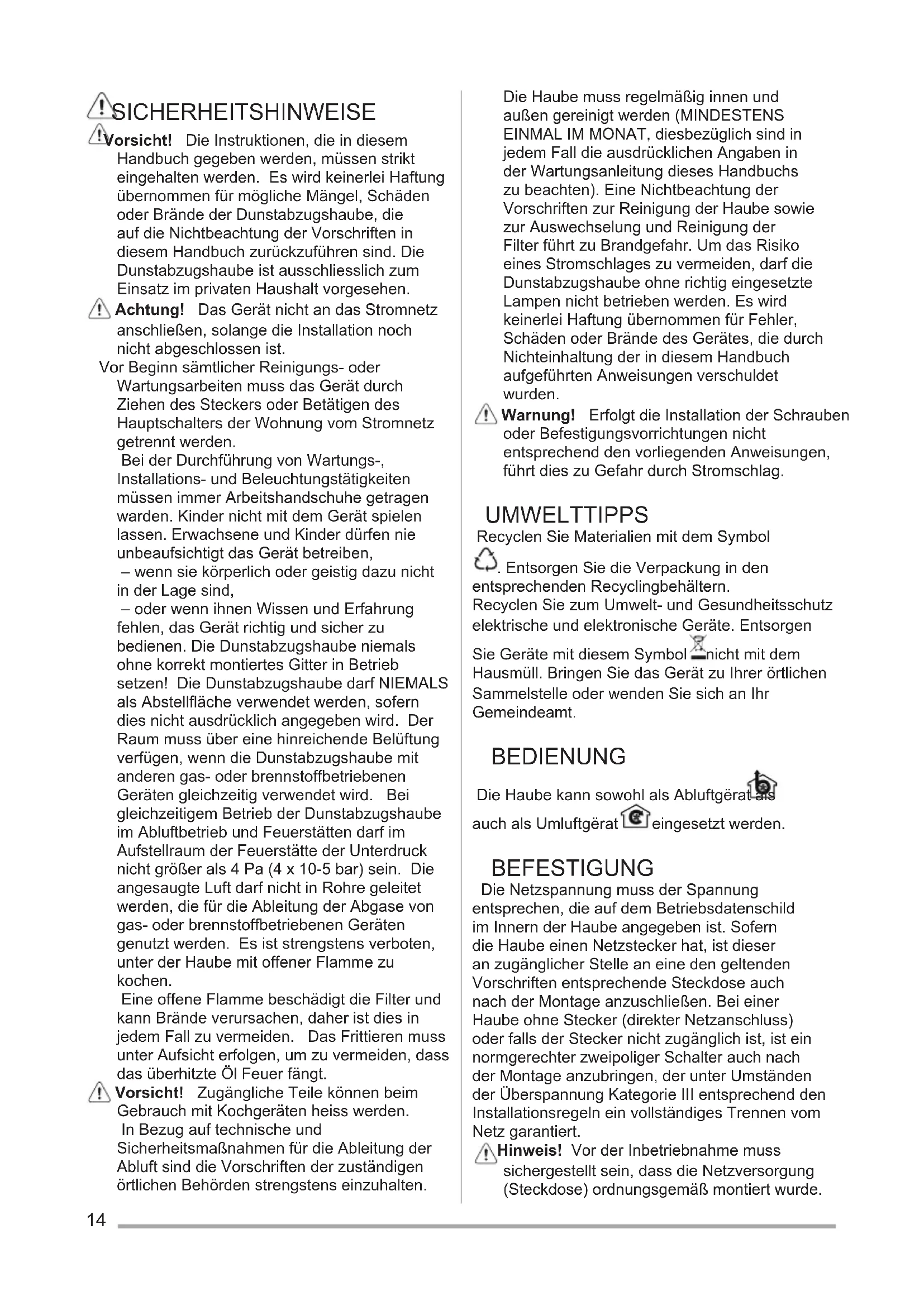 1 Button ON/OFF light 2 Button ON/OFF Timer: delayed switch-off of the selected suction speed (power): Suction speed (power) 1: 20 minutes Suction speed (power) 2: 15 minutes Suction speed (power) 3: 10 minutes Intensive suction speed (power): 5 minutes 3 Button OFF / Decrease of suction speed (power) 4 Button ON / Increase of suction speed (power) 5 Display, showing: a. Suction speed (power): LEDs L1 – L2 – L3 - L4 (flashing) light up according to the selected suction speed (power). Note: the L4 LED – intensive suction speed (power) works for about 5 minutes, then the hood sets the intermediate speed. b. Timer: the LED of the selected speed flashes to indicate that the timer is active. c. Grease filter saturation: the L3 and L4 LEDs flash alternately at short intervals of time. d. Activated charcoal filter saturation: the L3 and L4 LEDs flash simultaneously at short intervals of time. Reset of the filter saturation indicator: perform filter maintenance, then press button 2 until the LEDs turn off. Note: The activated charcoal filter saturation is normally disabled and is enabled only if the hood is used in the filtering version (with charcoal filter installed). In order to activate it, proceed as follows: - Switch off the hood - Keep pressed simultaneously buttons 3 and 4, until the LEDs L1 and L2 flash briefly. Repeat the operation to disable; only LED L1 flashes briefly. LIGHTING The hood is equipped with a lighting system based on LED technology. The LEDs guarantee an optimum lighting, a duration up to 10 times as long as the traditional lamps and allow to save 90% electrical energy. Caution! Do not look directly into the LED light. To replace lights, contact authorised spare part center.14 SICHERHEITSHINWEISE Vorsicht! Die Instruktionen, die in diesem Handbuch gegeben werden, müssen strikt eingehalten werden. Es wird keinerlei Haftung übernommen für mögliche Mängel, Schäden oder Brände der Dunstabzugshaube, die auf die Nichtbeachtung der Vorschriften in diesem Handbuch zurückzuführen sind. Die Dunstabzugshaube ist ausschliesslich zum Einsatz im privaten Haushalt vorgesehen. Achtung! Das Gerät nicht an das Stromnetz anschließen, solange die Installation noch nicht abgeschlossen ist. Vor Beginn sämtlicher Reinigungs- oder Wartungsarbeiten muss das Gerät durch Ziehen des Steckers oder Betätigen des Hauptschalters der Wohnung vom Stromnetz getrennt werden. Bei der Durchführung von Wartungs-, Installations- und Beleuchtungstätigkeiten müssen immer Arbeitshandschuhe getragen warden. Kinder nicht mit dem Gerät spielen lassen. Erwachsene und Kinder dürfen nie unbeaufsichtigt das Gerät betreiben, – wenn sie körperlich oder geistig dazu nicht in der Lage sind, – oder wenn ihnen Wissen und Erfahrung fehlen, das Gerät richtig und sicher zu bedienen. Die Dunstabzugshaube niemals ohne korrekt montiertes Gitter in Betrieb setzen! Die Dunstabzugshaube darf NIEMALS als Abstellfläche verwendet werden, sofern dies nicht ausdrücklich angegeben wird. Der Raum muss über eine hinreichende Belüftung verfügen, wenn die Dunstabzugshaube mit anderen gas- oder brennstoffbetriebenen Geräten gleichzeitig verwendet wird. Bei gleichzeitigem Betrieb der Dunstabzugshaube im Abluftbetrieb und Feuerstätten darf im Aufstellraum der Feuerstätte der Unterdruck nicht größer als 4 Pa (4 x 10-5 bar) sein. Die angesaugte Luft darf nicht in Rohre geleitet werden, die für die Ableitung der Abgase von gas- oder brennstoffbetriebenen Geräten genutzt werden. Es ist strengstens verboten, unter der Haube mit offener Flamme zu kochen. Eine offene Flamme beschädigt die Filter und kann Brände verursachen, daher ist dies in jedem Fall zu vermeiden. Das Frittieren muss unter Aufsicht erfolgen, um zu vermeiden, dass das überhitzte Öl Feuer fängt. Vorsicht! Zugängliche Teile können beim Gebrauch mit Kochgeräten heiss werden. In Bezug auf technische und Sicherheitsmaßnahmen für die Ableitung der Abluft sind die Vorschriften der zuständigen örtlichen Behörden strengstens einzuhalten. Die Haube muss regelmäßig innen und außen gereinigt werden (MINDESTENS EINMAL IM MONAT, diesbezüglich sind in jedem Fall die ausdrücklichen Angaben in der Wartungsanleitung dieses Handbuchs zu beachten). Eine Nichtbeachtung der Vorschriften zur Reinigung der Haube sowie zur Auswechselung und Reinigung der Filter führt zu Brandgefahr. Um das Risiko eines Stromschlages zu vermeiden, darf die Dunstabzugshaube ohne richtig eingesetzte Lampen nicht betrieben werden. Es wird keinerlei Haftung übernommen für Fehler, Schäden oder Brände des Gerätes, die durch Nichteinhaltung der in diesem Handbuch aufgeführten Anweisungen verschuldet wurden. Warnung! Erfolgt die Installation der Schrauben oder Befestigungsvorrichtungen nicht entsprechend den vorliegenden Anweisungen, führt dies zu Gefahr durch Stromschlag. UMWELTTIPPS Recyclen Sie Materialien mit dem Symbol . Entsorgen Sie die Verpackung in den entsprechenden Recyclingbehältern. Recyclen Sie zum Umwelt- und Gesundheitsschutz elektrische und elektronische Geräte. Entsorgen Sie Geräte mit diesem Symbol nicht mit dem Hausmüll. Bringen Sie das Gerät zu Ihrer örtlichen Sammelstelle oder wenden Sie sich an Ihr Gemeindeamt. BEDIENUNG Die Haube kann sowohl als Abluftgërat als auch als Umluftgërat eingesetzt werden. BEFESTIGUNG Die Netzspannung muss der Spannung entsprechen, die auf dem Betriebsdatenschild im Innern der Haube angegeben ist. Sofern die Haube einen Netzstecker hat, ist dieser an zugänglicher Stelle an eine den geltenden Vorschriften entsprechende Steckdose auch nach der Montage anzuschließen. Bei einer Haube ohne Stecker (direkter Netzanschluss) oder falls der Stecker nicht zugänglich ist, ist ein normgerechter zweipoliger Schalter auch nach der Montage anzubringen, der unter Umständen der Überspannung Kategorie III entsprechend den Installationsregeln ein vollständiges Trennen vom Netz garantiert. Hinweis! Vor der Inbetriebnahme 