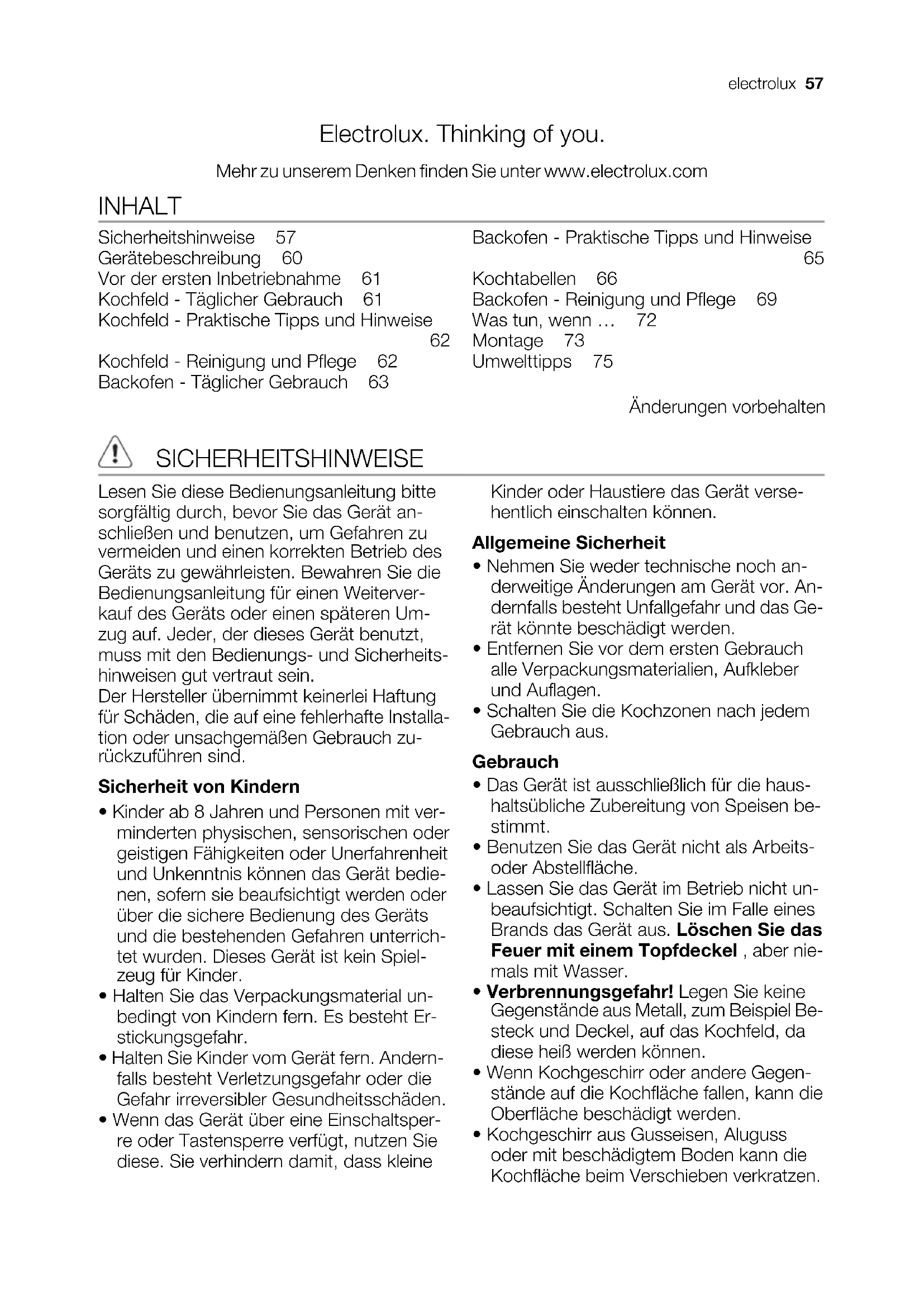 - Kochgeschirr aus Gusseisen, Aluguss oder mit beschädigtem Boden kann die Kochfläche beim Verschieben verkratzen. electrolux 57• Bei Sprüngen in der Oberfläche des Koch- felds schalten Sie die Stromversorgung aus, um einen Stromschlag zu vermeiden.
