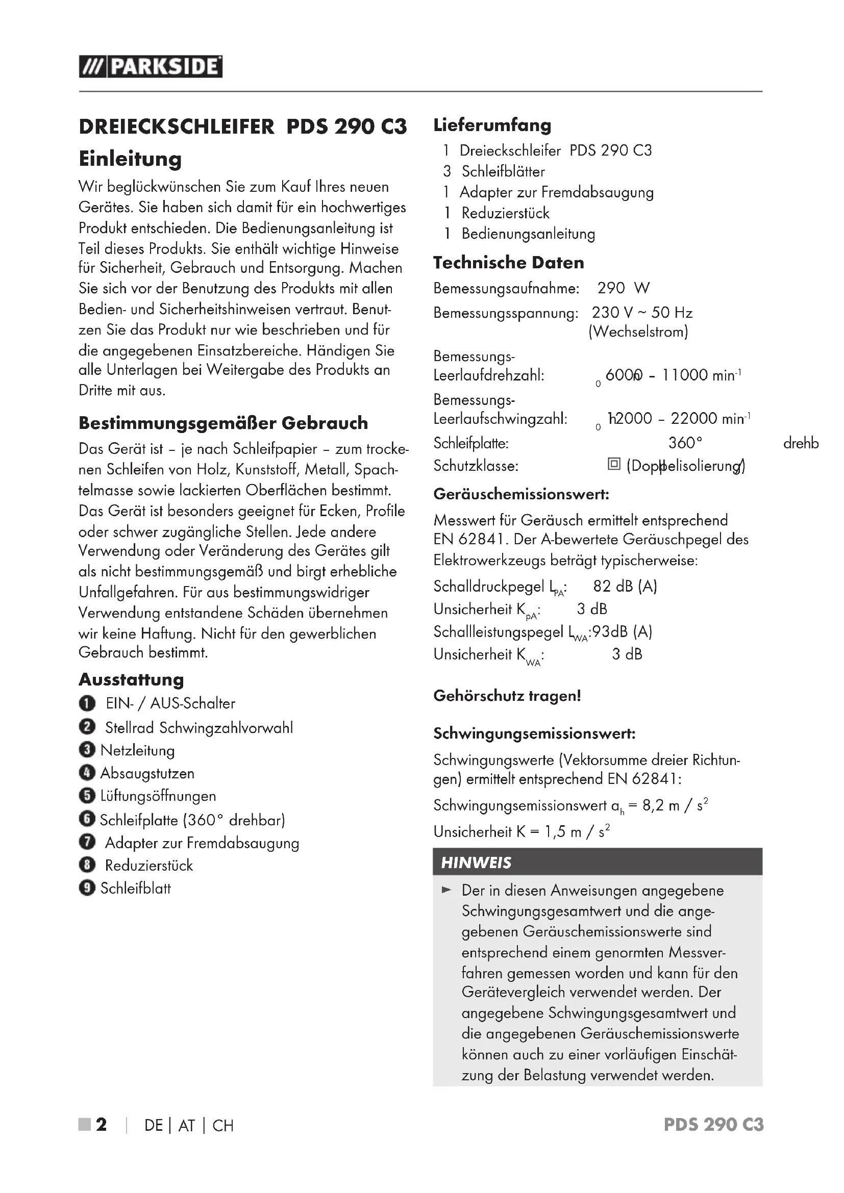 Einleitung Wir beglückwünschen Sie zum Kauf Ihres neuen Gerätes. Sie haben sich damit für ein hochwertiges Produkt entschieden. Die Bedienungsanleitung ist Teil dieses Produkts. Sie enthält wichtige Hinweise für Sicherheit, Gebrauch und Entsorgung. Machen Sie sich vor der Benutzung des Produkts mit allen Bedien- und Sicherheitshinweisen vertraut. Benut- zen Sie das Produkt nur wie beschrieben und für die angegebenen Einsatzbereiche. Händigen Sie alle Unterlagen bei Weitergabe des Produkts an Dritte mit aus. Bestimmungsgemäßer Gebrauch Das Gerät ist – je nach Schleifpapier – zum trocke- nen Schleifen von Holz, Kunststoff, Metall, Spach- telmasse sowie lackierten Oberflächen bestimmt. Das Gerät ist besonders geeignet für Ecken, Profile oder schwer zugängliche Stellen. Jede andere Verwendung oder Veränderung des Gerätes gilt als nicht bestimmungsgemäß und birgt erhebliche Unfallgefahren. Für aus bestimmungswidriger Verwendung entstandene Schäden übernehmen wir keine Haftung. Nicht für den gewerblichen Gebrauch bestimmt. Ausstattung EIN- / AUS-Schalter Stellrad Schwingzahlvorwahl Netzleitung Absaugstutzen Lüftungsöffnungen Schleifplatte (360° drehbar) Adapter zur Fremdabsaugung Reduzierstück Schleifblatt Lieferumfang 1 Dreieckschleifer PDS 290 C3 3 Schleifblätter 1 Adapter zur Fremdabsaugung 1 Reduzierstück 1 Bedienungsanleitung Technische Daten Bemessungsaufnahme: 290 W Bemessungsspannung: 230 V ∼ 50 Hz (Wechselstrom) Bemessungs- Leerlaufdrehzahl: n