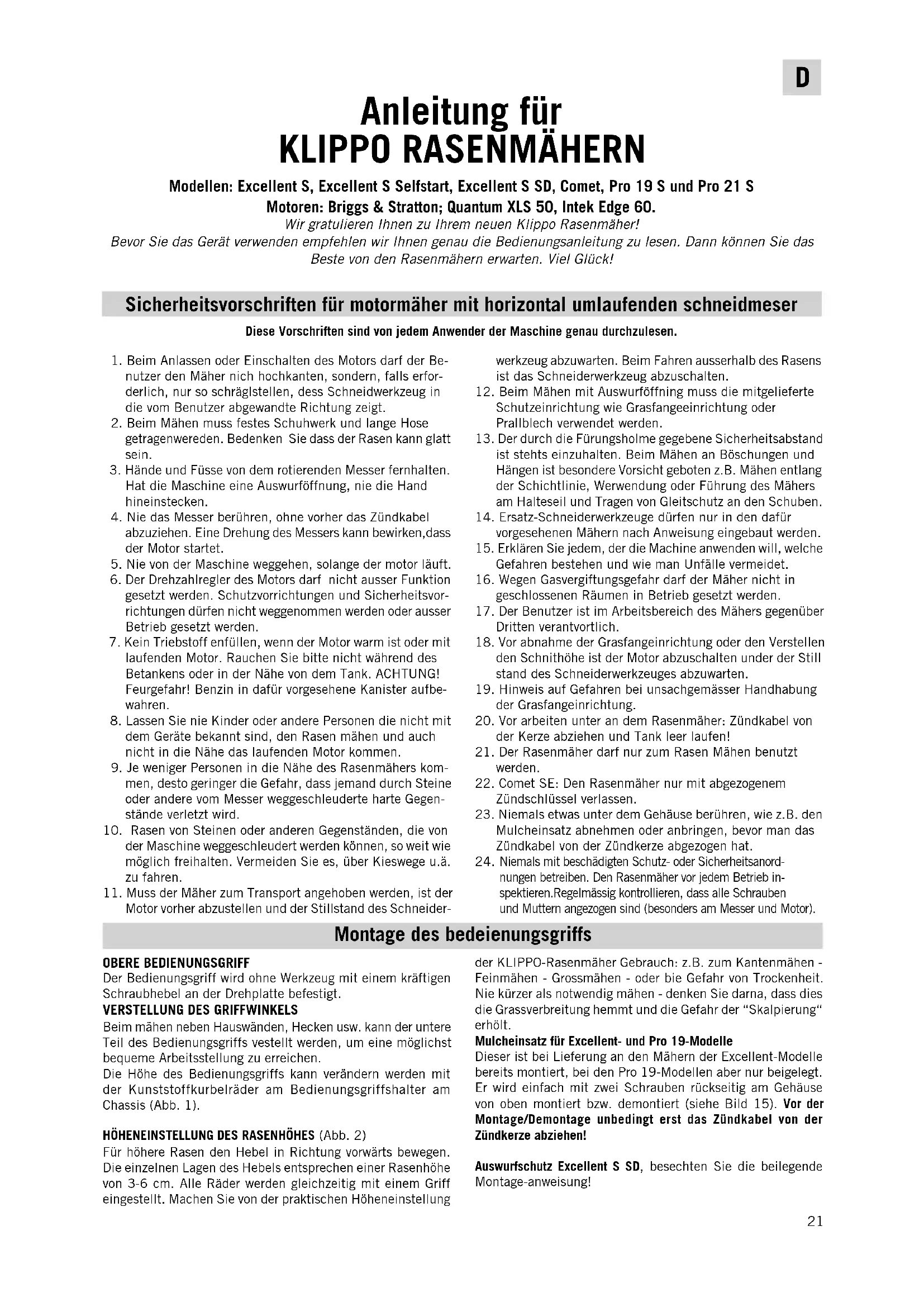 Modellen: Excellent S, Excellent S Selfstart, Excellent S SD, Comet, Pro 19 S und Pro 21 S Motoren: Briggs & Stratton; Quantum XLS 50, Intek Edge 60. Wir gratulieren Ihnen zu Ihrem neuen Klippo Rasenmäher! Bevor Sie das Gerät verwenden empfehlen wir Ihnen genau die Bedienungsanleitung zu lesen. Dann können Sie das Beste von den Rasenmähern erwarten. Viel Glück! Sicherheitsvorschriften für motormäher mit horizontal umlaufenden schneidmeser 1. Beim Anlassen oder Einschalten des Motors darf der Be-nutzer den Mäher nich hochkanten, sondern, falls erfor-derlich, nur so schräglstellen, dess Schneidwerkzeug indie vom Benutzer abgewandte Richtung zeigt. 2. Beim Mähen muss festes Schuhwerk und lange Hosegetragenwereden. Bedenken Sie dass der Rasen kann glattsein. 3. Hände und Füsse von dem rotierenden Messer fernhalten.Hat die Maschine eine Auswurföffnung, nie die Handhineinstecken. 4. Nie das Messer berühren, ohne vorher das Zündkabelabzuziehen. Eine Drehung des Messers kann bewirken,dassder Motor startet. 5. Nie von der Maschine weggehen, solange der motor läuft. 6. Der Drehzahlregler des Motors darf nicht ausser Funktiongesetzt werden. Schutzvorrichtungen und Sicherheitsvor-richtungen dürfen nicht weggenommen werden oder ausserBetrieb gesetzt werden. 7. Kein Triebstoff enfüllen, wenn der Motor warm ist oder mitlaufenden Motor. Rauchen Sie bitte nicht während desBetankens oder in der Nähe von dem Tank. ACHTUNG!Feurgefahr! Benzin in dafür vorgesehene Kanister aufbe-wahren. 8. Lassen Sie nie Kinder oder andere Personen die nicht mitdem Geräte bekannt sind, den Rasen mähen und auchnicht in die Nähe das laufenden Motor kommen. 9. Je weniger Personen in die Nähe des Rasenmähers kom-men, desto geringer die Gefahr, dass jemand durch Steineoder andere vom Messer weggeschleuderte harte Gegen-stände verletzt wird.10. Rasen von Steinen oder anderen Gegenständen, die vonder Maschine weggeschleudert werden können, so weit wiemöglich freihalten. Vermeiden Sie es, über Kieswege u.ä.zu fahren.11. Muss der Mäher zum Transport angehoben werden, ist derMotor vorher abzustellen und der Stillstand des Schneider-Diese Vorschriften sind von jedem Anwender der Maschine genau durchzulesen.werkzeug abzuwarten. Beim Fahren ausserhalb des Rasensist das Schneiderwerkzeug abzuschalten.12. Beim Mähen mit Auswurföffning muss die mitgelieferteSchutzeinrichtung wie Grasfangeeinrichtung oderPrallblech verwendet werden.13. Der durch die Fürungsholme gegebene Sicherheitsabstandist stehts einzuhalten. Beim Mähen an Böschungen undHängen ist besondere Vorsicht geboten z.B. Mähen entlangder Schichtlinie, Werwendung oder Führung des Mähersam Halteseil und Tragen von Gleitschutz an den Schuben.14. Ersatz-Schneiderwerkzeuge dürfen nur in den dafürvorgesehenen Mähern nach Anweisung eingebaut werden.15. Erklären Sie jedem, der die Machine anwenden will, welcheGefahren bestehen und wie man Unfälle vermeidet.16. Wegen Gasvergiftungsgefahr darf der Mäher nicht ingeschlossenen Räumen in Betrieb gesetzt werden.17. Der Benutzer ist im Arbeitsbereich des Mähers gegenüberDritten verantvortlich.18. Vor abnahme der Grasfangeinrichtung oder den Verstellenden Schnithöhe ist der Motor abzuschalten under der Stillstand des Schneiderwerkzeuges abzuwarten.19. Hinweis auf Gefahren bei unsachgemässer Handhabungder Grasfangeinrichtung.20. Vor arbeiten unter an dem Rasenmäher: Zündkabel vonder Kerze abziehen und Tank leer laufen!21. Der Rasenmäher darf nur zum Rasen Mähen benutztwerden.22. Comet SE: Den Rasenmäher nur mit abgezogenemZündschlüssel verlassen.23. Niemals etwas unter dem Gehäuse berühren, wie z.B. denMulcheinsatz abnehmen oder anbringen, bevor man dasZündkabel von der Zündkerze abgezogen hat. Niemals mit beschädigten Schutz- oder Sicherheitsanord-nungen betreiben. Den Rasenmäher vor jedem Betrieb in-spektieren.Regelmässig kontrollieren, dass alle Schraubenund Muttern angezogen sind (besonders am Messer und Motor). Montage des bedeienungsgriffs