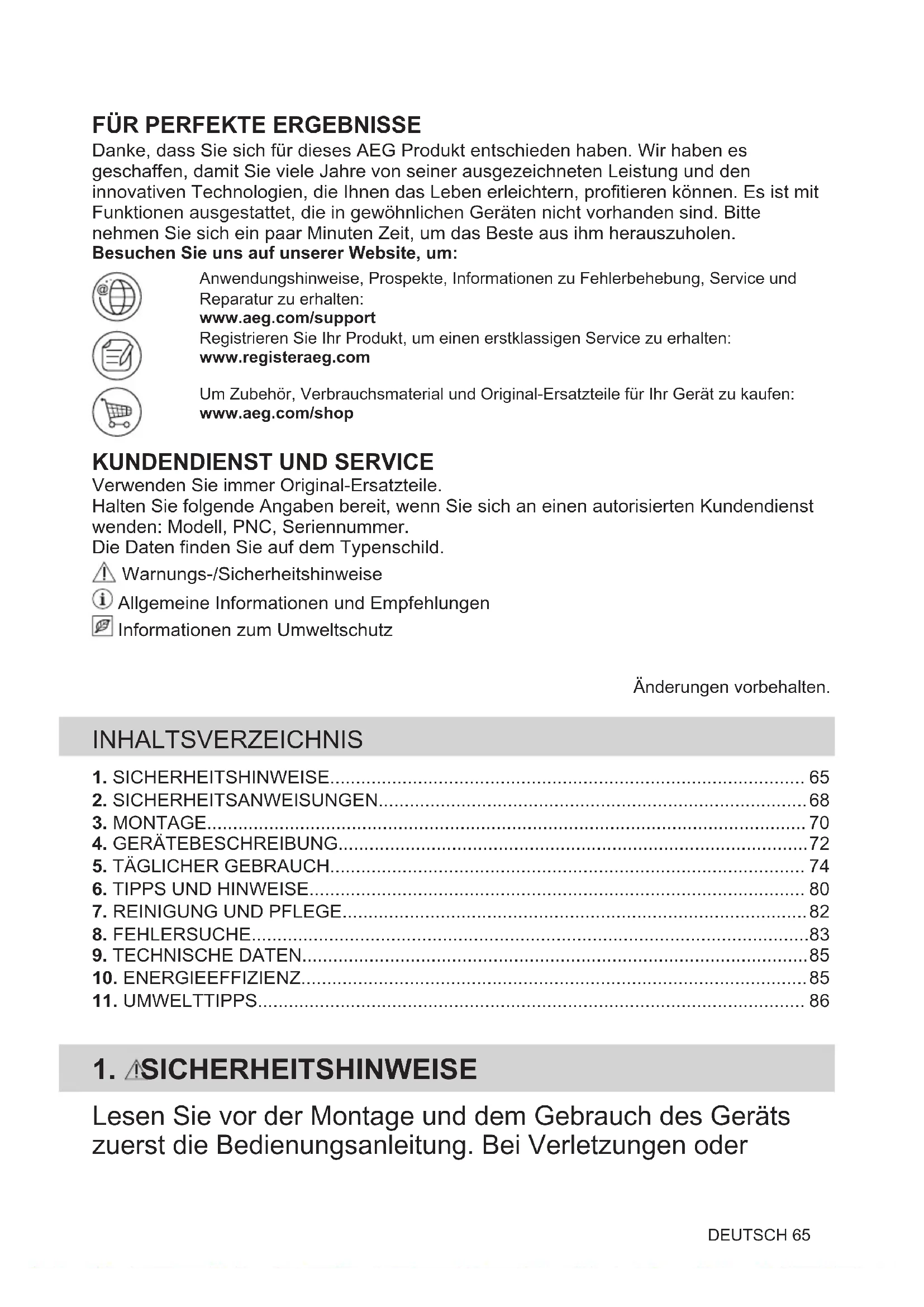 Danke, dass Sie sich für dieses AEG Produkt entschieden haben. Wir haben es geschaffen, damit Sie viele Jahre von seiner ausgezeichneten Leistung und den innovativen Technologien, die Ihnen das Leben erleichtern, profitieren können. Es ist mit Funktionen ausgestattet, die in gewöhnlichen Geräten nicht vorhanden sind. Bitte nehmen Sie sich ein paar Minuten Zeit, um das Beste aus ihm herauszuholen. Besuchen Sie uns auf unserer Website, um:Anwendungshinweise, Prospekte, Informationen zu Fehlerbehebung, Service undReparatur zu erhalten:www.aeg.com/supportRegistrieren Sie Ihr Produkt, um einen erstklassigen Service zu erhalten:www.registeraeg.comUm Zubehör, Verbrauchsmaterial und Original-Ersatzteile für Ihr Gerät zu kaufen:www.aeg.com/shop