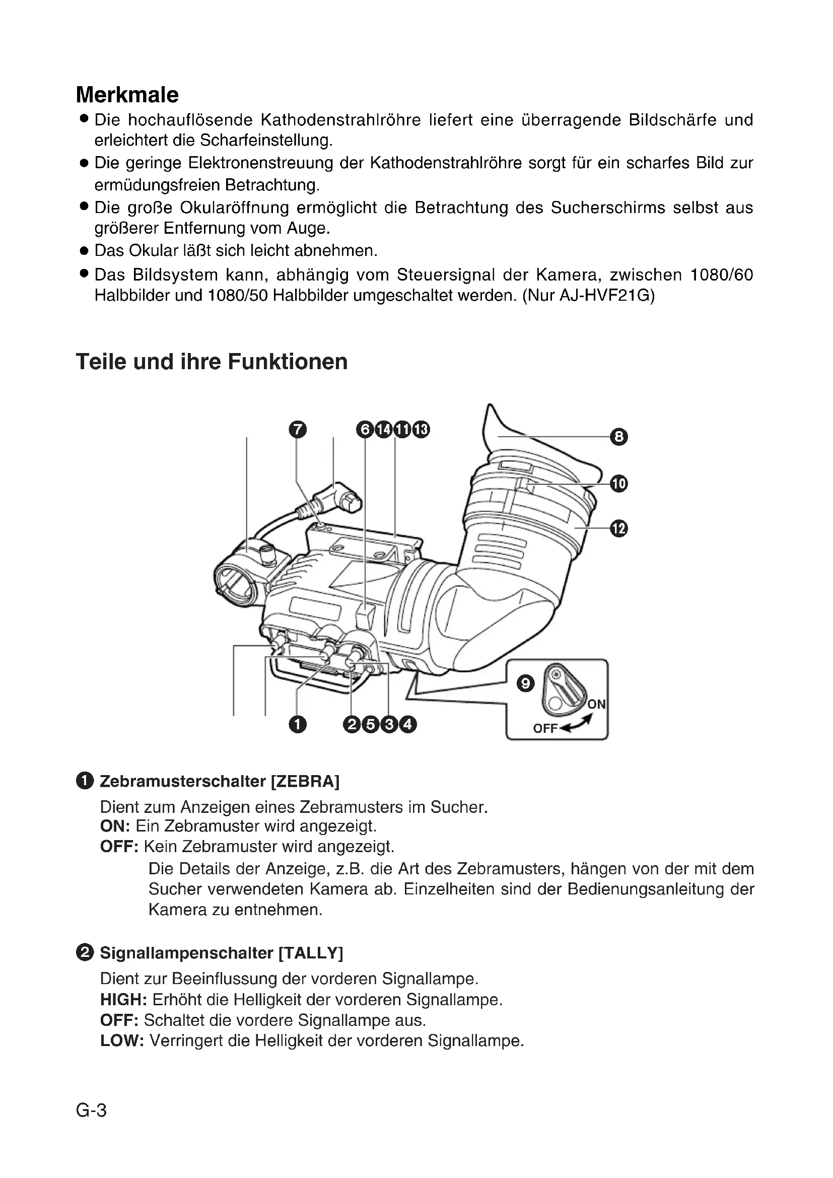 - UM BRAND- ODER STROMSCHLAGGEFAHR ZU REDUZIEREN, MUSS DIESES GERÄT VON ALLEN FLÜSSIGKEITEN FERNGEHALTEN WERDEN. VERMEIDEN SIE GEBRAUCH UND LAGERUNG DES GERÄTES AN ORTEN, AN DENEN DIE GEFAHR BESTEHT, DASS ES MIT FLÜSSIGKEITEN BETROPFT ODER BESPRITZT WIRD, UND STELLEN SIE KEINE FLÜSSIGKEITSBEHÄLTER AUF DAS GERÄT. 02.21G/27G独(16)06.3.2713:49ページ1G-2 DEUTSCH Inhalt Merkmale . . . . . . . . . . . . . . . . . . . . . . . . . . . . . . . . . . . . . . . . . . . . . . . . . . . . . . . . . . . . . 3 Teile und ihre Funktionen . . . . . . . . . . . . . . . . . . . . . . . . . . . . . . . . . . . . . . . . . . . . . . . . 3 Für Kameras, die mit der Standard-Gleitschiene kompatibel sind . . . . . . . . . . . . . . . 6 Anbringen des Suchers . . . . . . . . . . . . . . . . . . . . . . . . . . . . . . . . . . . . . . . . . . . . . . . . . 6 Einstellen der Querposition des Suchers . . . . . . . . . . . . . . . . . . . . . . . . . . . . . . . . . . . 7 Einstellen der Längsposition des Suchers . . . . . . . . . . . . . . . . . . . . . . . . . . . . . . . . . . 7 Abnehmen des Suchers . . . . . . . . . . . . . . . . . . . . . . . . . . . . . . . . . . . . . . . . . . . . . . . . 8 Für Kameras, die mit der Montageeinheit kompatibel sind . . . . . . . . . . . . . . . . . . . . . 9 Anbringen des Suchers . . . . . . . . . . . . . . . . . . . . . . . . . . . . . . . . . . . . . . . . . . . . . . . . 10 Abnehmen des Suchers . . . . . . . . . . . . . . . . . . . . . . . . . . . . . . . . . . . . . . . . . . . . . . . 10 Positionseinstellung . . . . . . . . . . . . . . . . . . . . . . . . . . . . . . . . . . . . . . . . . . . . . . . . . . 11 Dioptrieneinstellung . . . . . . . . . . . . . . . . . . . . . . . . . . . . . . . . . . . . . . . . . . . . . . . . . . . 12 Sucherschirmeinstellung . . . . . . . . . . . . . . . . . . . . . . . . . . . . . . . . . . . . . . . . . . . . . . . 12 Abnehmen des Okulars . . . . . . . . . . . . . . . . . . . . . . . . . . . . . . . . . . . . . . . . . . . . . . . . 13 Anbringen des Mikrofons . . . . . . . . . . . . . . . . . . . . . . . . . . . . . . . . . . . . . . . . . . . . . . . 14 Technische Daten . . . . . . . . . . . . . . . . . . . . . . . . . . . . . . . . . . . . . . . . . . . . . . . . . . . . . 15 02.21G/27G独(16)06.3.2713:49ページ2G-3 Teile und ihre Funktionen Dient zum Anzeigen eines Zebramusters im Sucher. ON: Ein Zebramuster wird angezeigt. OFF: Kein Zebramuster wird angezeigt. Die Details der Anzeige, z.B. die Art des Zebramusters, hängen von der mit dem Sucher verwendeten Kamera ab. Einzelheiten sind der Bedienungsanleitung der Kamera zu entnehmen. Zebramusterschalter [ZEBRA]
