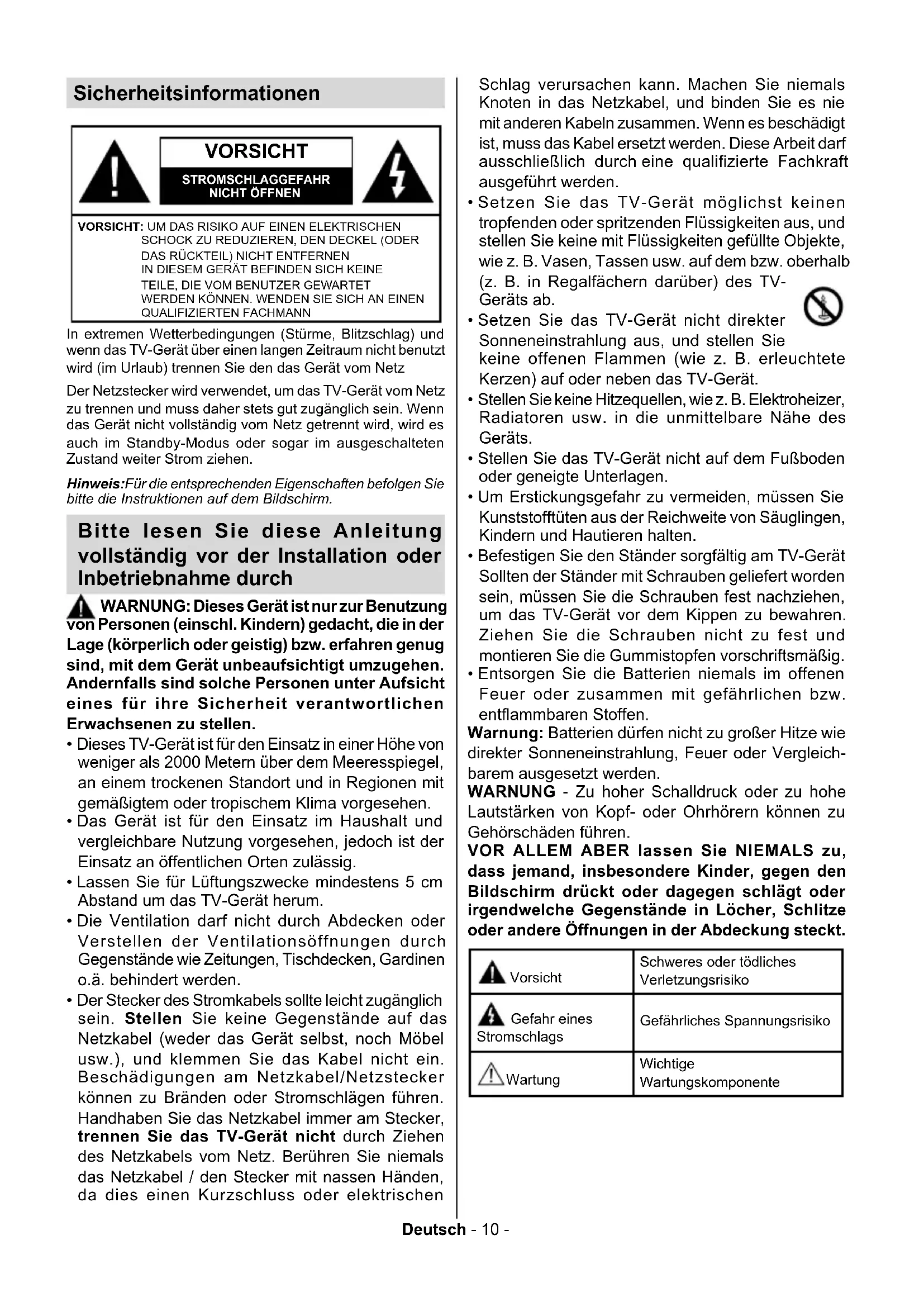 Spezikationen des drahtloses LAN-Transmitters (WLAN)** .............................................................. 16Deutsch - 10 - Sicherheitsinformationen VORSICHT STROMSCHLAGGEFAHR NICHT ÖFFNEN VORSICHT: UM DAS RISIKO AUF EINEN ELEKTRISCHEN SCHOCK ZU REDUZIEREN, DEN DECKEL (ODER DAS RÜCKTEIL) NICHT ENTFERNEN IN DIESEM GERÄT BEFINDEN SICH KEINE TEILE, DIE VOM BENUTZER GEWARTET WERDEN KÖNNEN. WENDEN SIE SICH AN EINEN QUALIFIZIERTEN FACHMANN Hinweis:Für die entsprechenden Eigenschaften befolgen Sie bitte die Instruktionen auf dem Bildschirm. In extremen Wetterbedingungen (Stürme, Blitzschlag) und wenn das TV-Gerät über einen langen Zeitraum nicht benutzt wird (im Urlaub) trennen Sie den das Gerät vom Netz Der Netzstecker wird verwendet, um das TV-Gerät vom Netz zu trennen und muss daher stets gut zugänglich sein. Wenn das Gerät nicht vollständig vom Netz getrennt wird, wird es auch im Standby-Modus oder sogar im ausgeschalteten Zustand weiter Strom ziehen. Bitte lesen Sie diese Anleitung vollständig vor der Installation oder Inbetriebnahme durch WARNUNG: Dieses Gerät ist nur zur Benutzung von Personen (einschl. Kindern) gedacht, die in der Lage (körperlich oder geistig) bzw. erfahren genug sind, mit dem Gerät unbeaufsichtigt umzugehen. Andernfalls sind solche Personen unter Aufsicht eines für ihre Sicherheit verantwortlichen Erwachsenen zu stellen.
