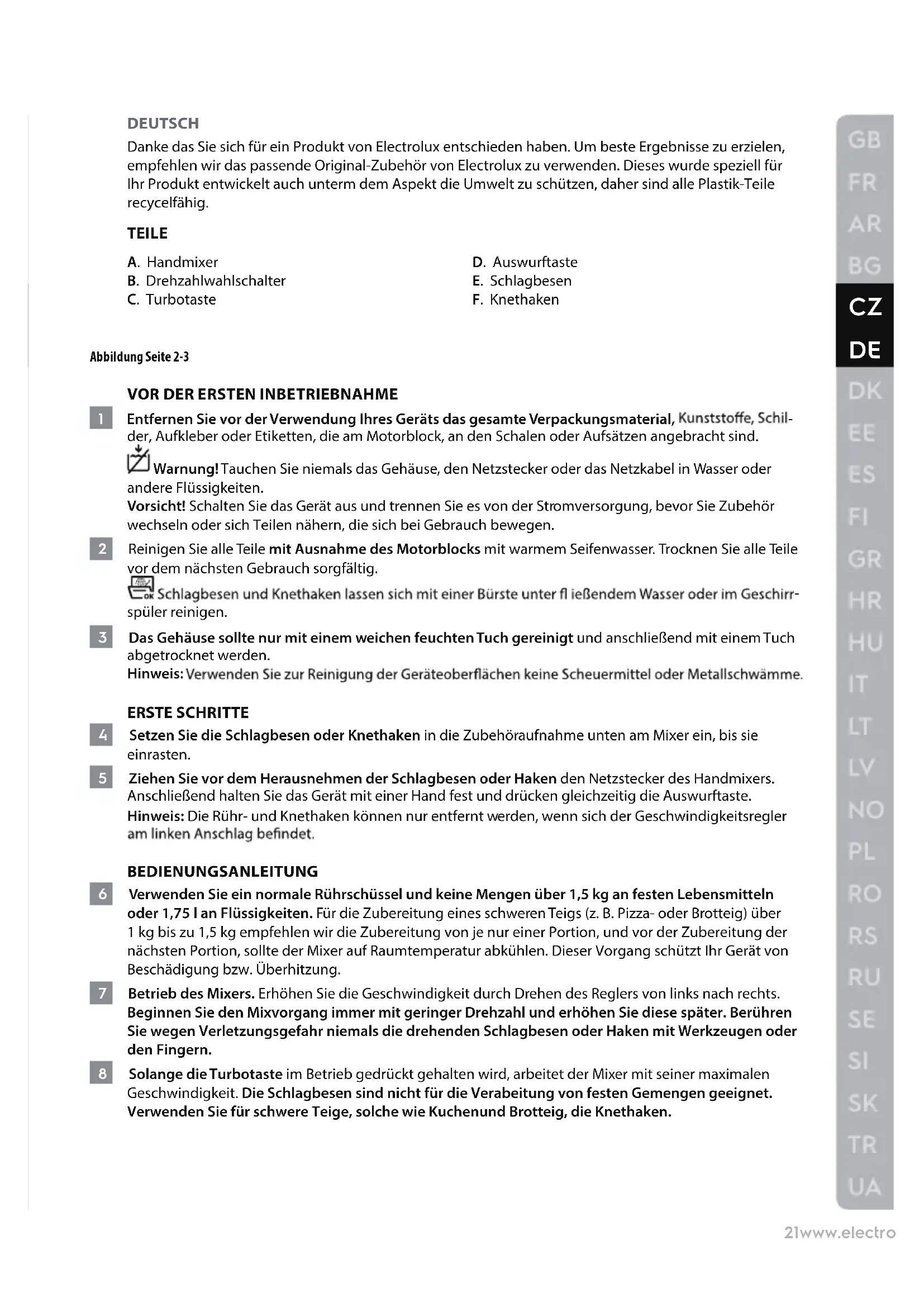 DEUTSCH Danke das Sie sich für ein Produkt von Electrolux entschieden haben. Um beste Ergebnisse zu erzielen, empfehlen wir das passende Original-Zubehör von Electrolux zu verwenden. Dieses wurde speziell für Ihr Produkt entwickelt auch unterm dem Aspekt die Umwelt zu schützen, daher sind alle Plastik-Teile recycelfähig. TEILE A. Handmixer B. Drehzahlwahlschalter C. Turbotaste D. Auswurftaste E. Schlagbesen F. Knethaken Abbildung Seite 2-3