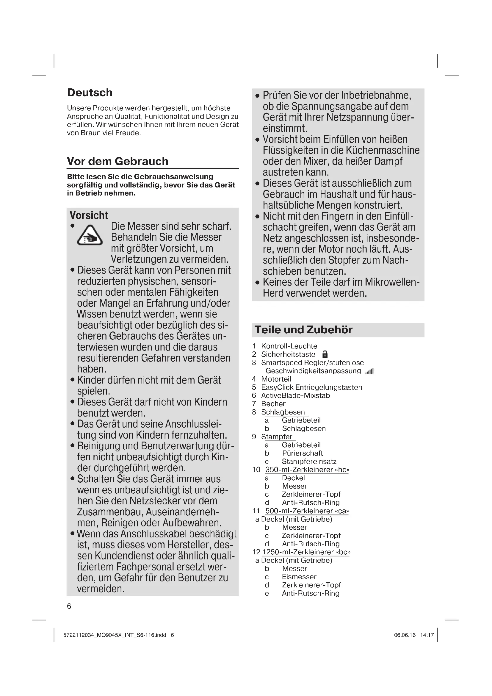 350 ml 500 ml 1250 ml 5722112034_MQ9045X_INT_S5.indd 15722112034_MQ9045X_INT_S5.indd 1 31.05.16 13:1431.05.16 13:146 Deutsch Unsere Produkte werden hergestellt, um höchste Ansprüche an Qualität, Funktionalität und Design zu erfüllen. Wir wünschen Ihnen mit Ihrem neuen Gerät von Braun viel Freude. Vor dem Gebrauch Bitte lesen Sie die Gebrauchsanweisung sorgfältig und vollständig, bevor Sie das Gerät in Betrieb nehmen. Vorsicht